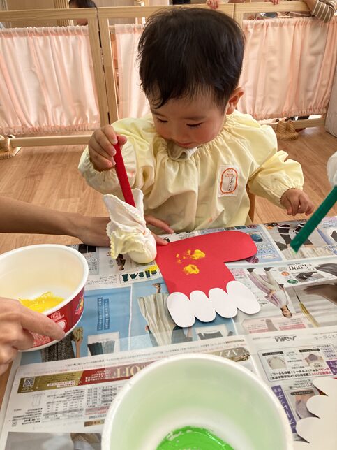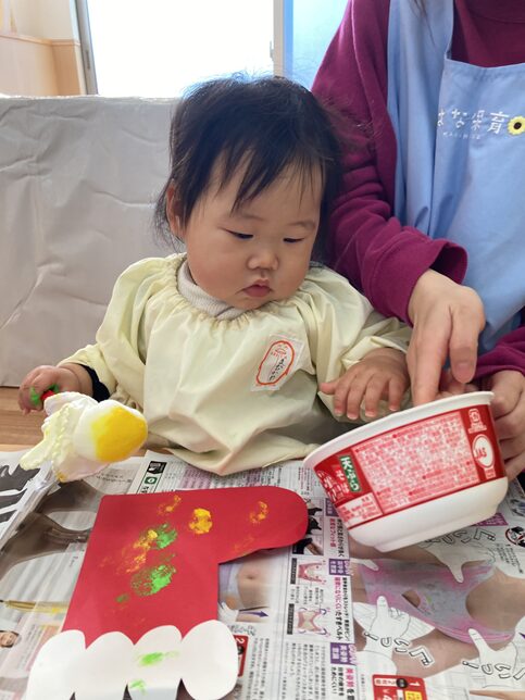 2025.12.19 カテゴリ未選択奈良県まがりかわ もうすぐクリスマス♪ はな保育室まがりかわです もうすぐクリスマスですね🎄 もうすぐクリスマスということで、さくら組さんもクリスマス制作を楽しみました🎄💗 サンタさんのブーツに絵の具をつけたタンポでポンポン ポンポン叩き色を付けることを楽しんだり、 絵の具を触って感触を楽しんでいました クリスマス制作の後は、クレパスでお絵描きも楽しみました! クレパスをお友だちに渡してあげる優しい姿もみられましたよ💗 さくら組さんの飾りは玄関に飾っているので、 また見てあげてくださいね💗