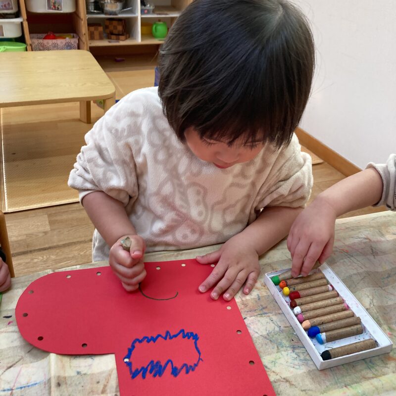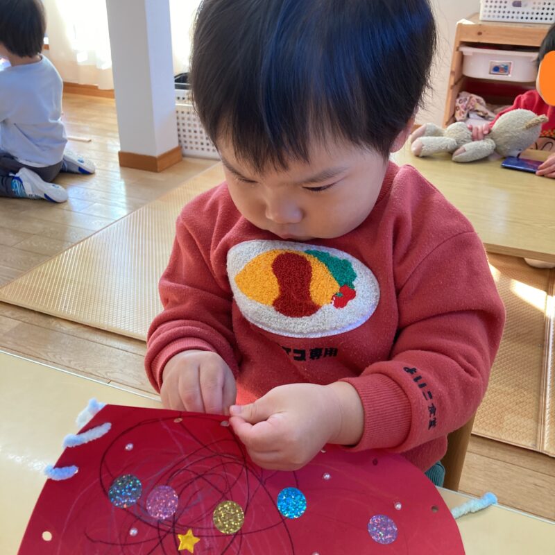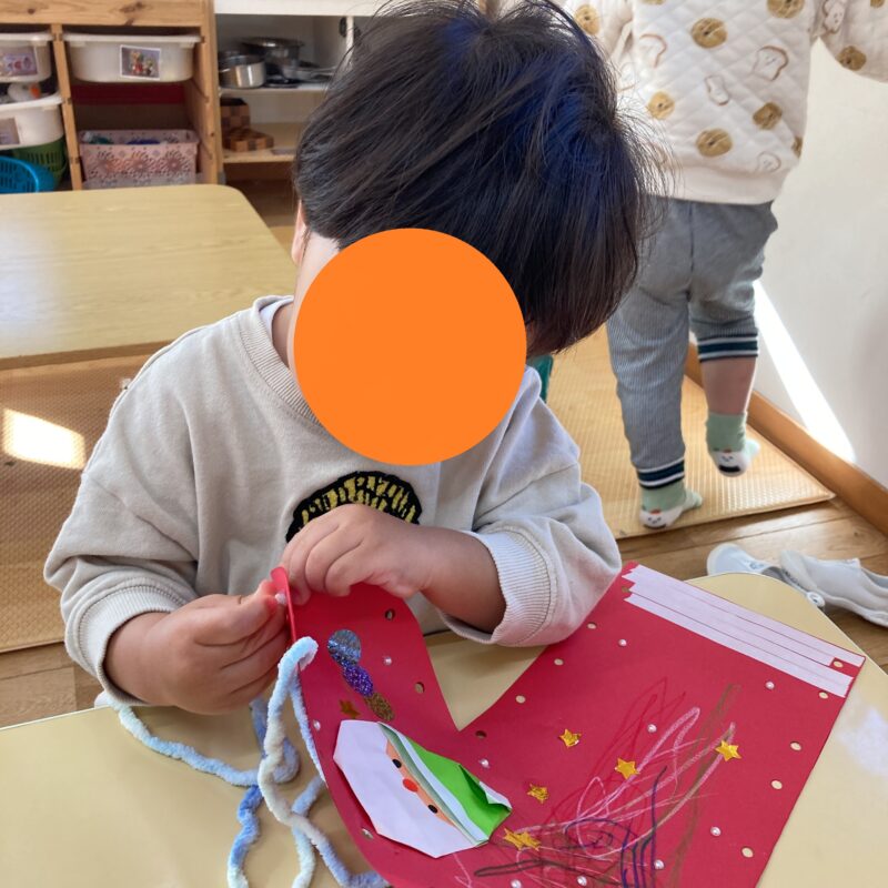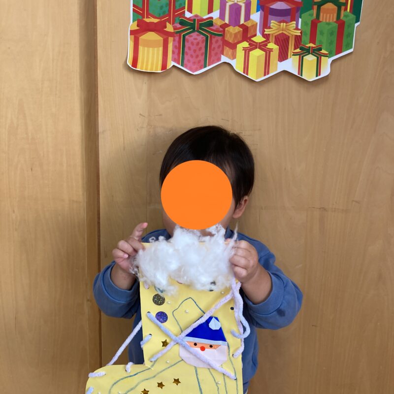クリスマスに向けて大きな靴下の製作を行いました。靴下の形をした画用紙に絵を描いたりシールを貼ったり綿をつけたり、自信を持って取り組む姿が見られました。