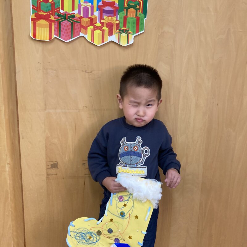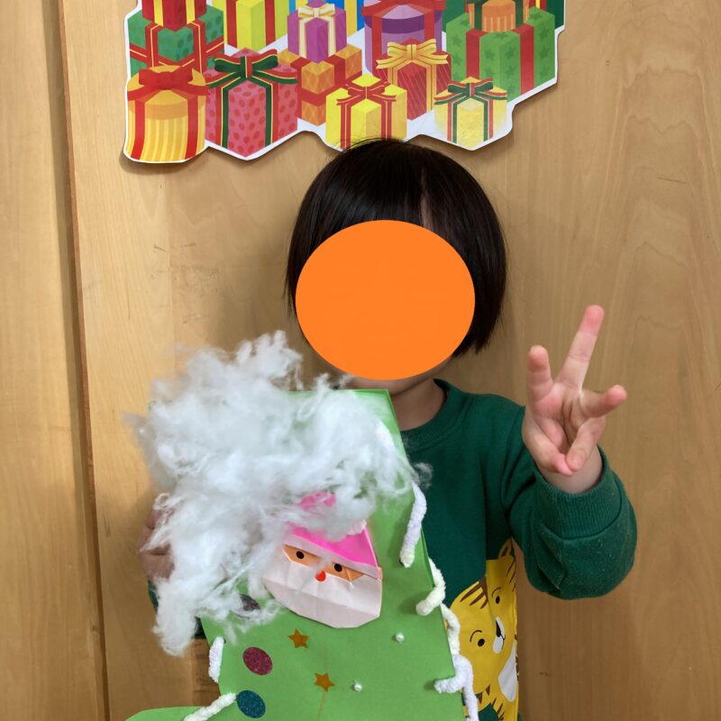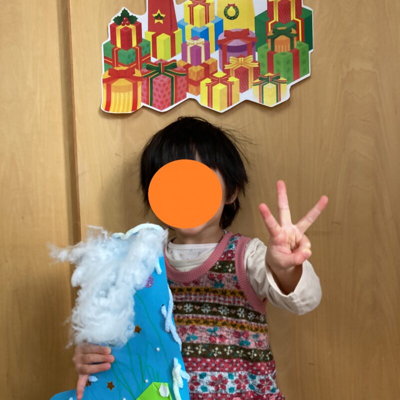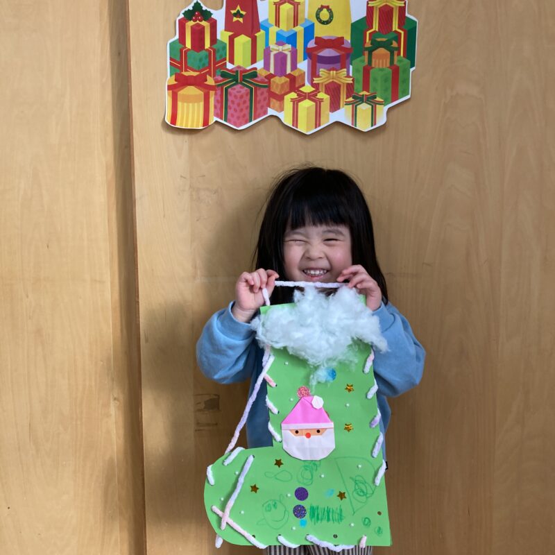 完成した靴下を手にすると、達成感いっぱいの表情をみせる子どもたち。「プレゼントいれるんだ!」と言ってお部屋にあるプレゼントの下でパシャリ!![]()