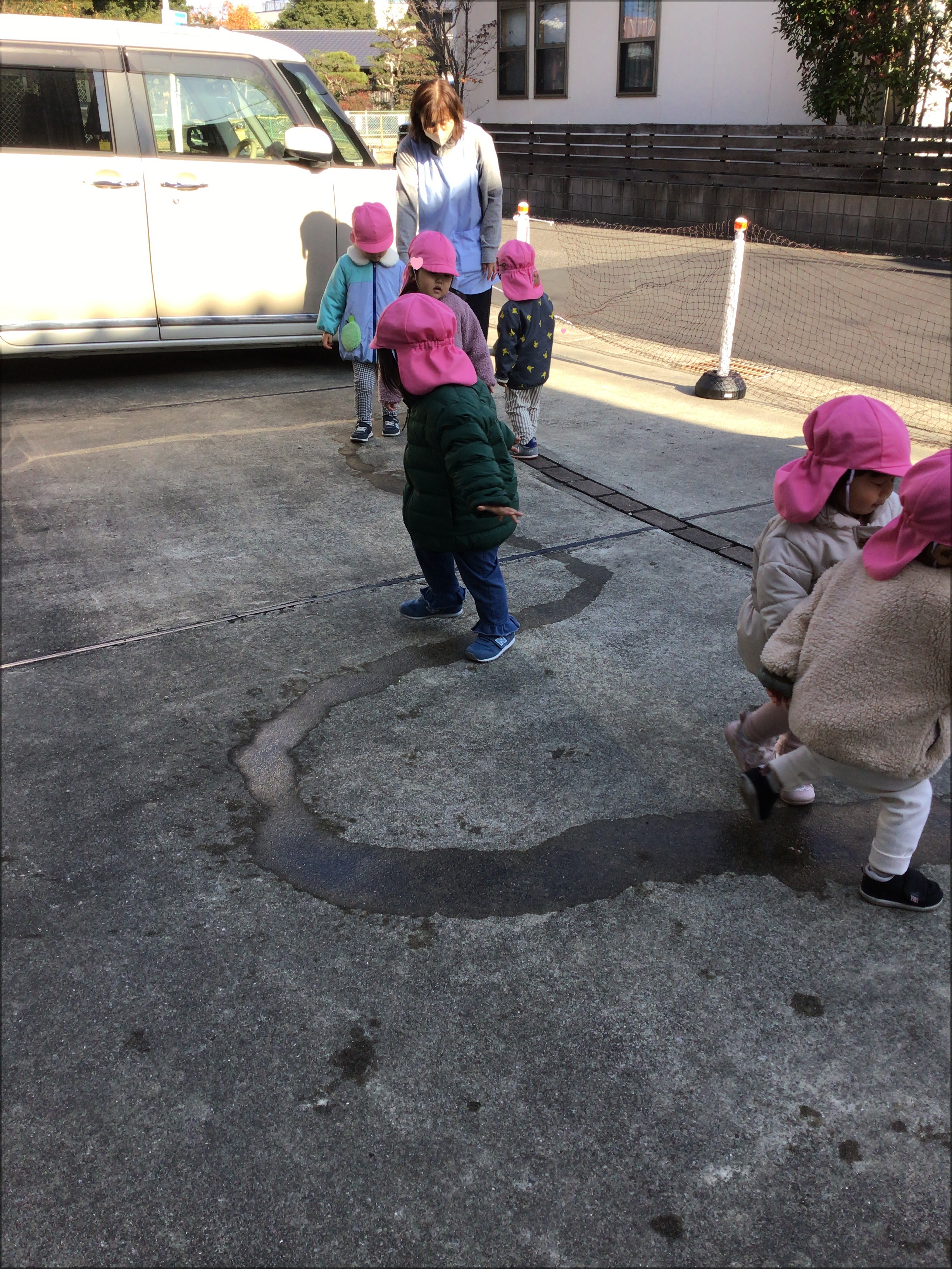 埋め込みのレンガの上を平均台のように歩いたり、ジョーロの水で道を作ると声をかけなくても続々と並んでいくこどもたち!