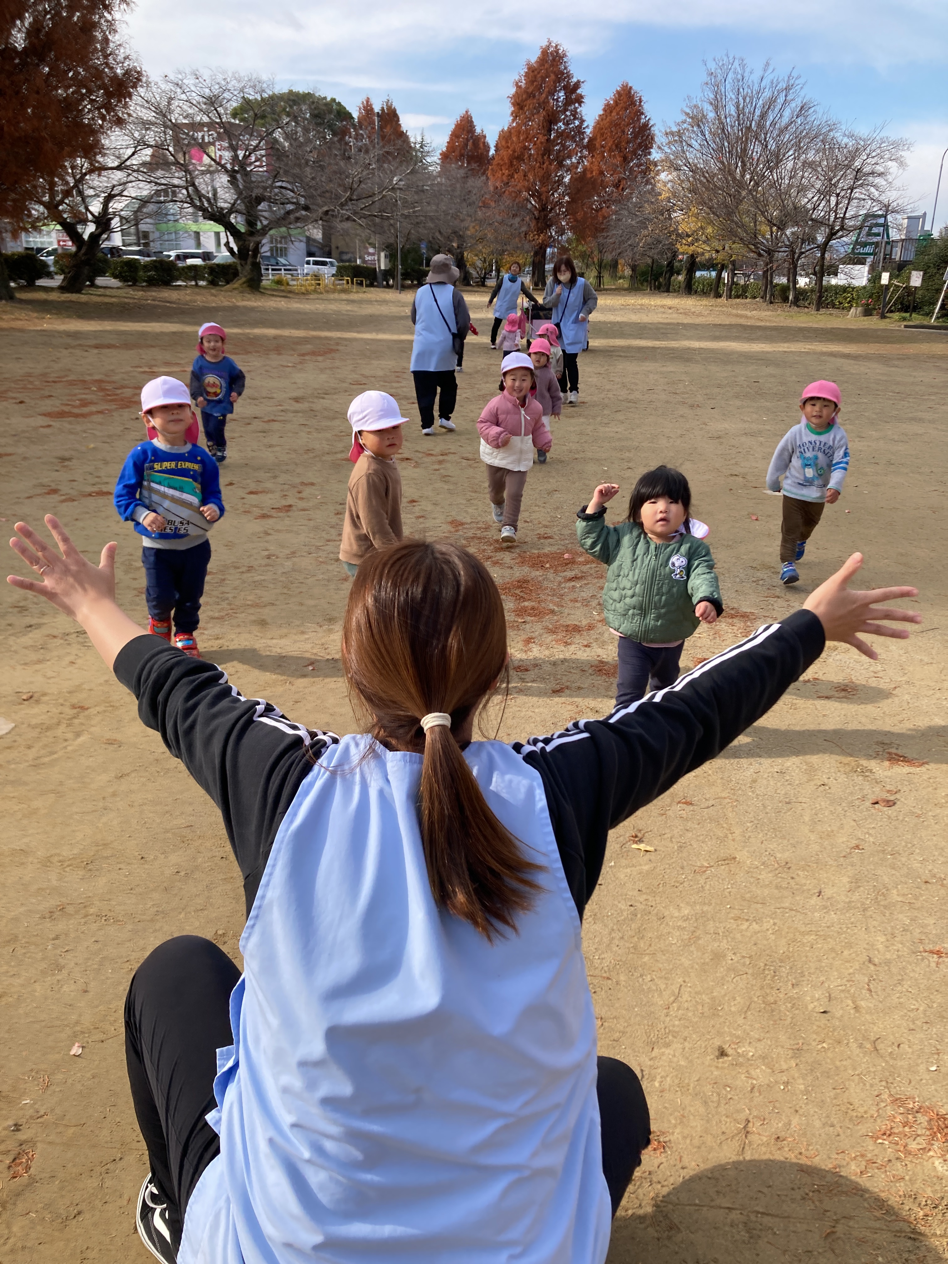 線に並んで『よーいドン!』前方に立っている先生にタッチして戻ってこれるかな?(先生も真剣走りです