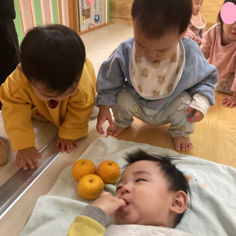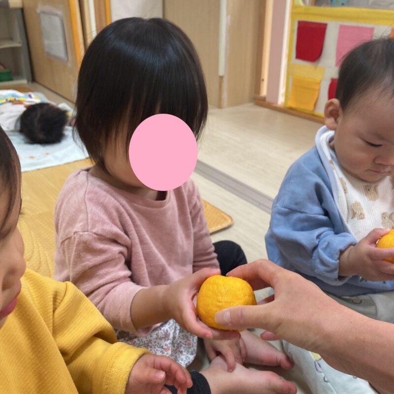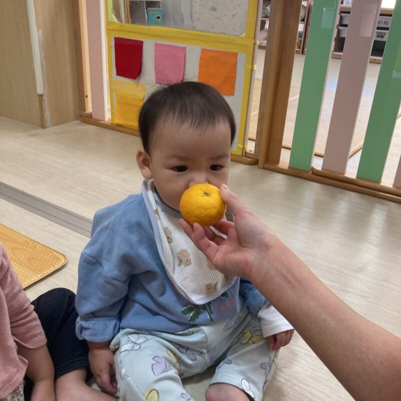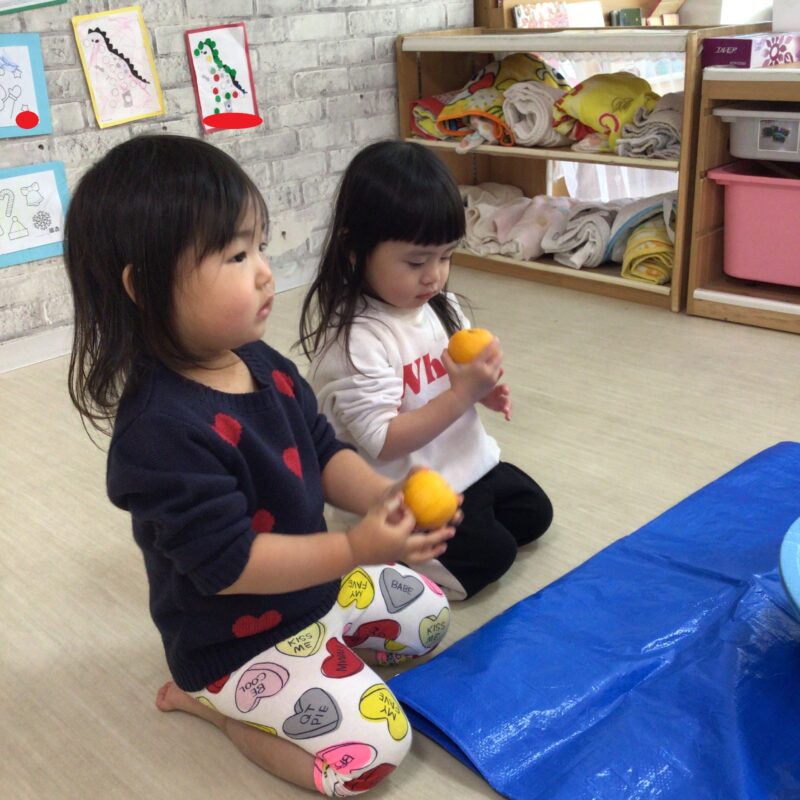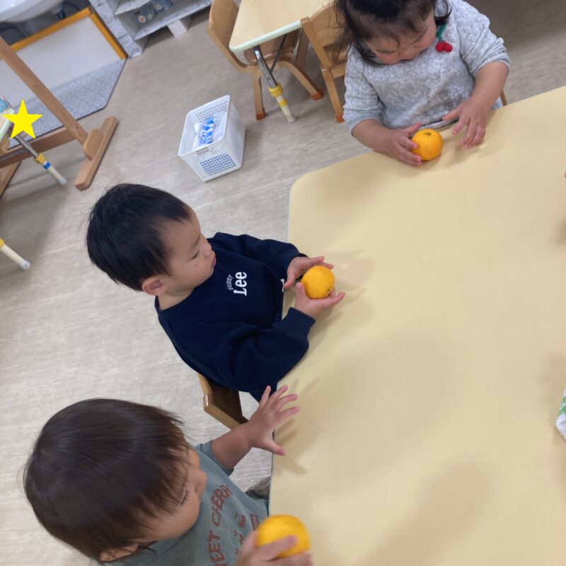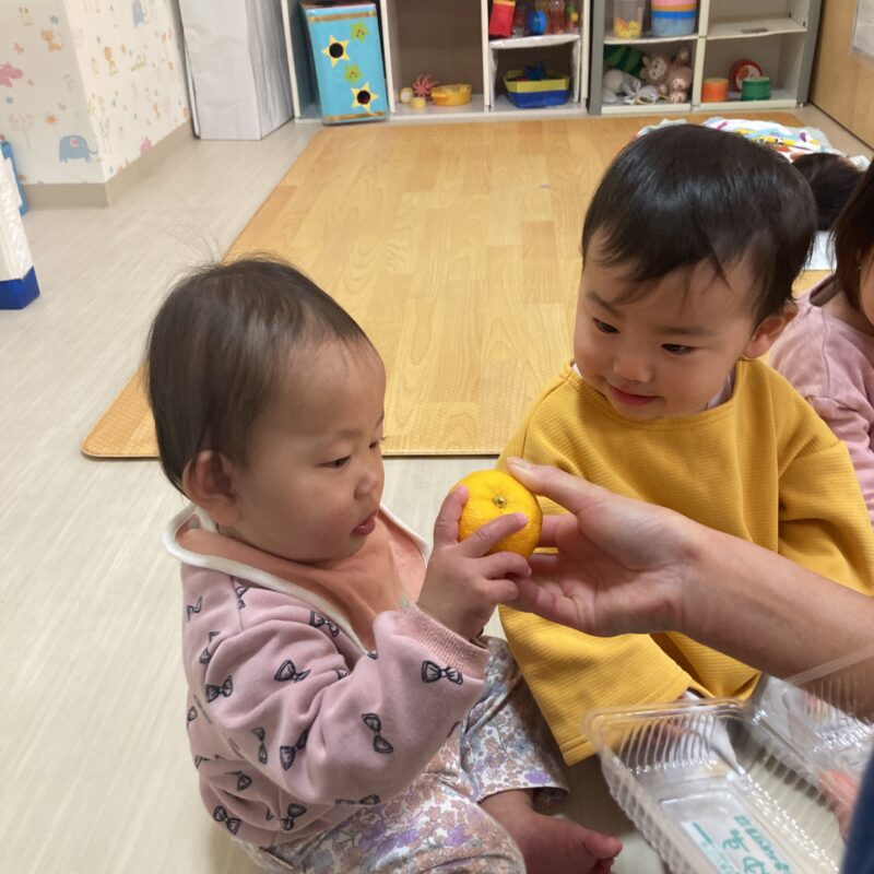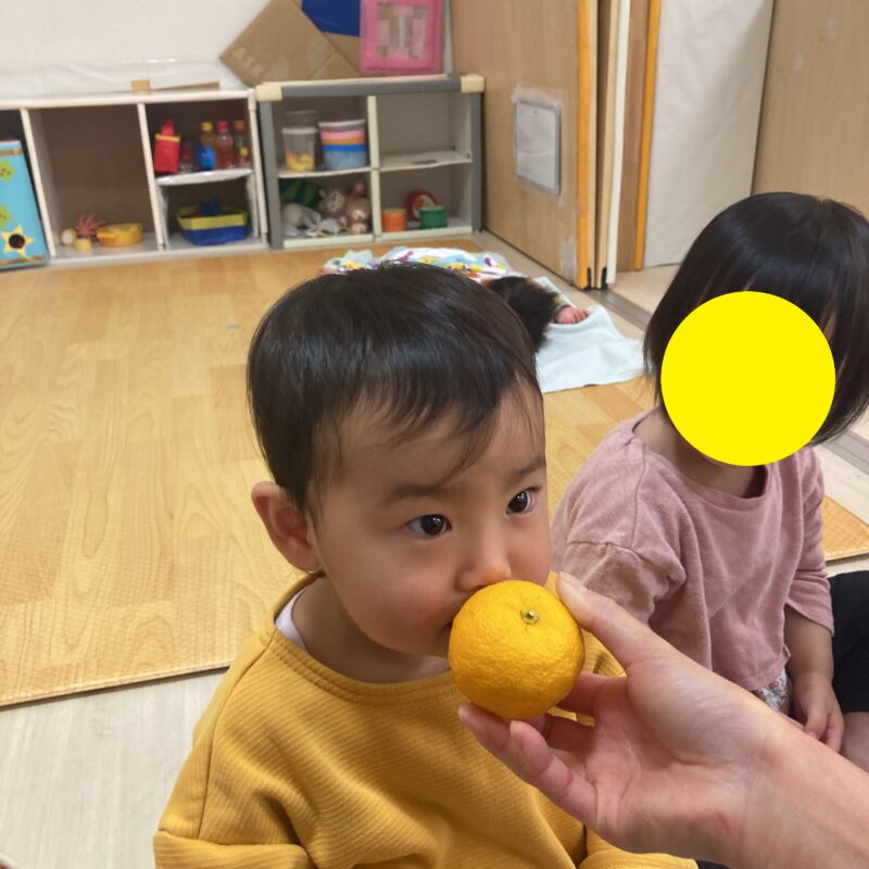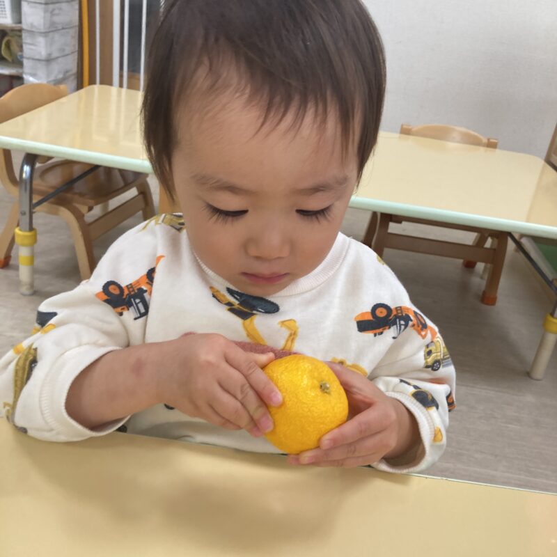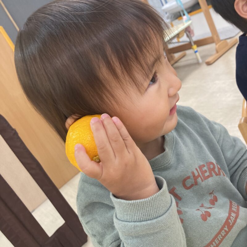 その後手渡すと食べようとする子や、「みかん!」と言って皮を剥こうとする子、何か聞こえるかな?と音を聞く姿も見られました。