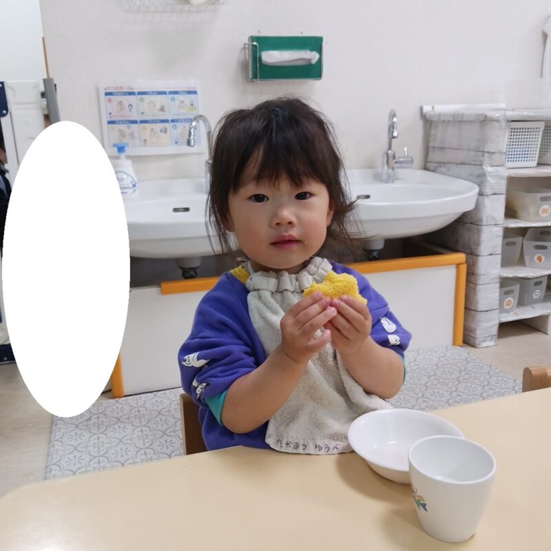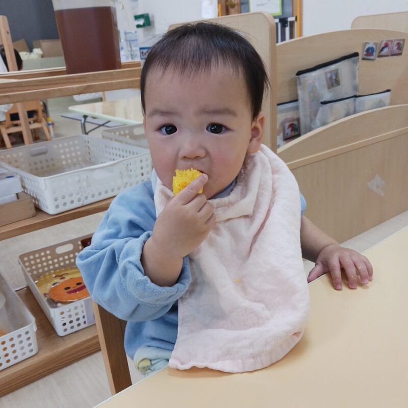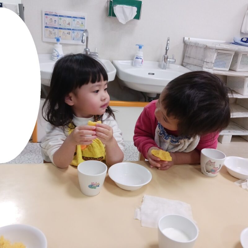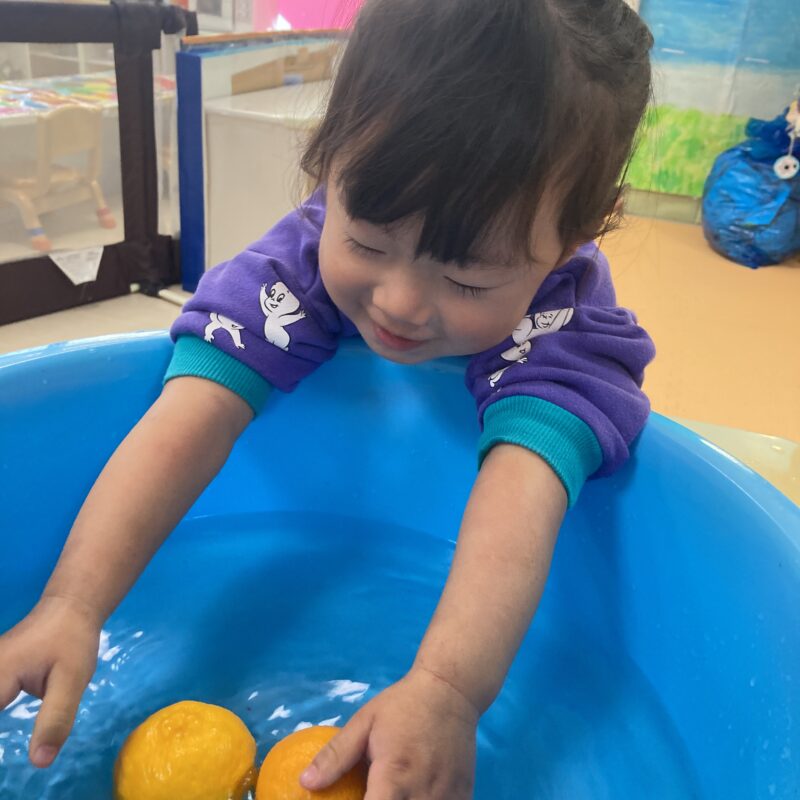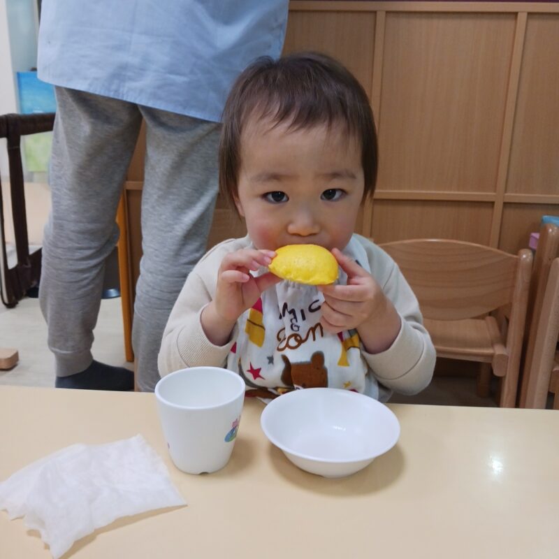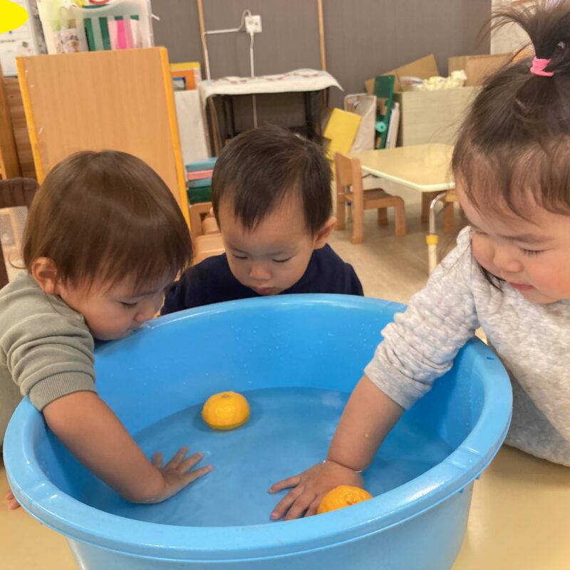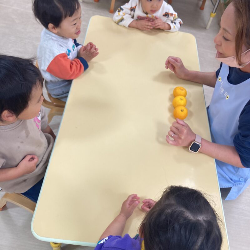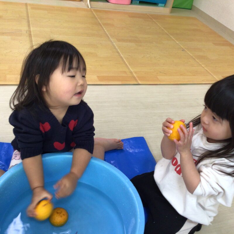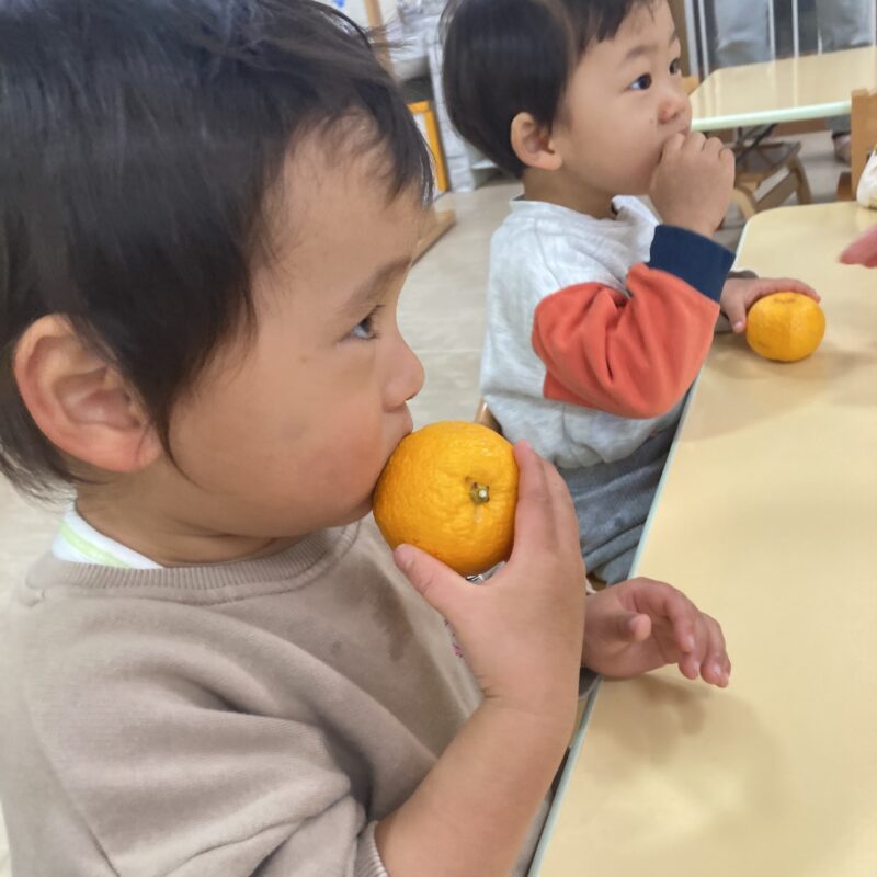 その後手渡すと食べようとする子や、「みかん!」と言って皮を剥こうとする子、何か聞こえるかな?と音を聞く姿も見られました。