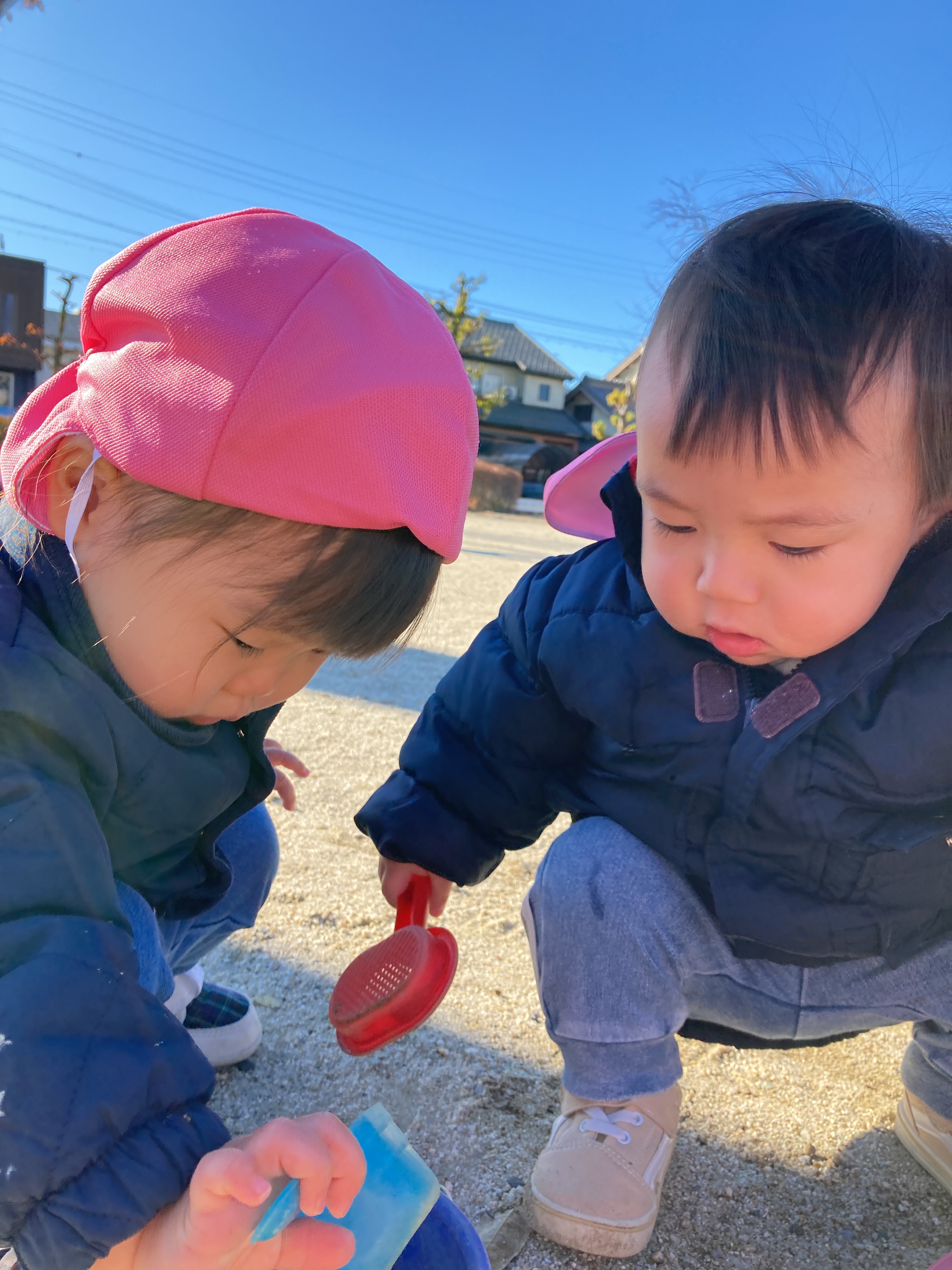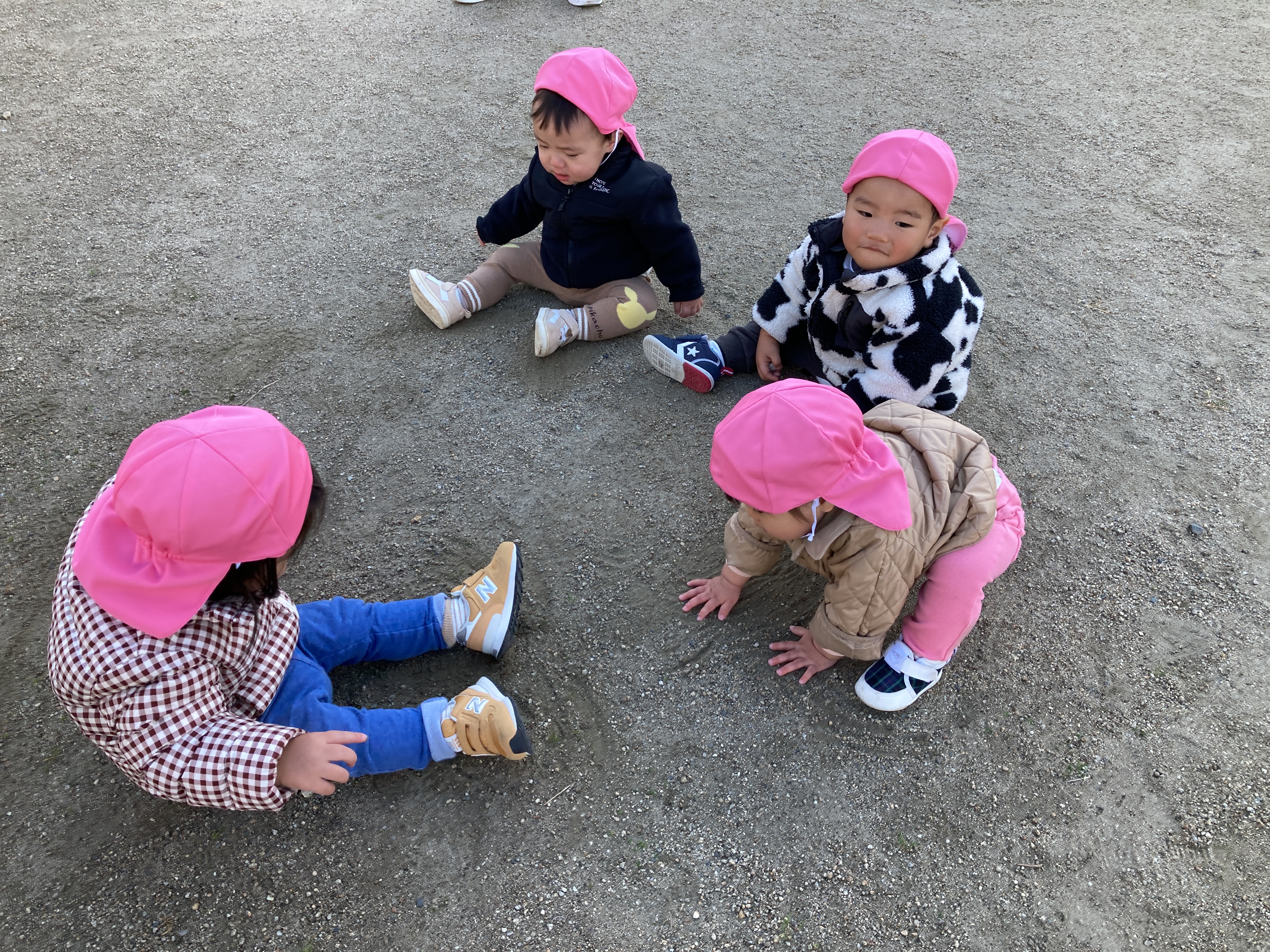砂の感触や落ち葉や石などを拾い集めて、「せんせー♪見て~」と目をキラキラさせて見せに来てくれます![]()