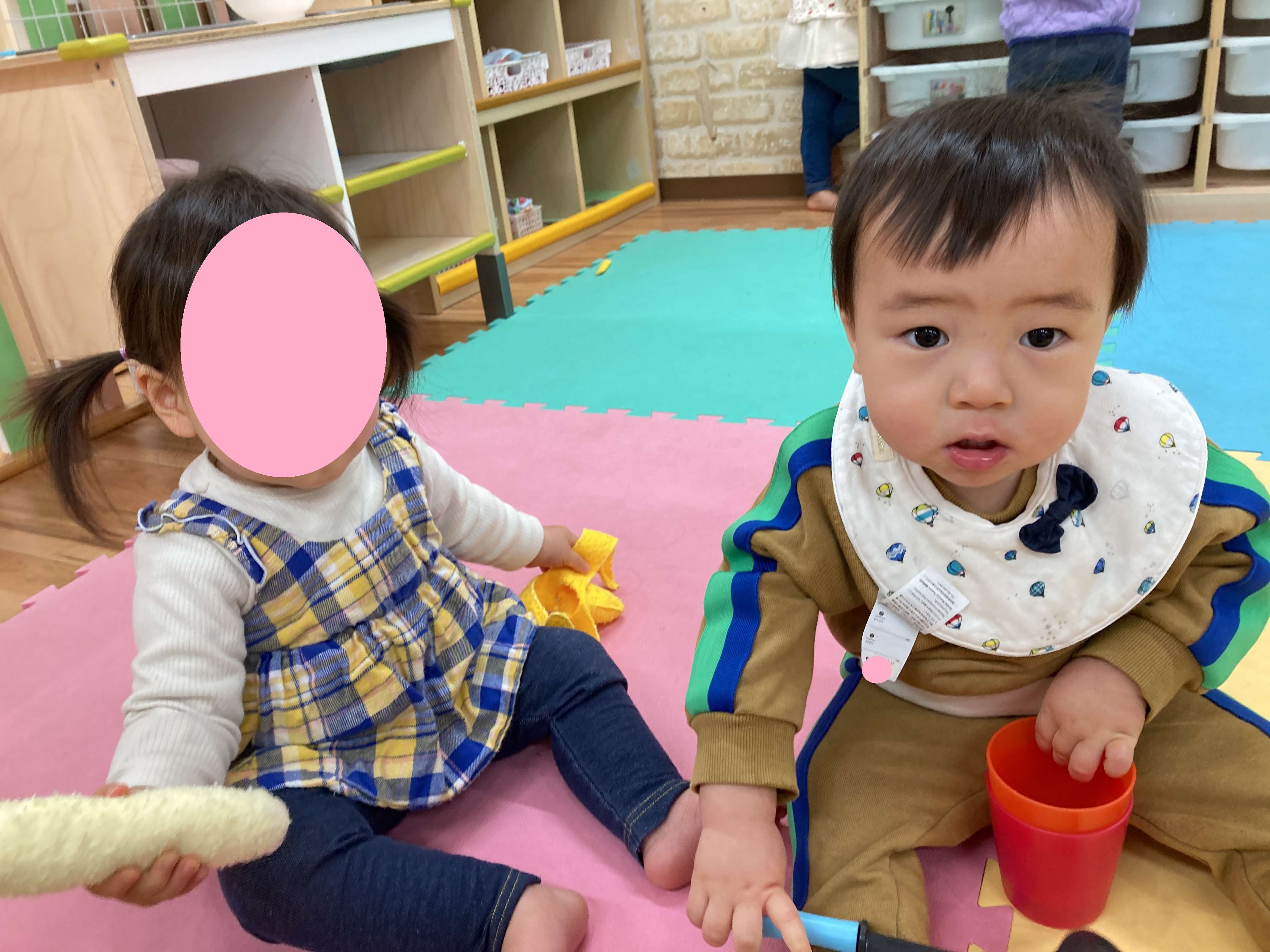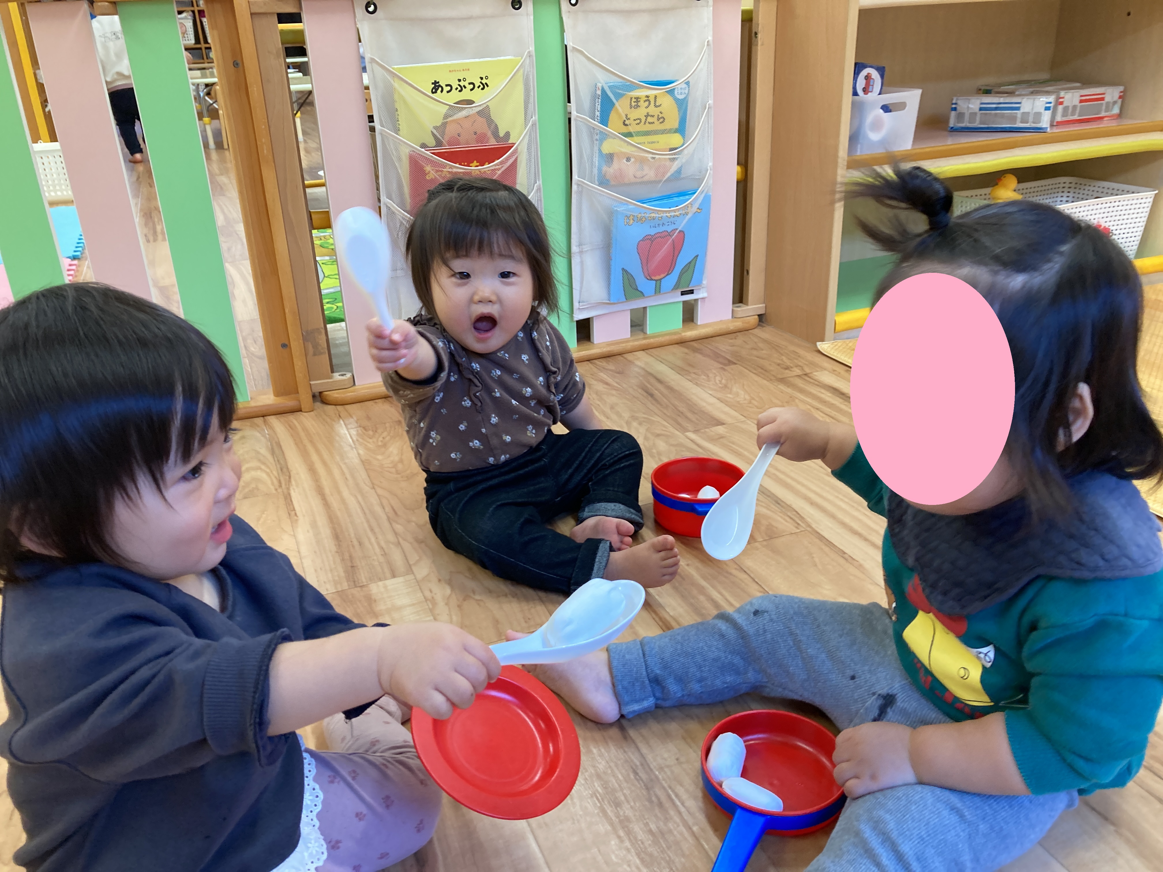 「あーん」「おいしいね♪」見立て遊びをしながら、お友達との関わりも楽しんでいます![]()