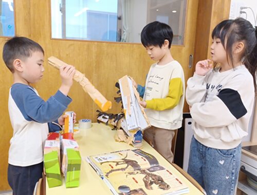 初めは数人で制作を楽しんでいましたが、作っているお友だちの様子を見てどんどん仲間が増えていき、クラスみんなで博物館作りが始まりました![]()