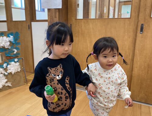 「一緒に行こう!」「私が案内してあげるね!」小さいクラスのお友だちと手を繋いで案内してくれる微笑ましい姿が見られました![]()