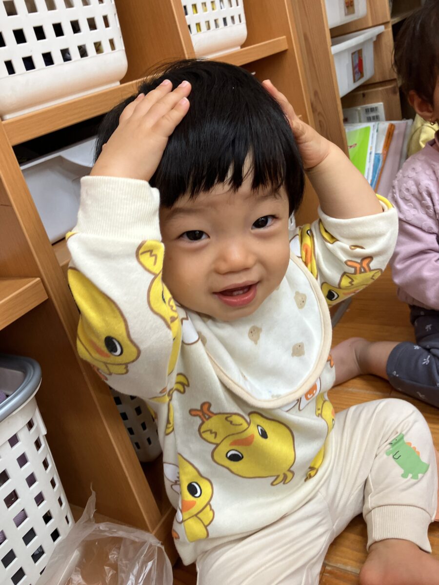 「サンタさんの帽子」で頭の上に帽子を作りました!
