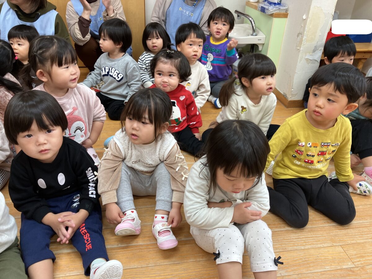 パネルシアターでは、大きな袋が出てくると静かに話を聞き、何が始まるのか袋をじっと見つめていました![]()