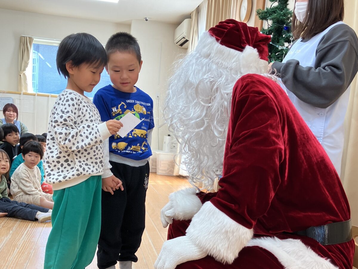 会も終盤に差し掛かり、サンタさんから手渡しでクリスマスプレゼントをもらいました![]()