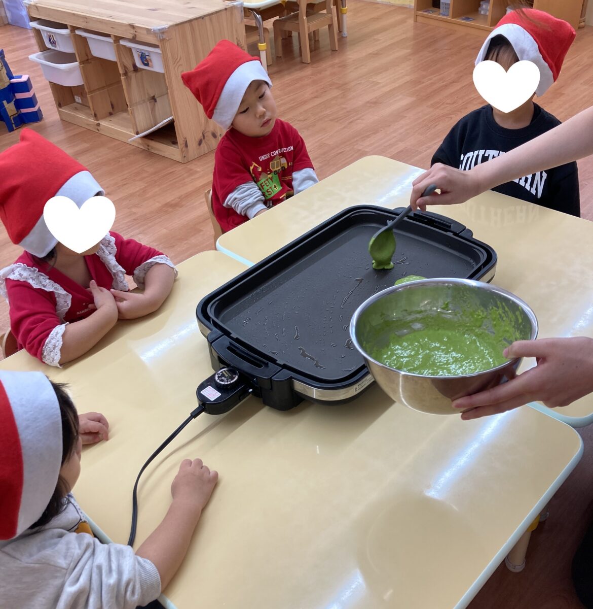 グリーンの色のホットケーキができてきました!いいにおいがしてきたね~