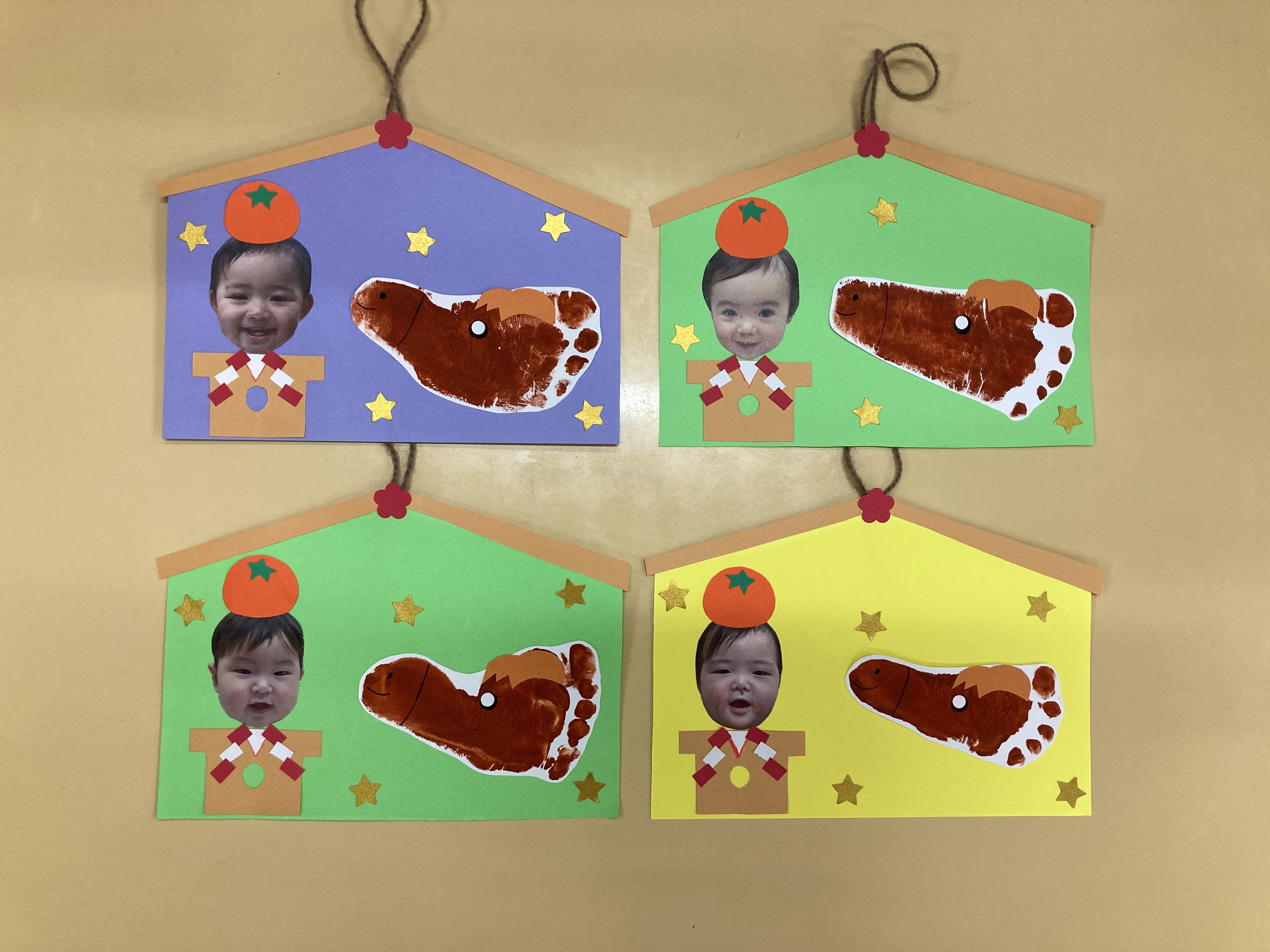 足の裏に筆で絵の具を塗って、足形の馬を作り、絵馬を完成させました⭐