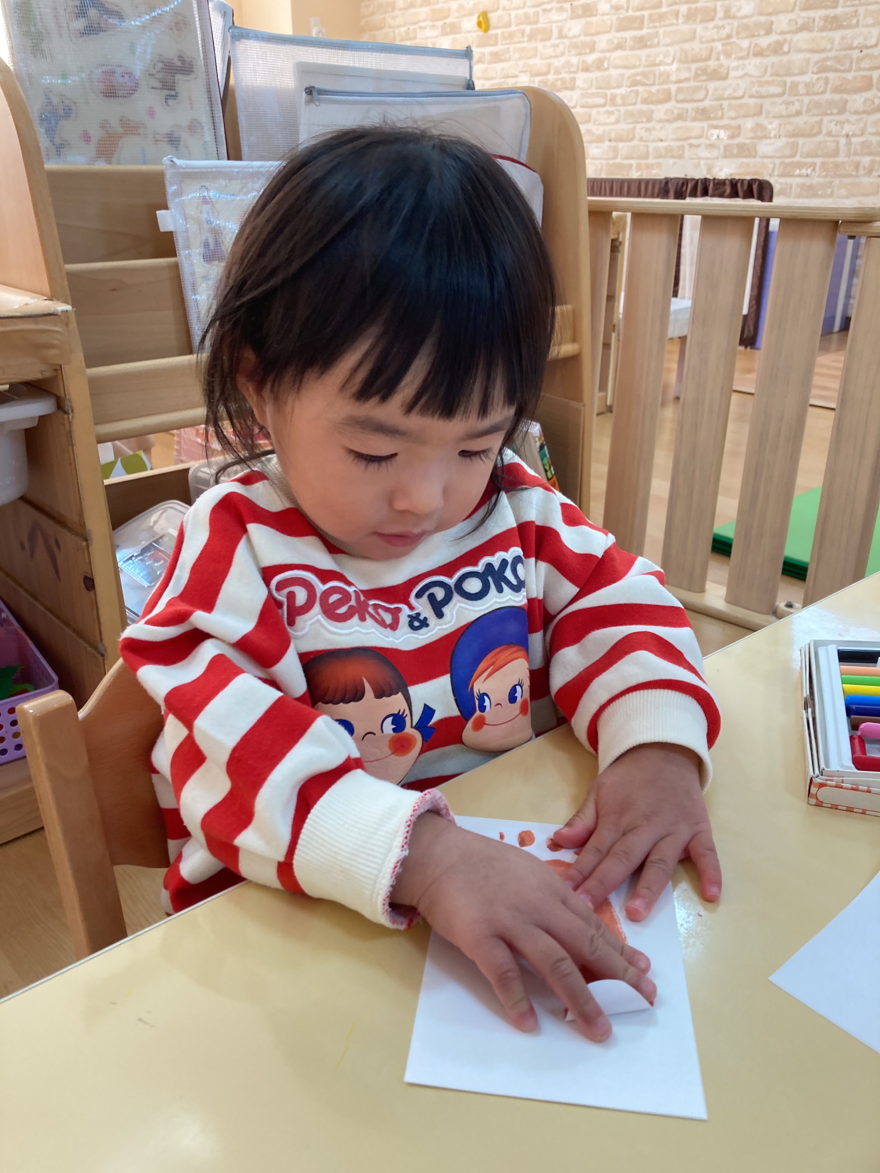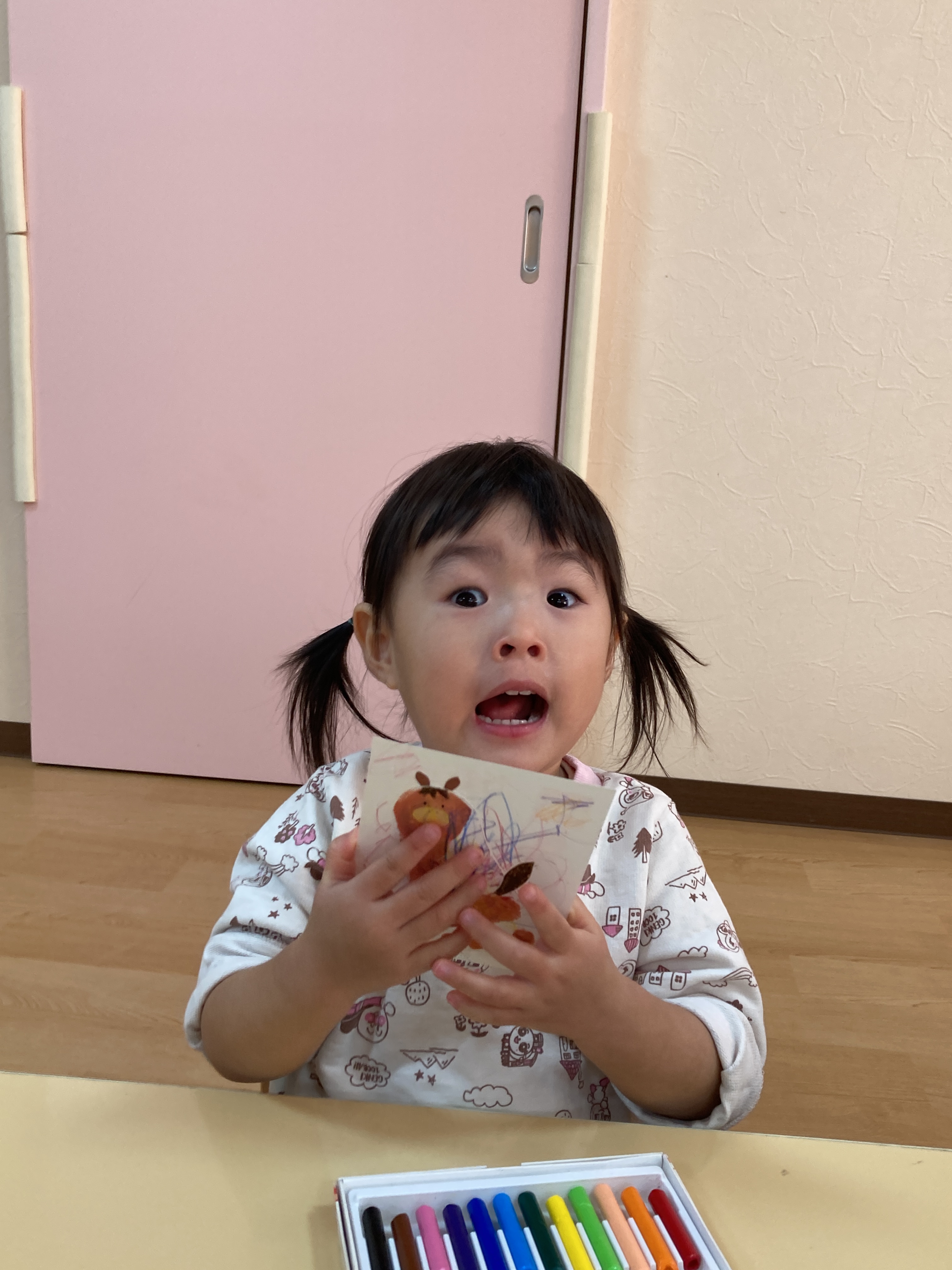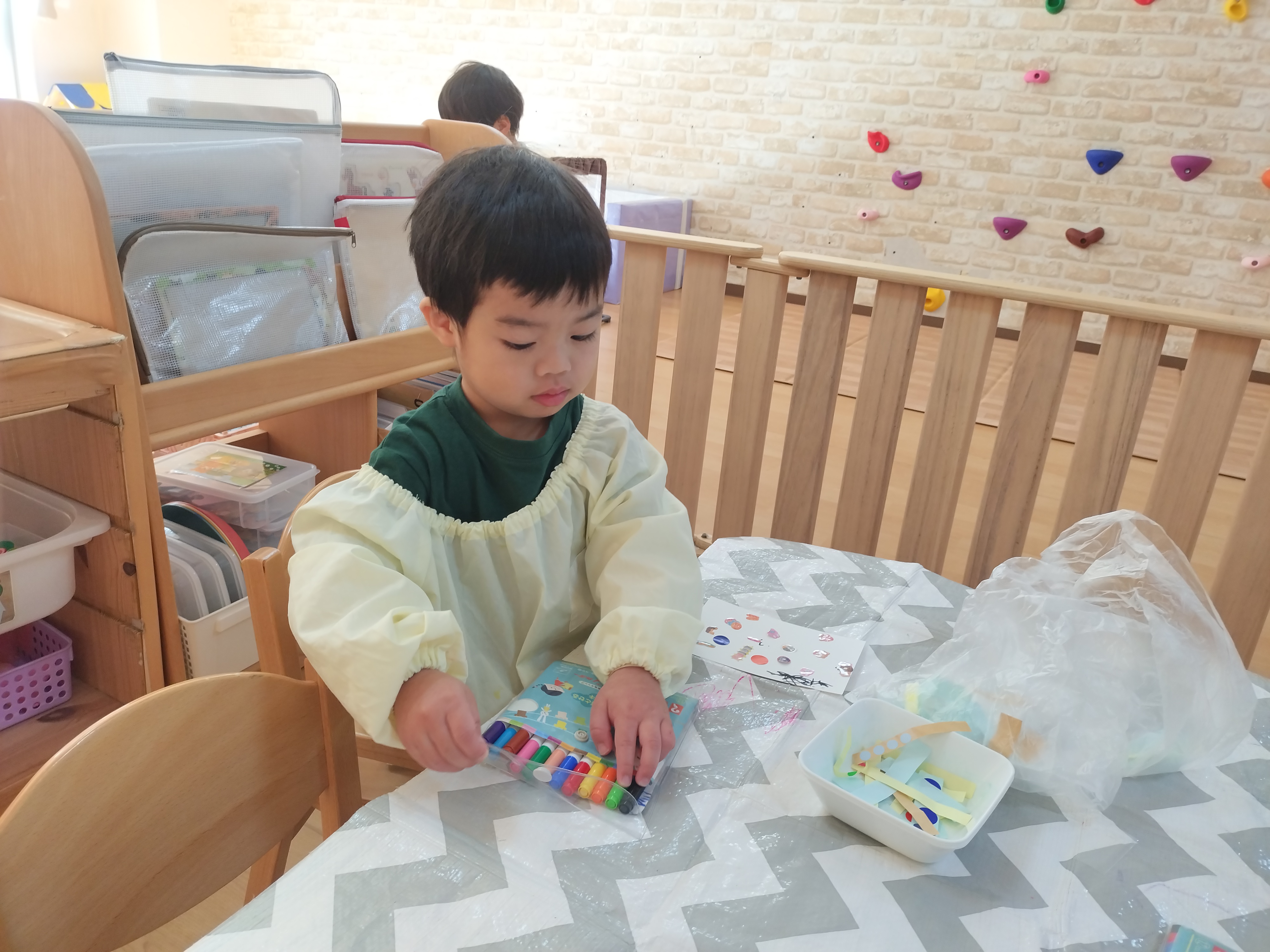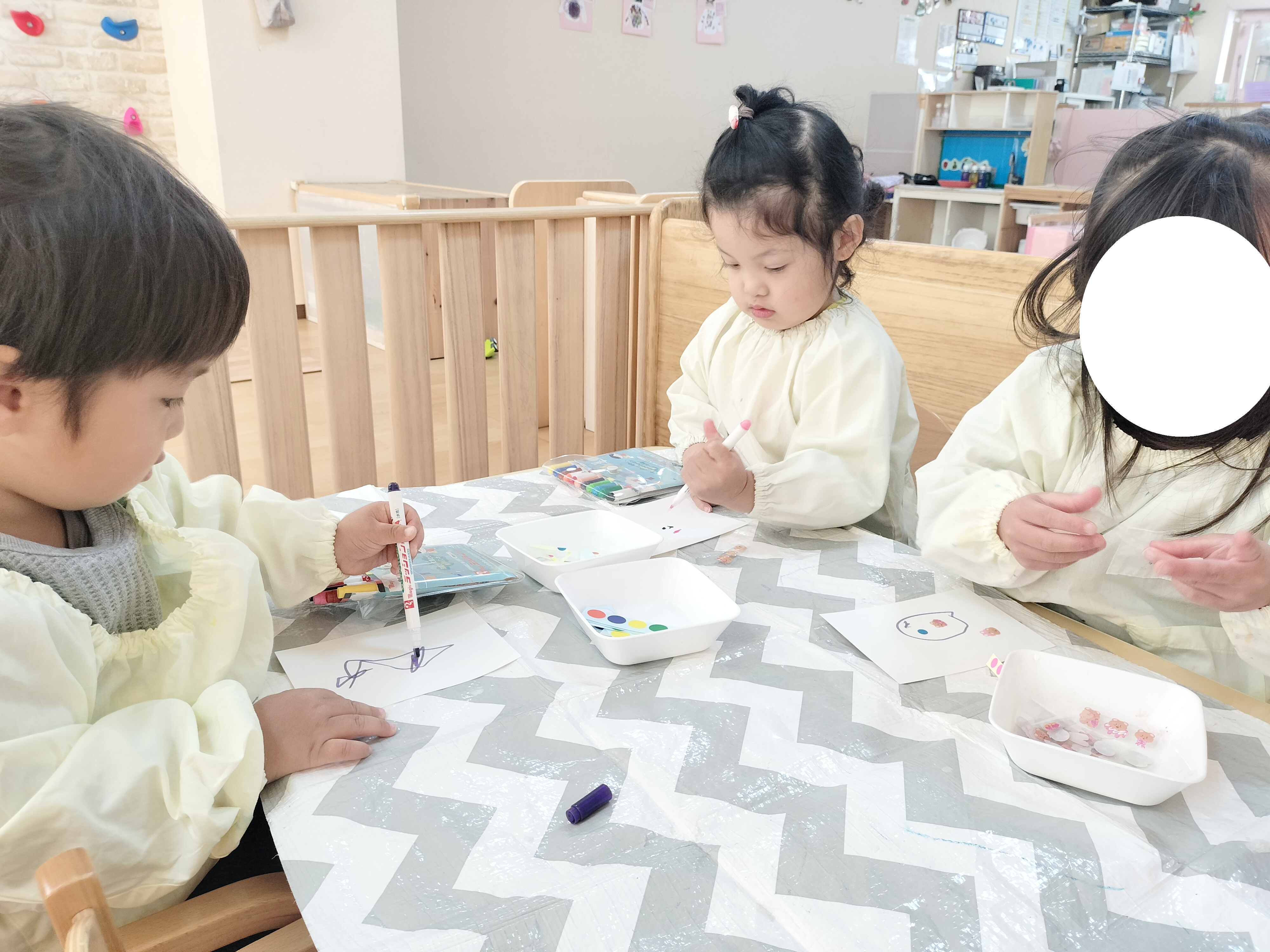 あかぐみさんは、ペンを使ったお絵描きとシール貼りに挑戦しました