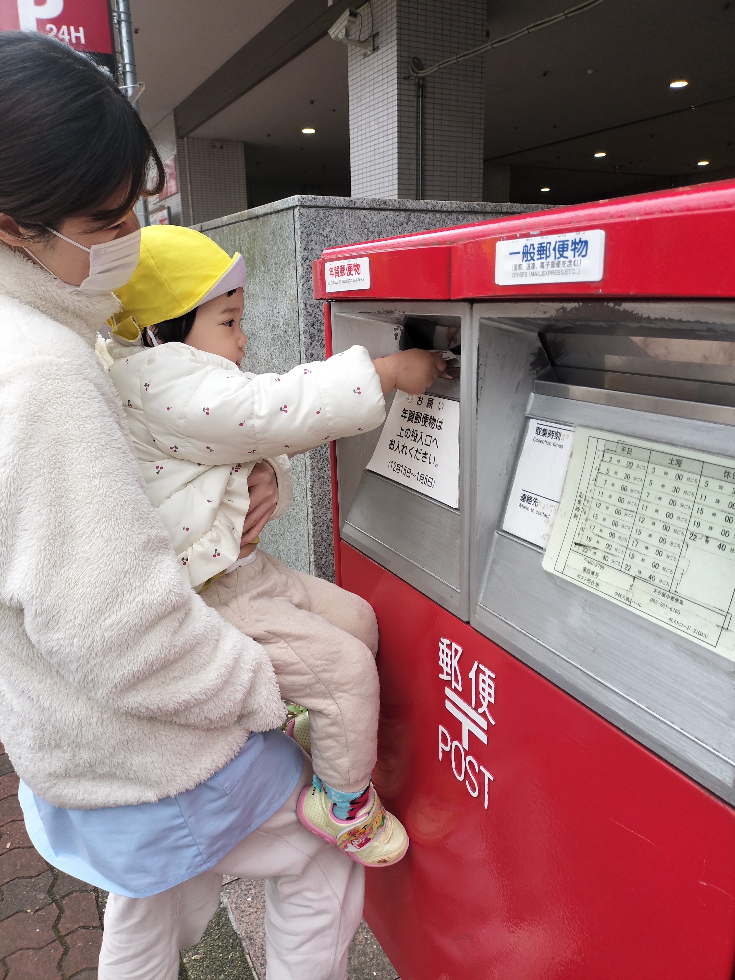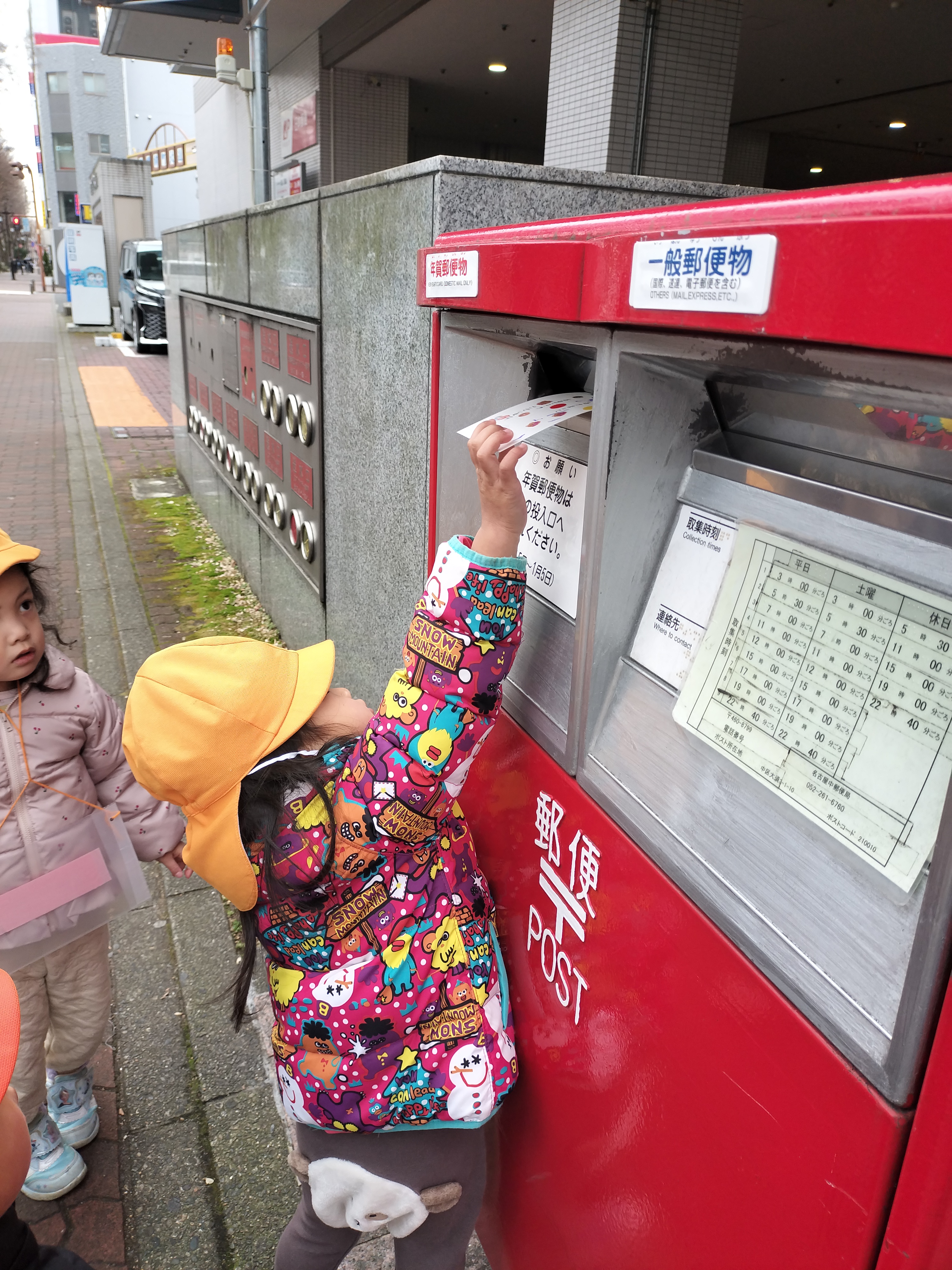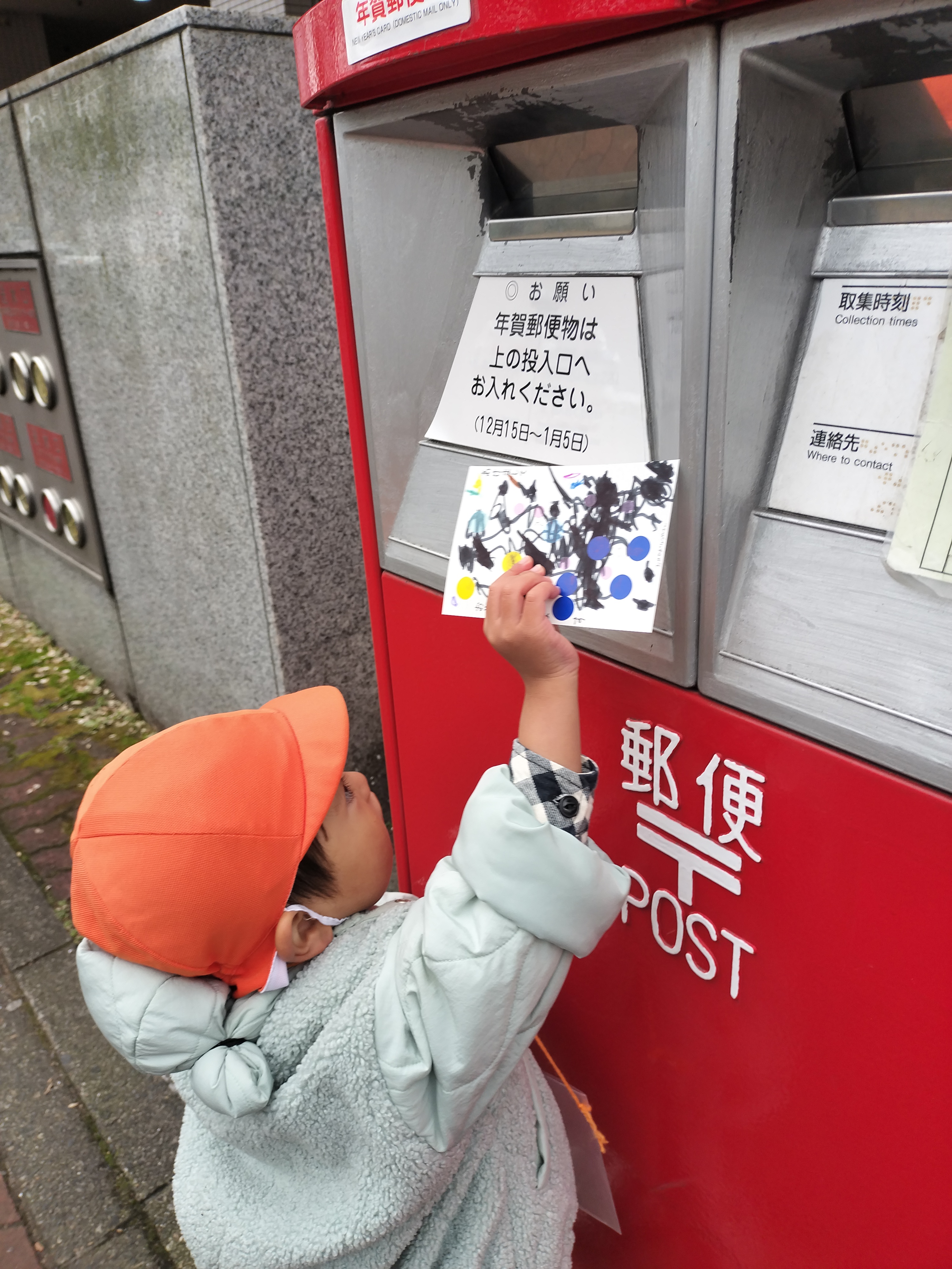 お散歩前、「今からこの年賀状を、郵便局のポストへ入れに行こう!」とお話すると、ワクワクした表情で「やったぁ~」と大喜びの子どもたち。