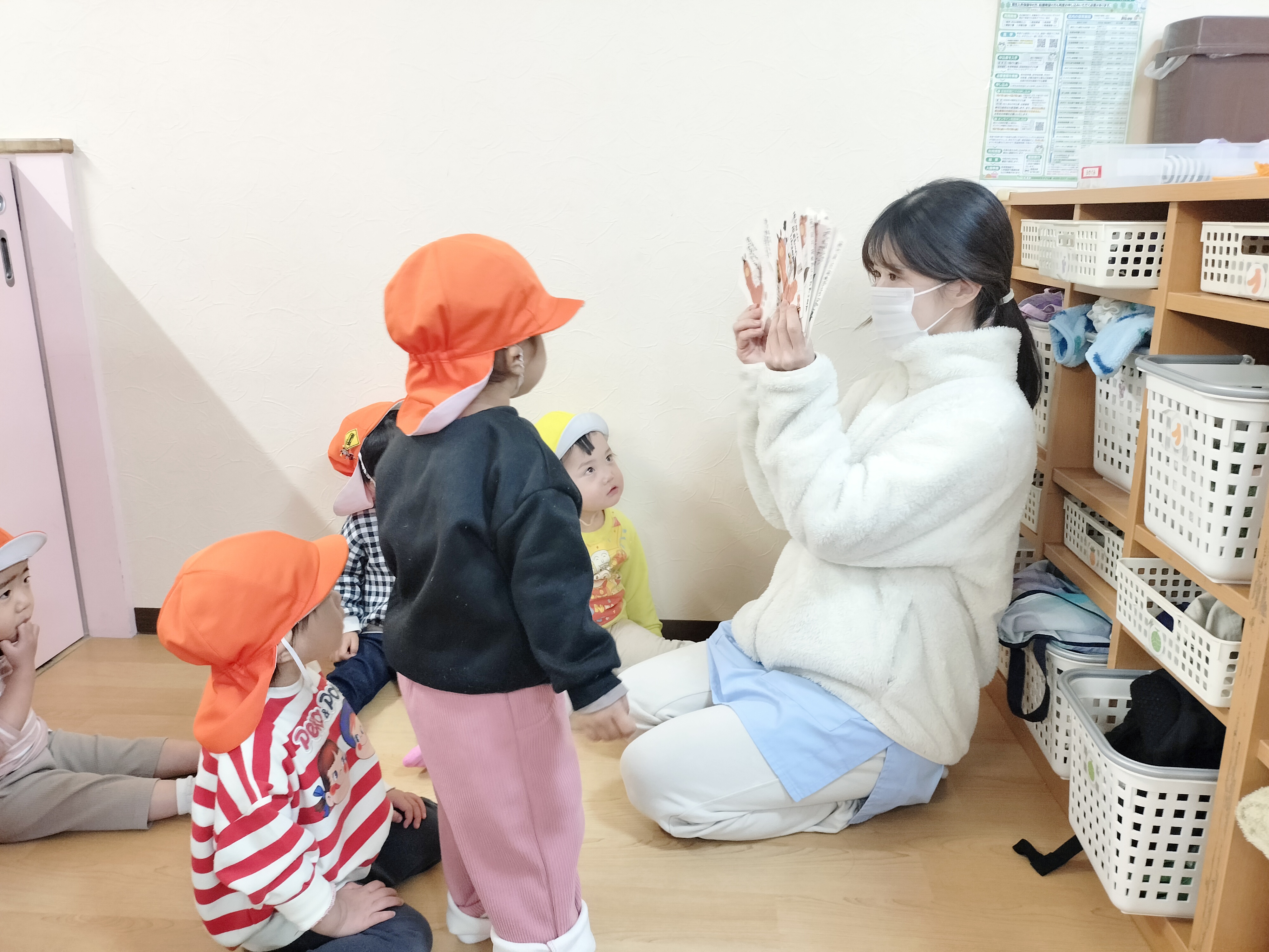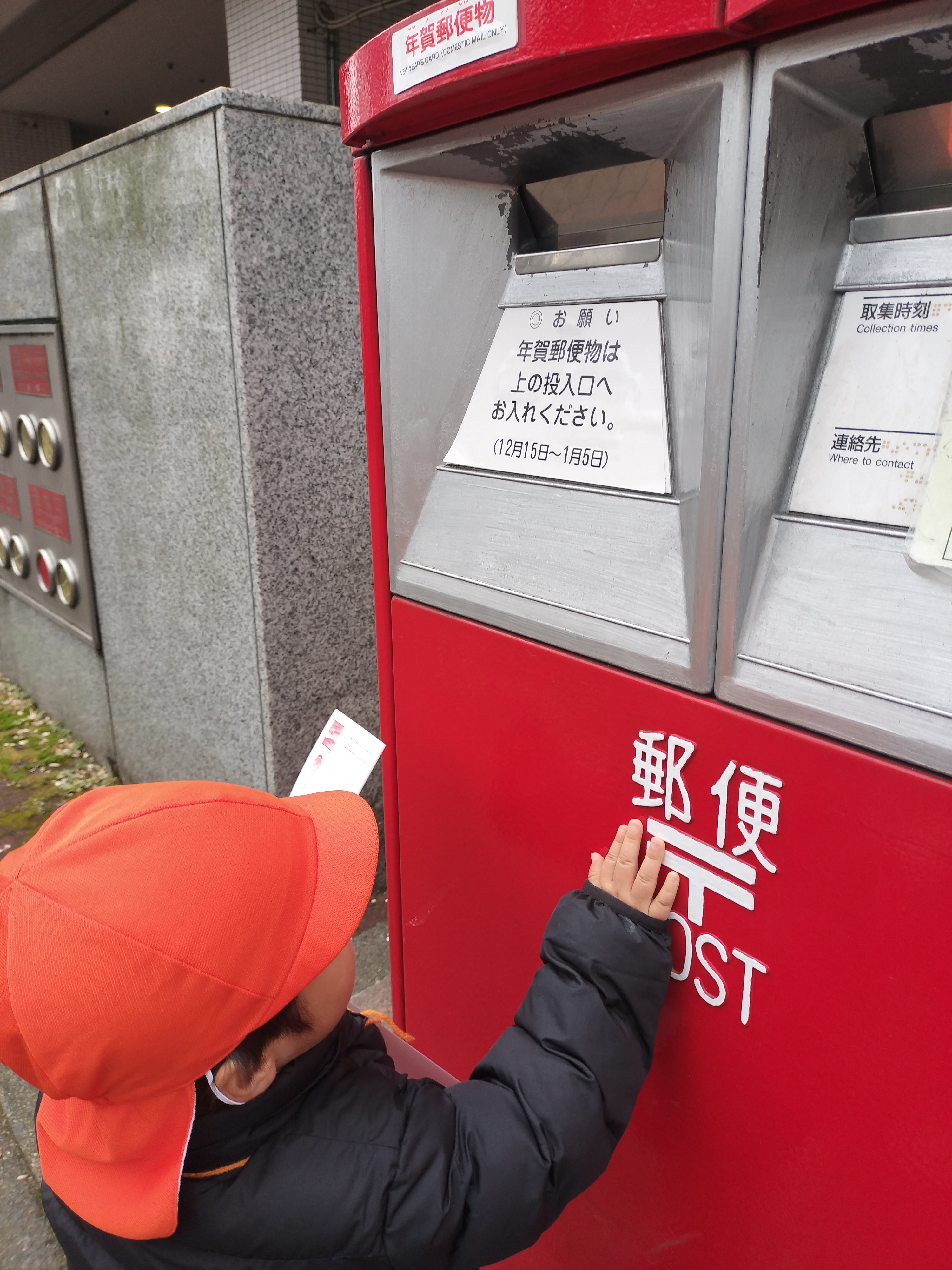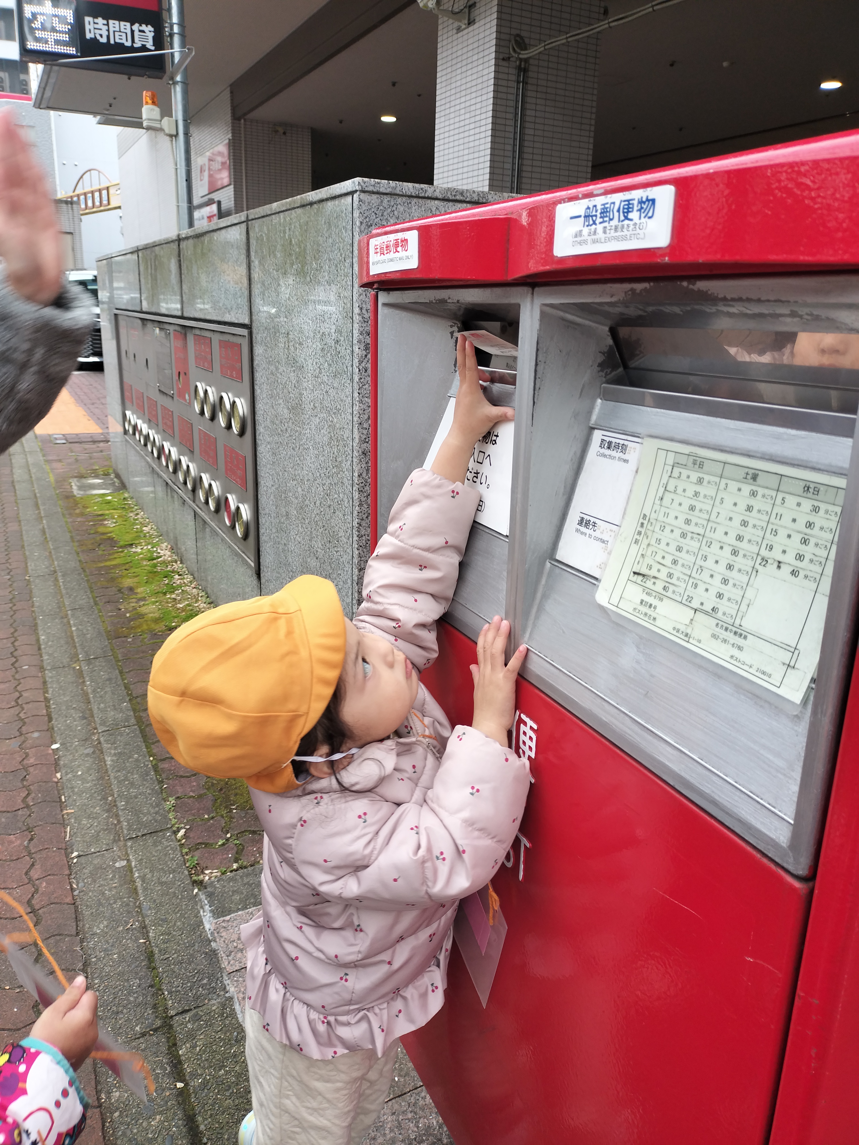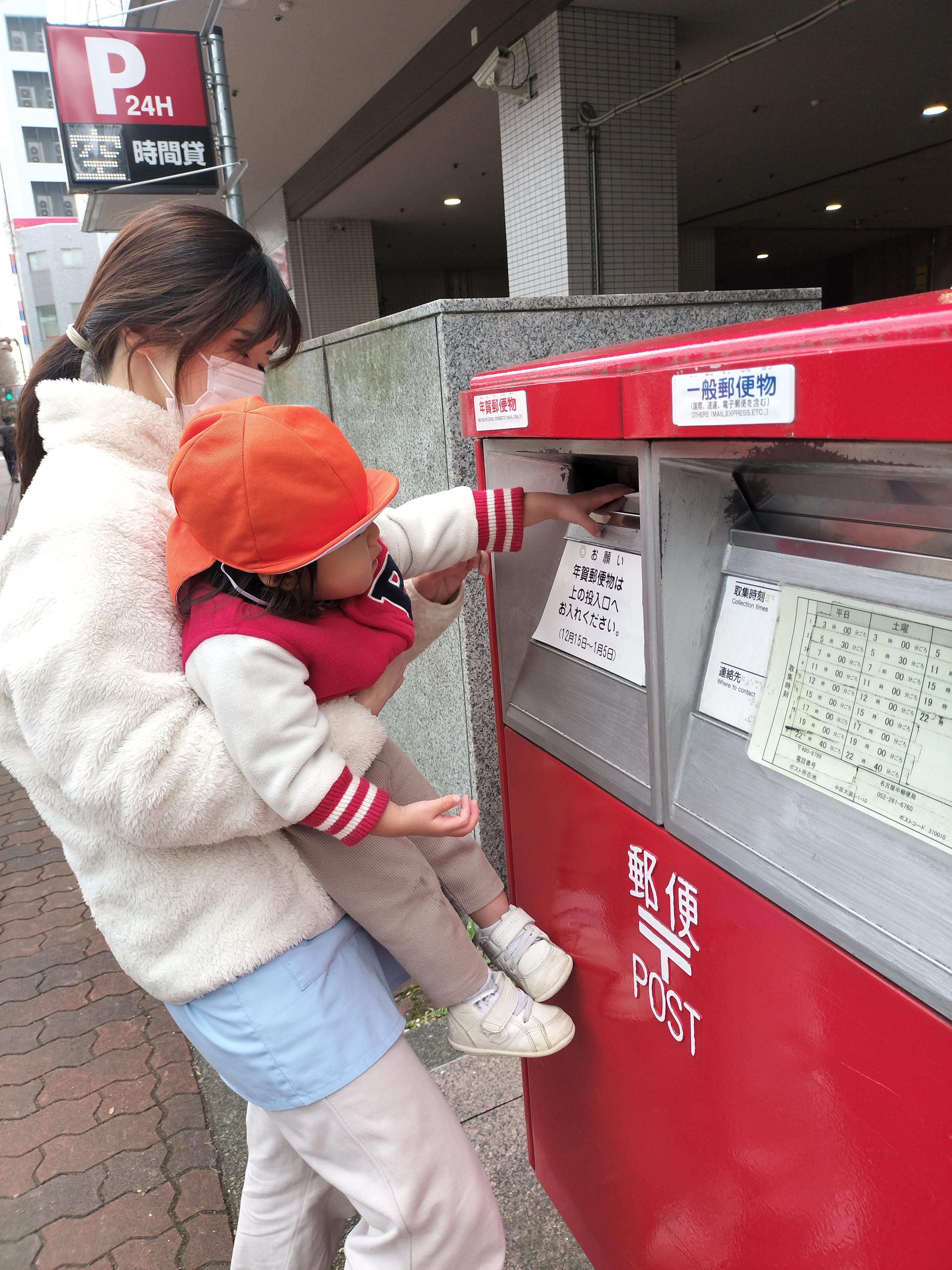 お散歩前、「今からこの年賀状を、郵便局のポストへ入れに行こう!」とお話すると、ワクワクした表情で「やったぁ~」と大喜びの子どもたち。