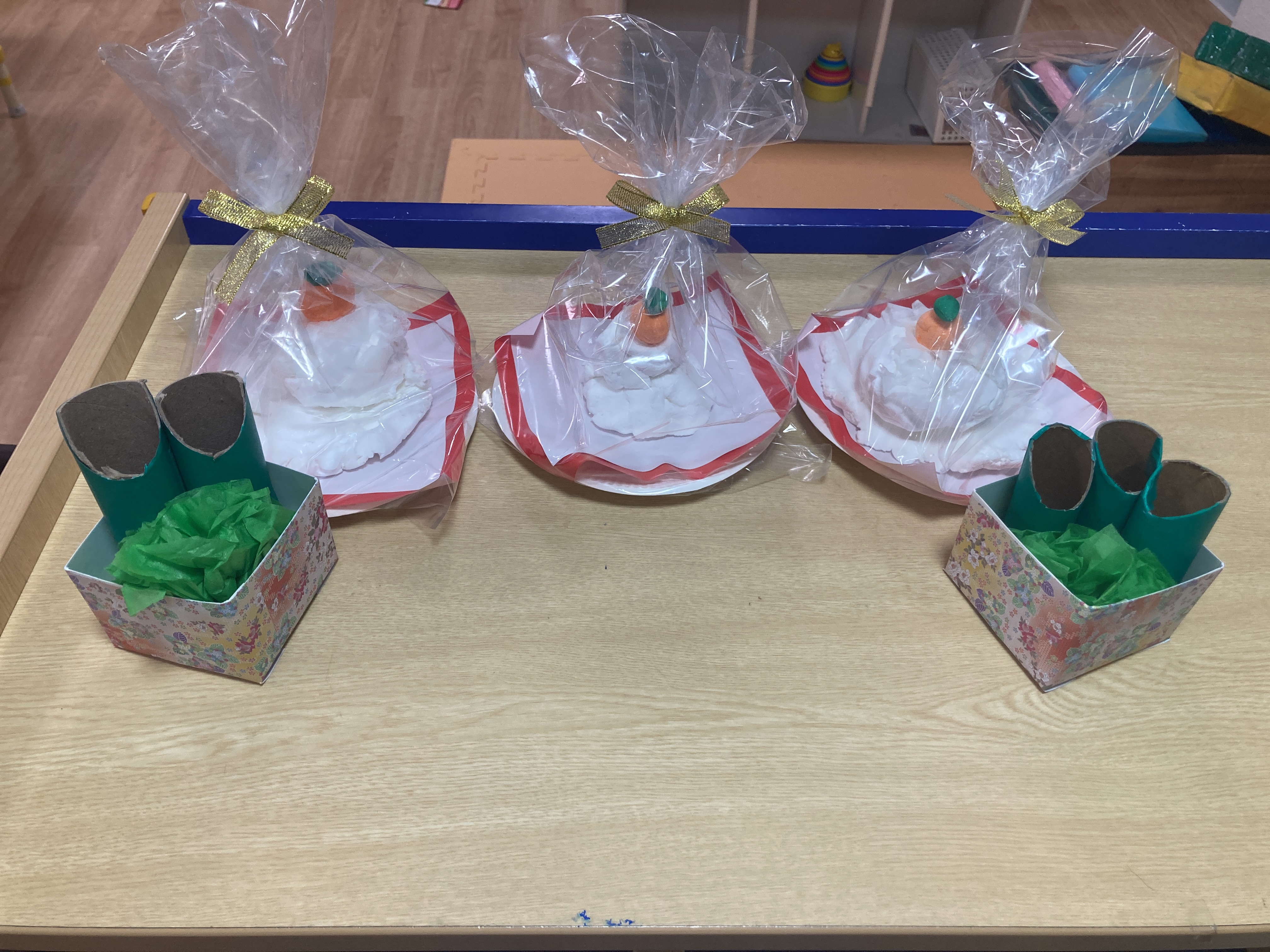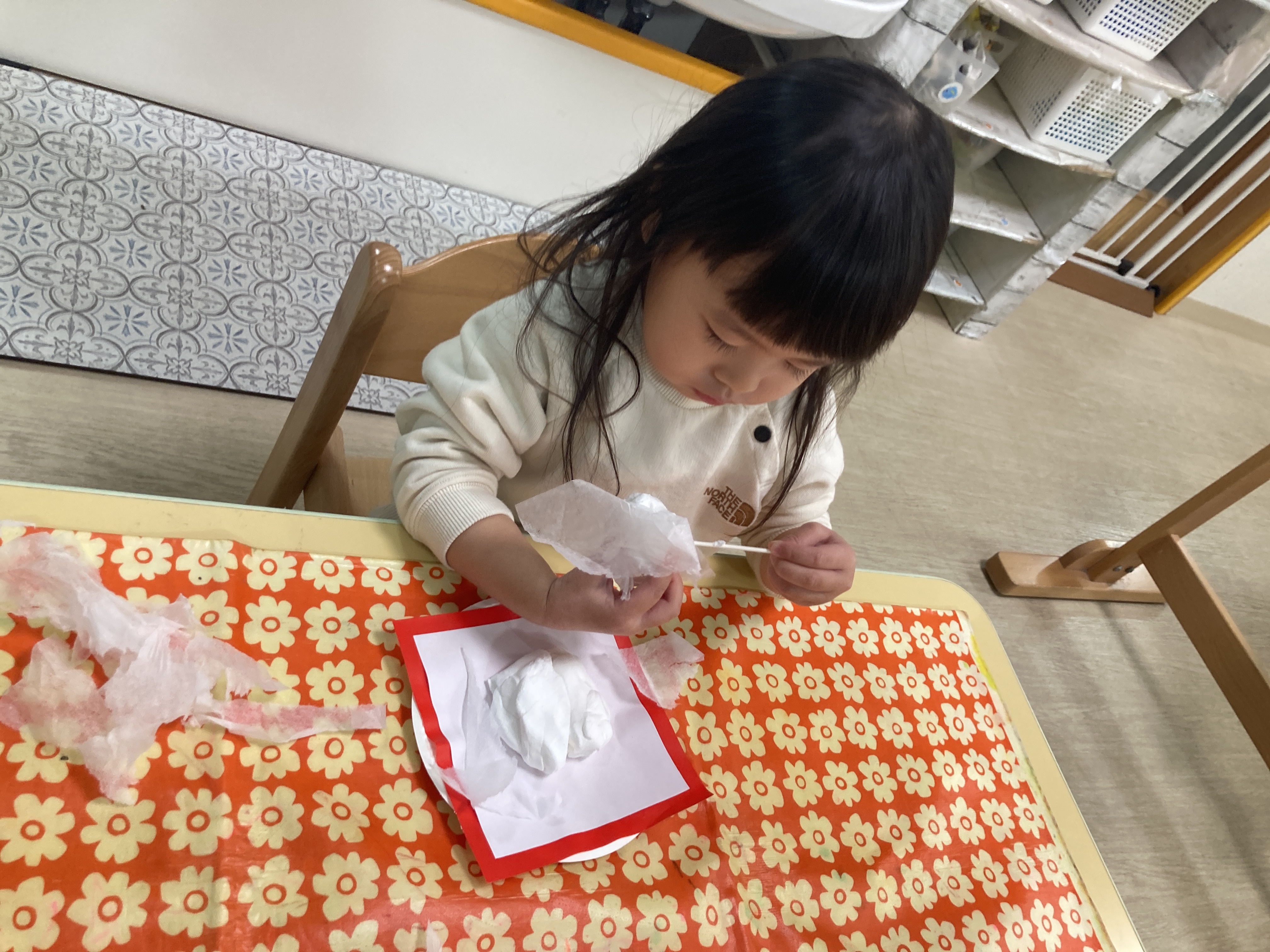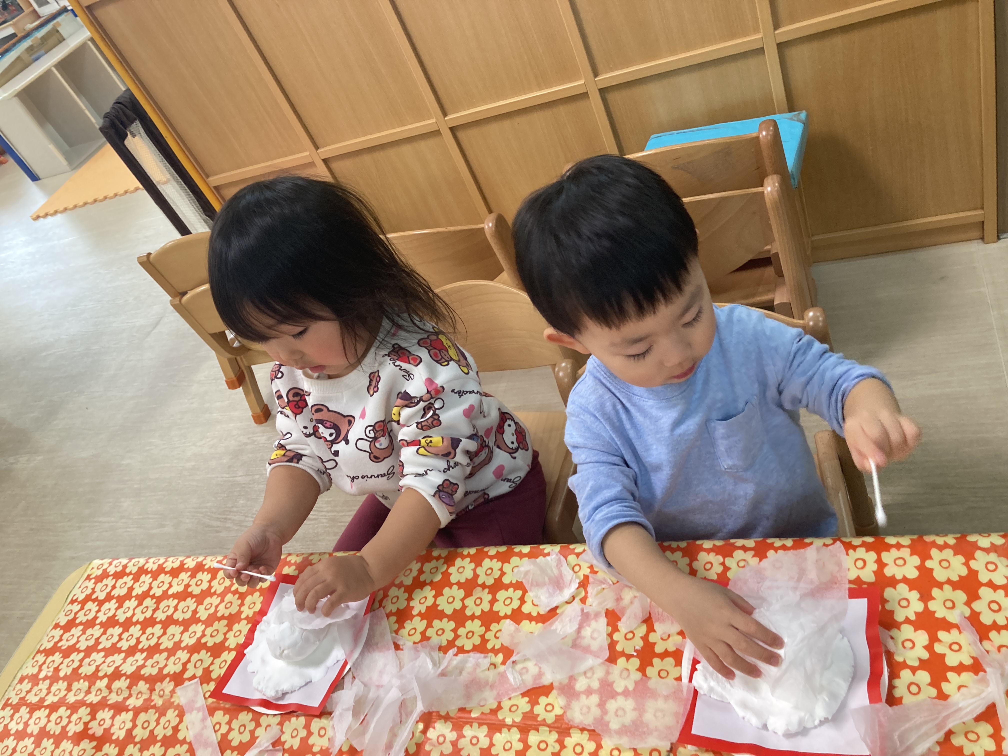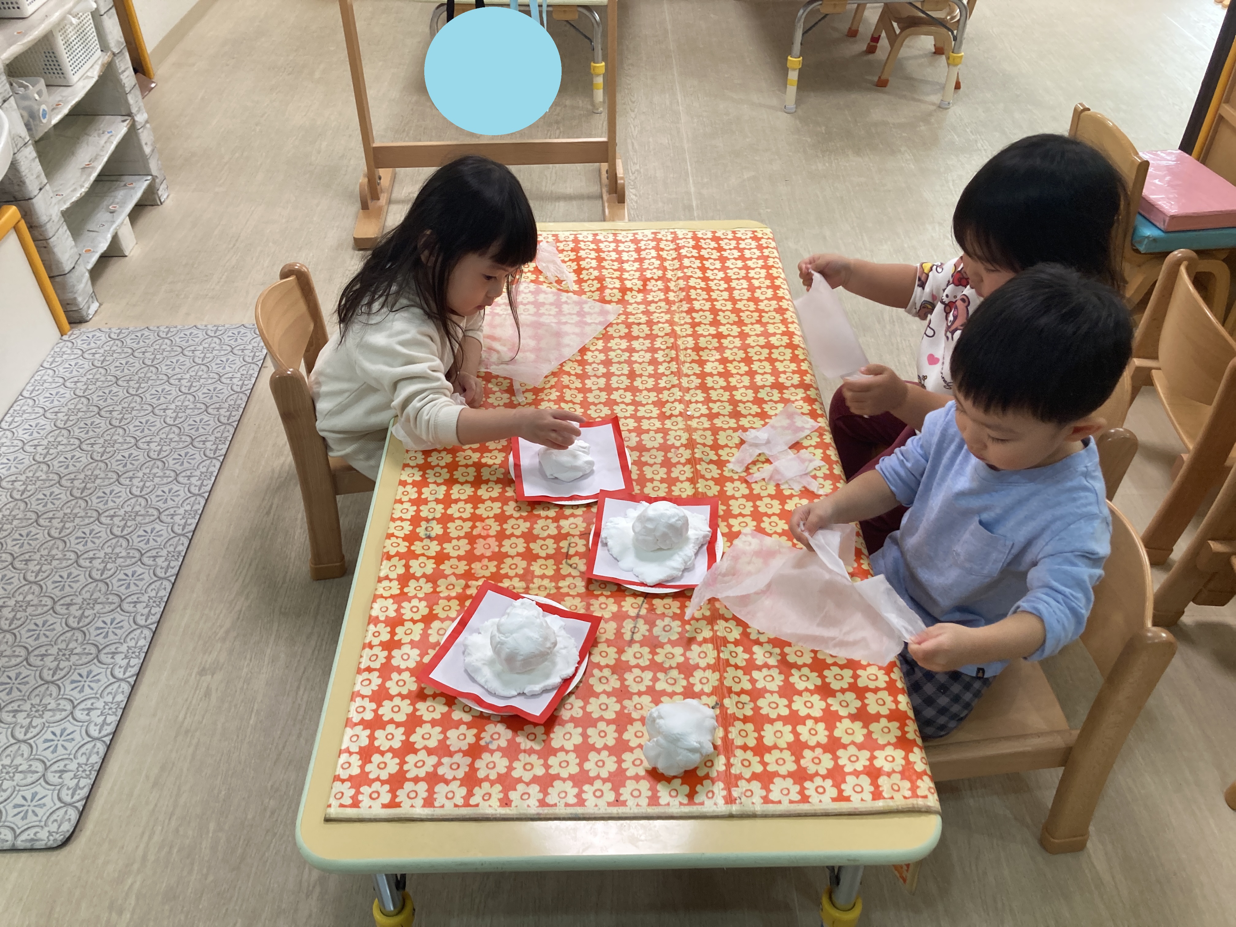 紙粘土をこねて、花紙をのせてかがみもちを作りました![]()
