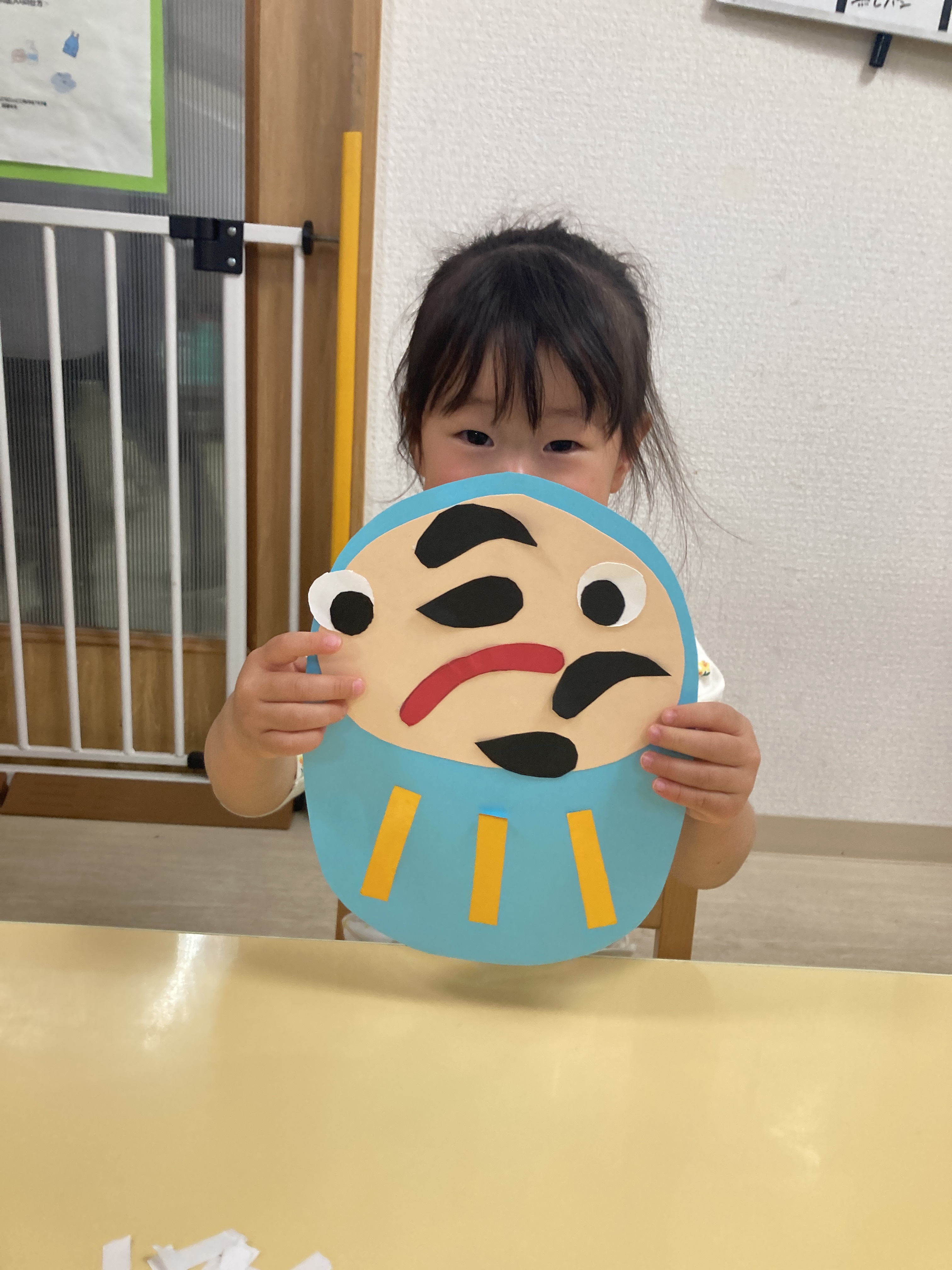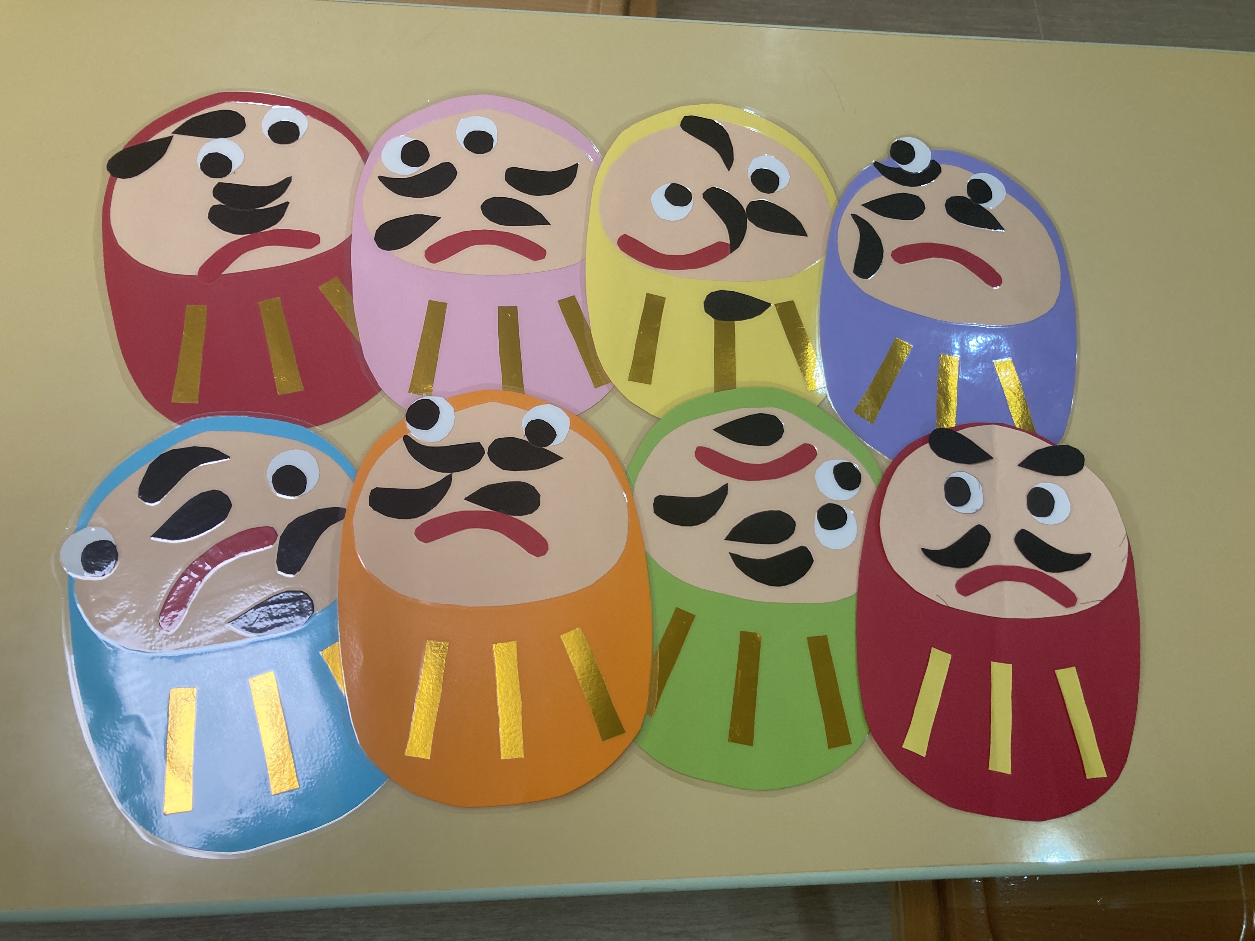 好きな色のだるまを選んで眉毛、目、ひげ、口をペタペタ![]()