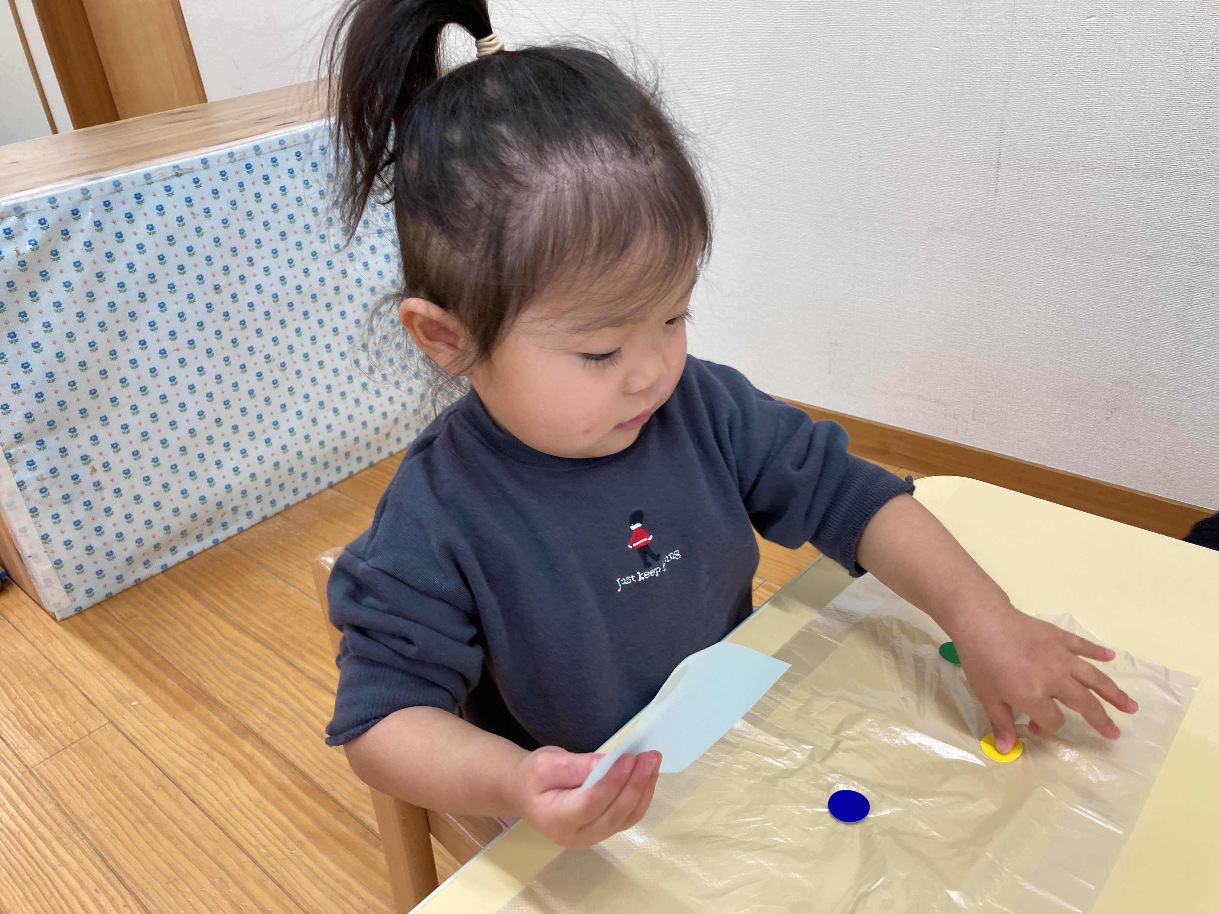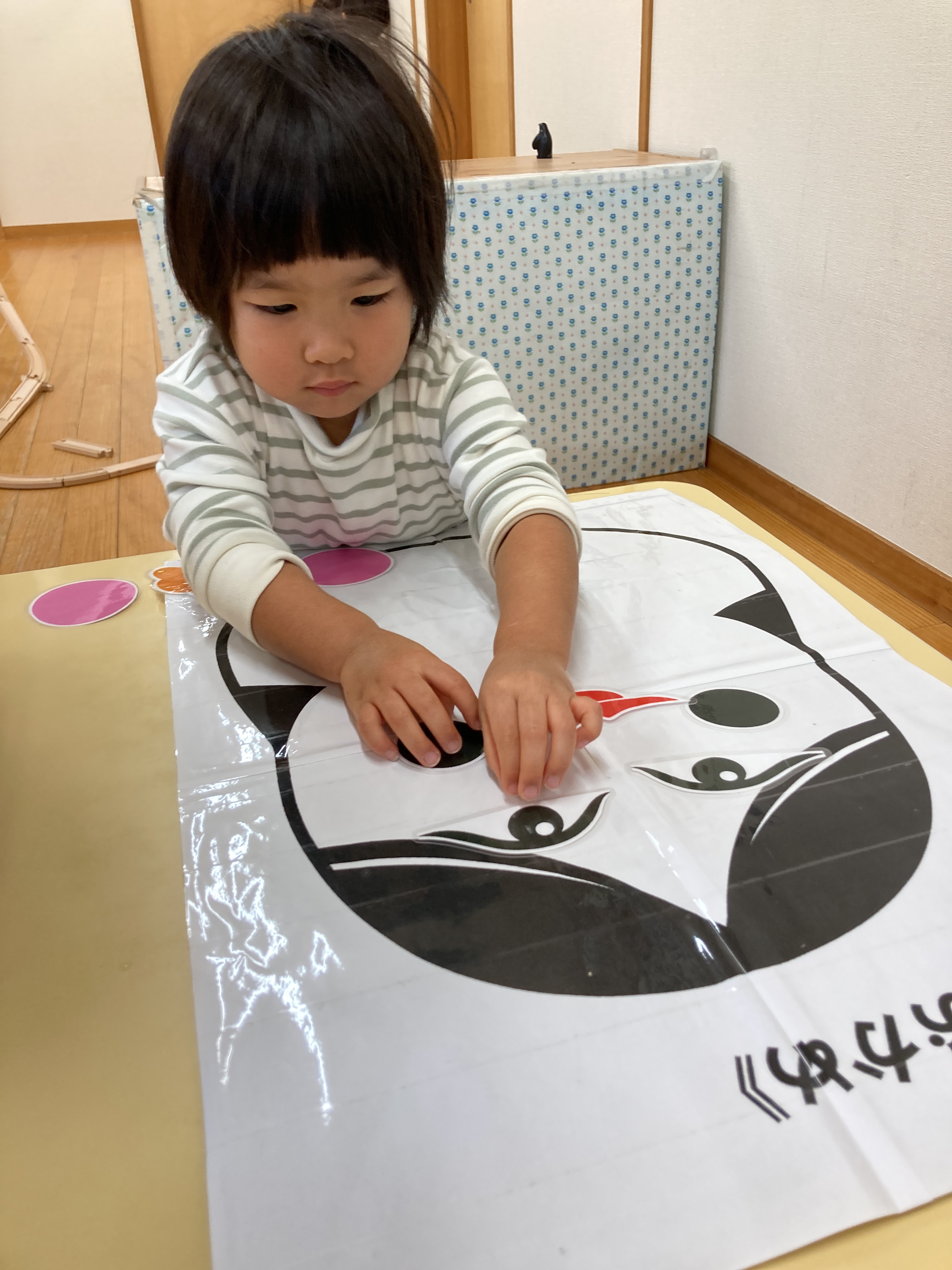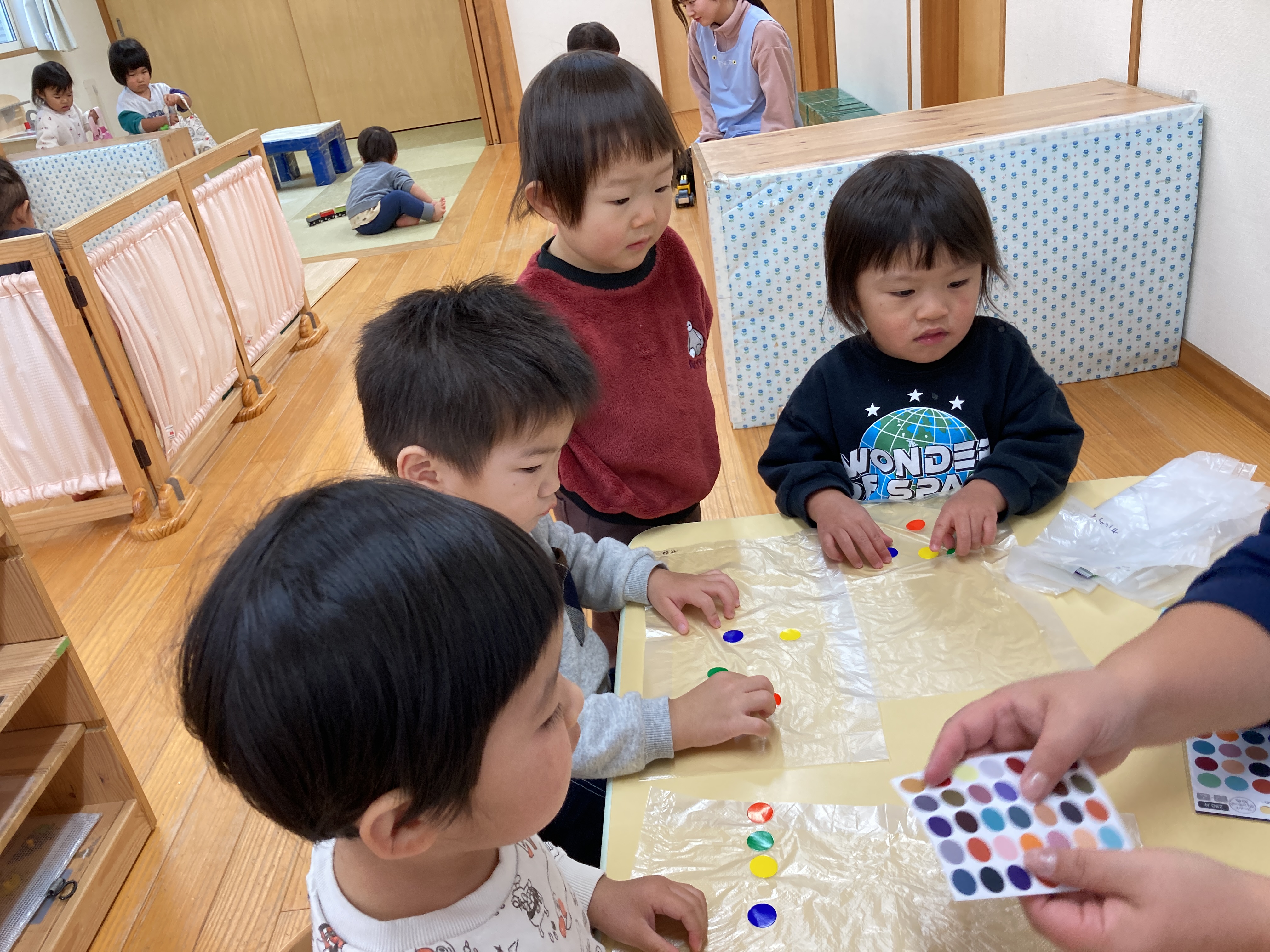 「なにいろにしようかな?」と嬉しそうにシールを選んでペタペタと貼っていきます![]()
