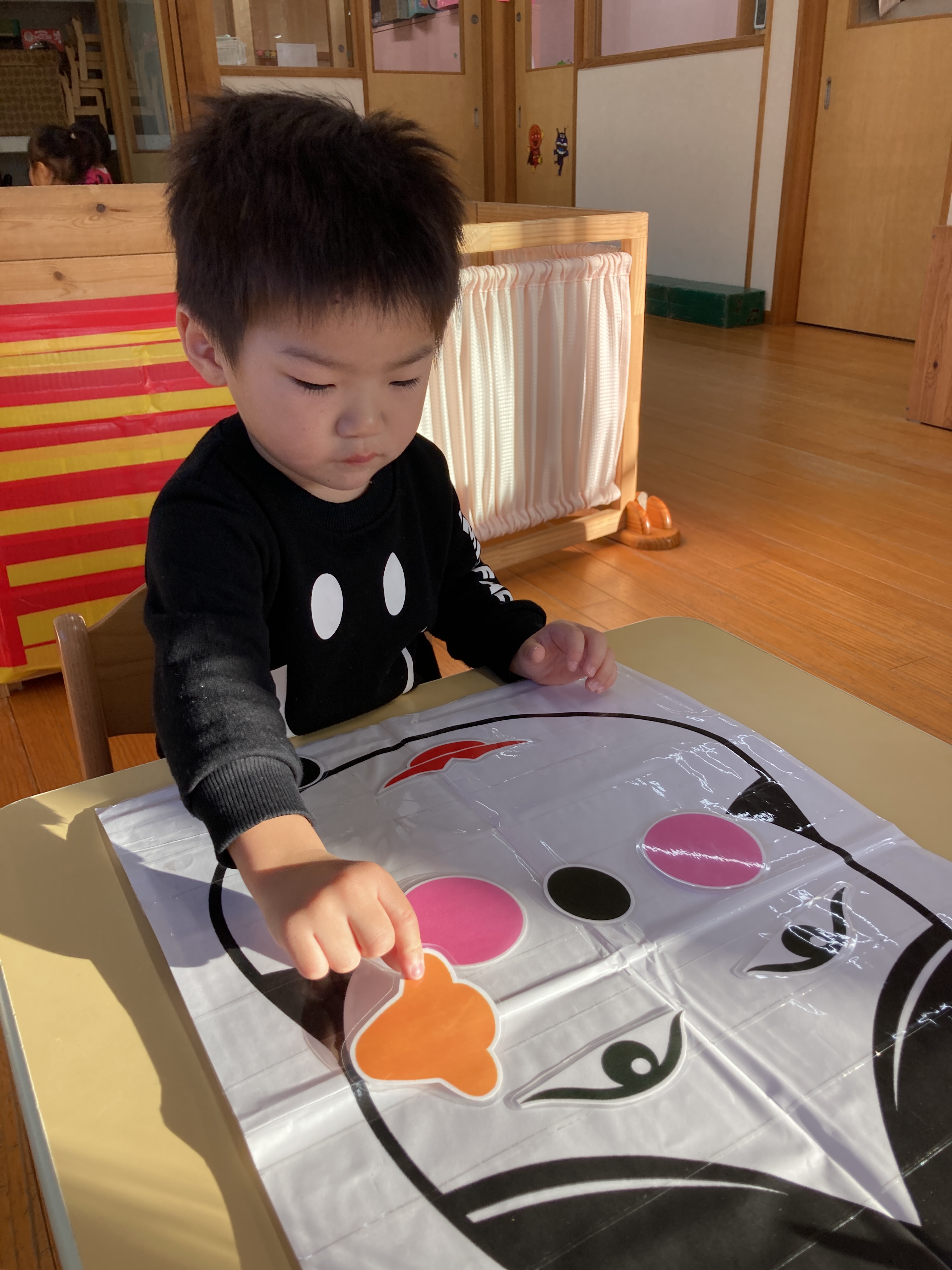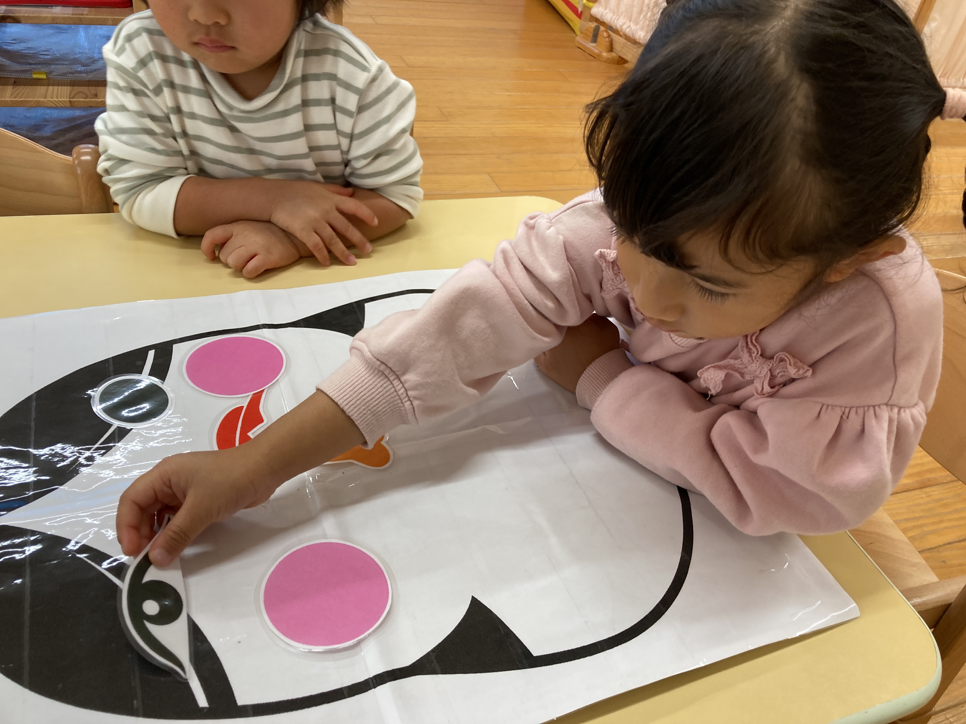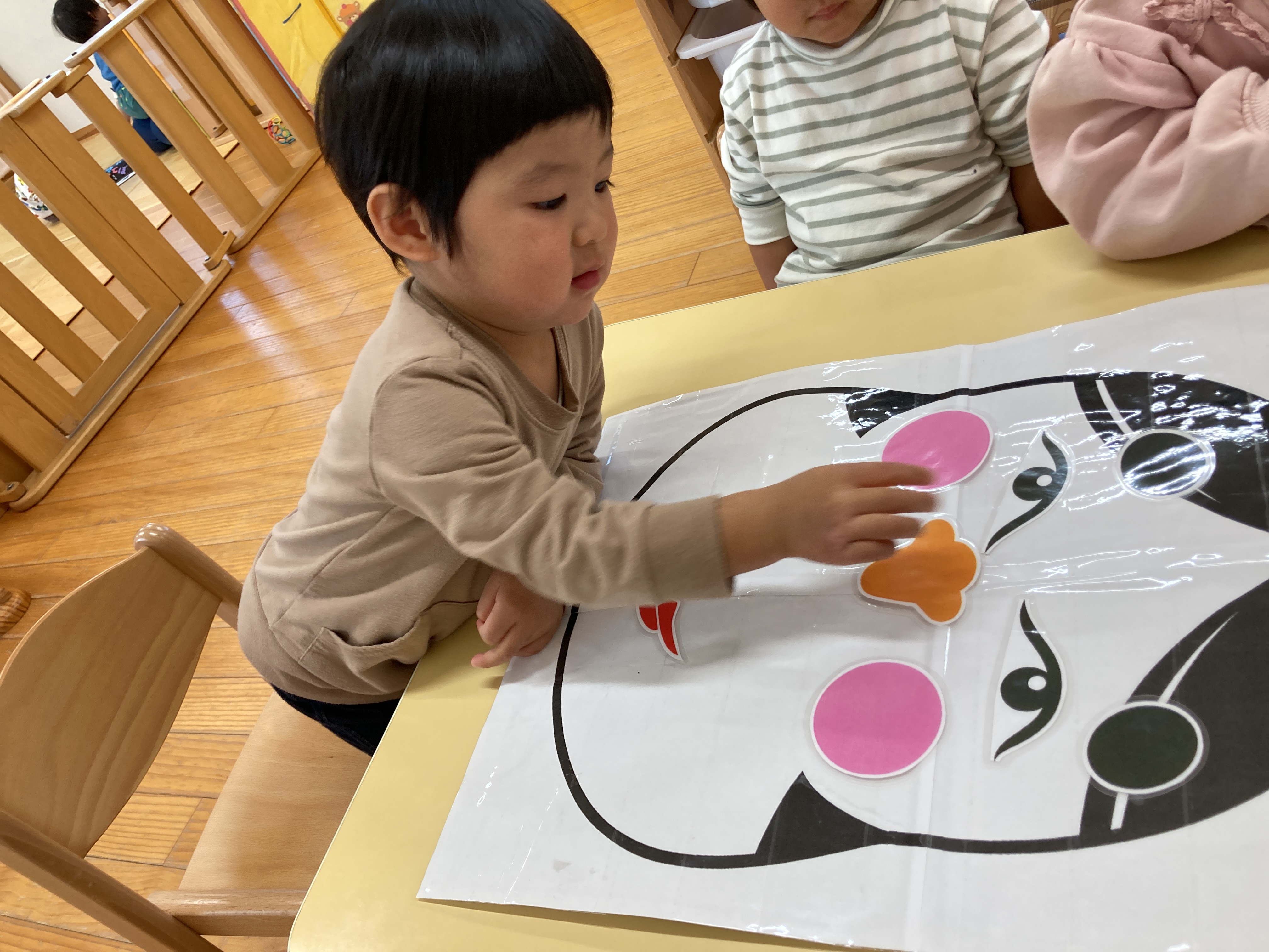 「これなんだろう?」「おめめどこかな?」などとお友だちと一緒にお話をしながらお顔を作って楽しんでいました!![]()