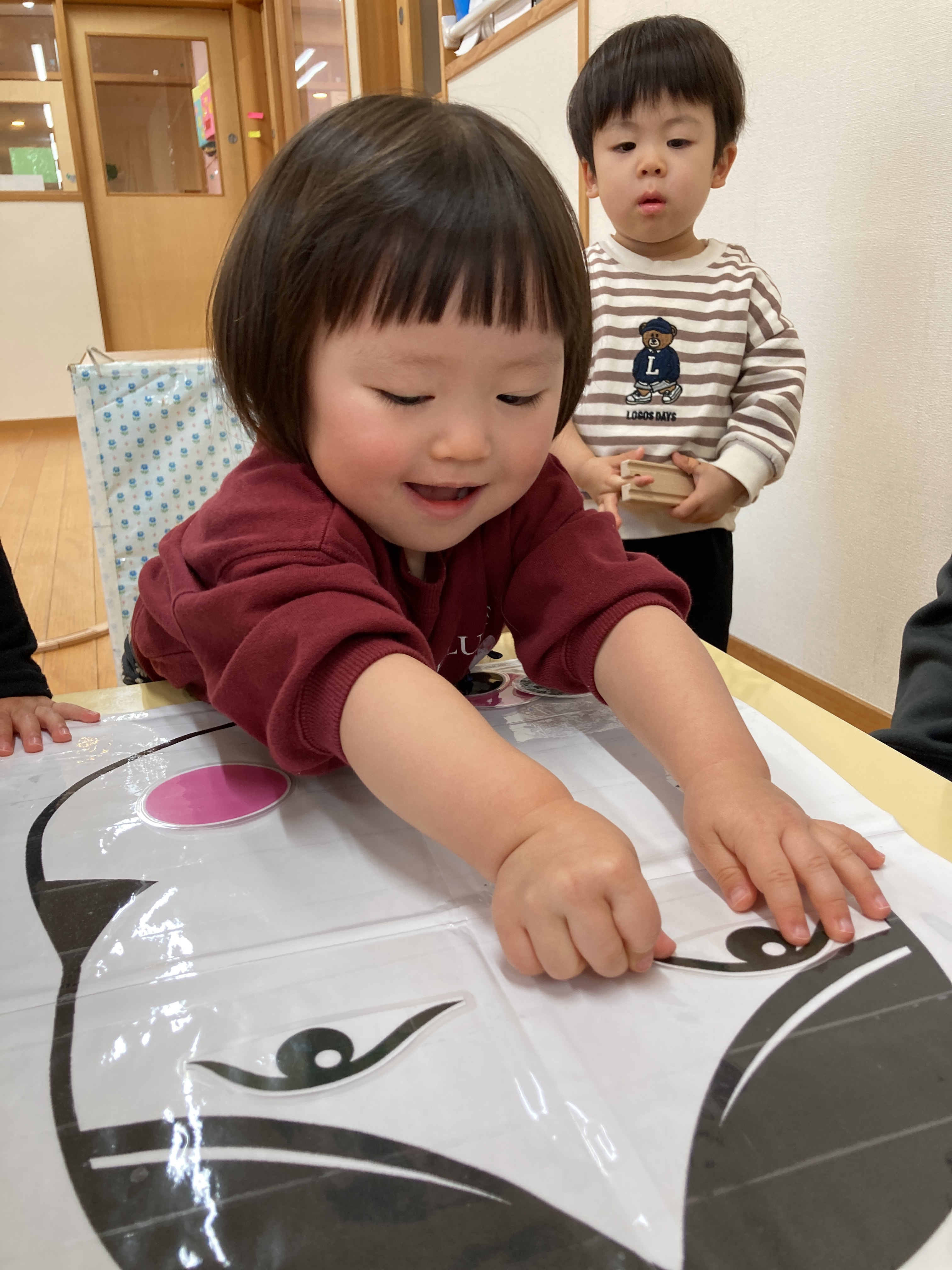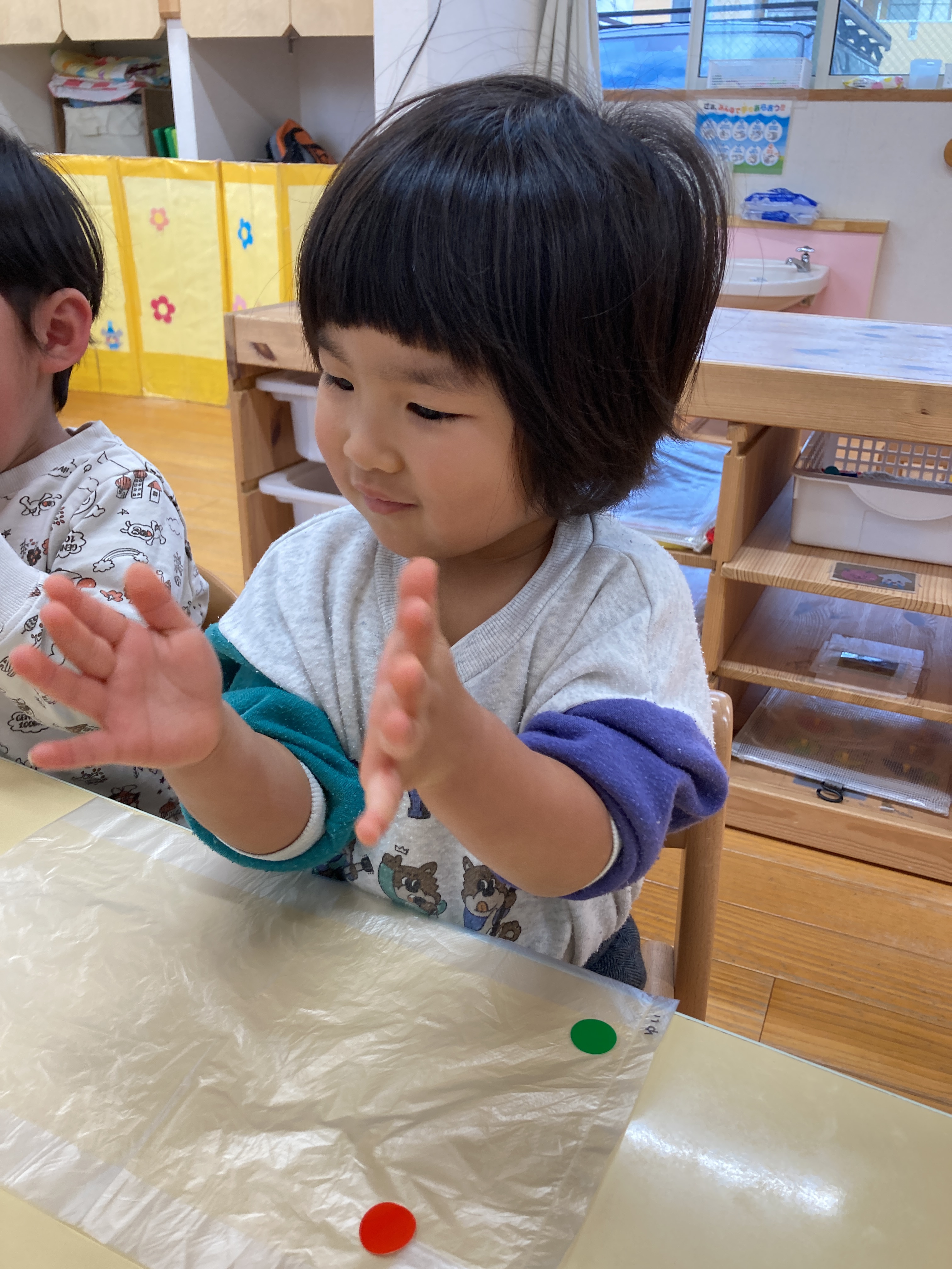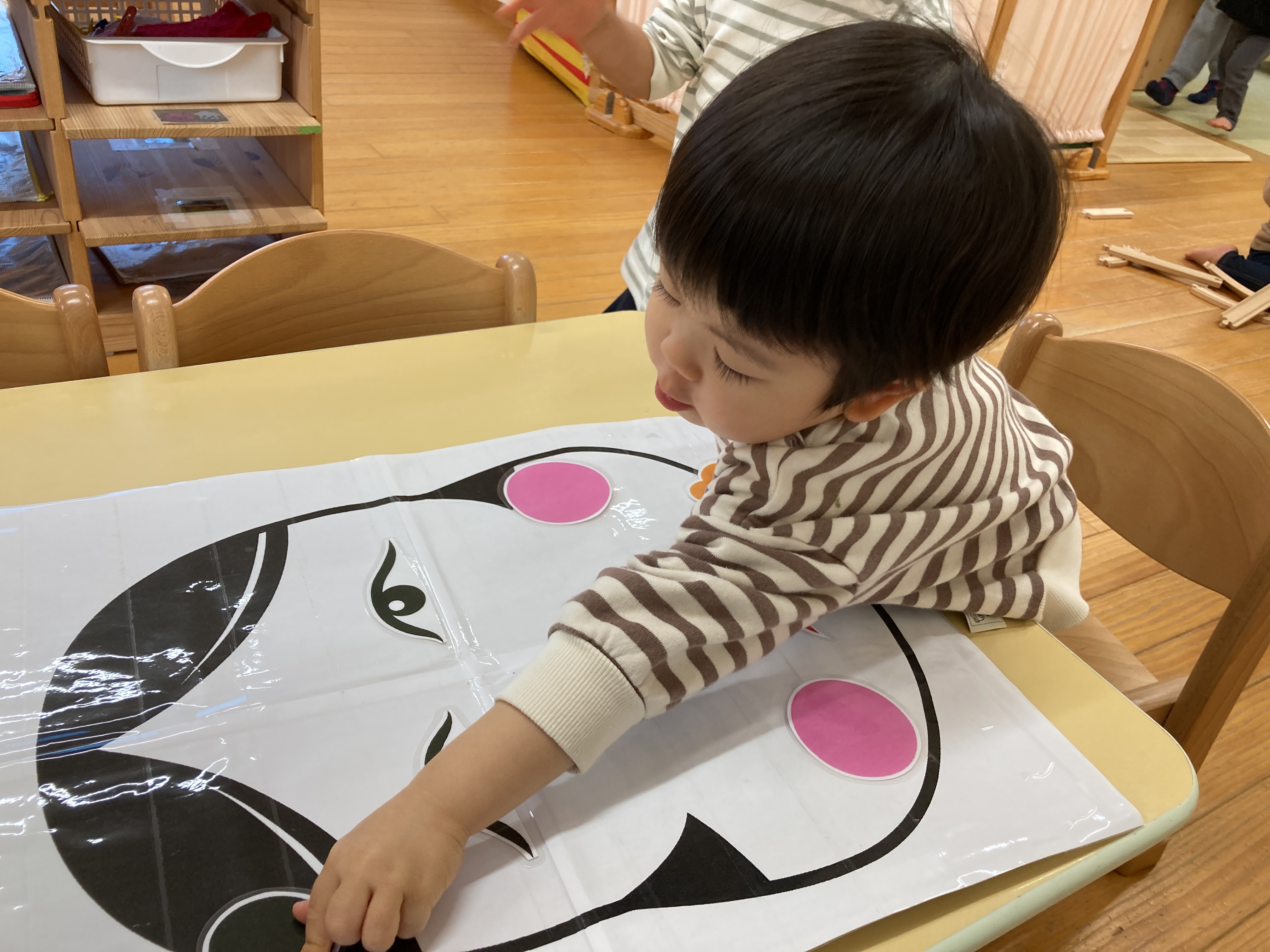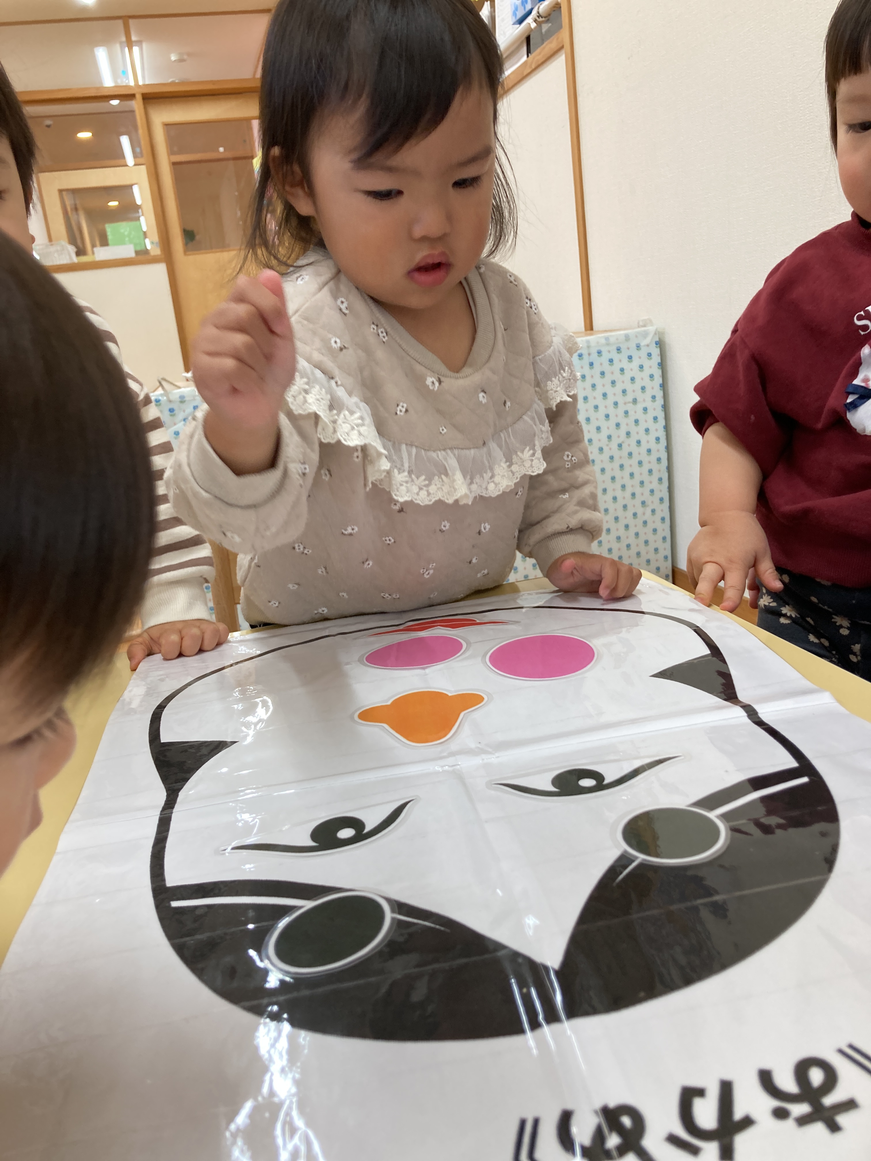 「これなんだろう?」「おめめどこかな?」などとお友だちと一緒にお話をしながらお顔を作って楽しんでいました!![]()