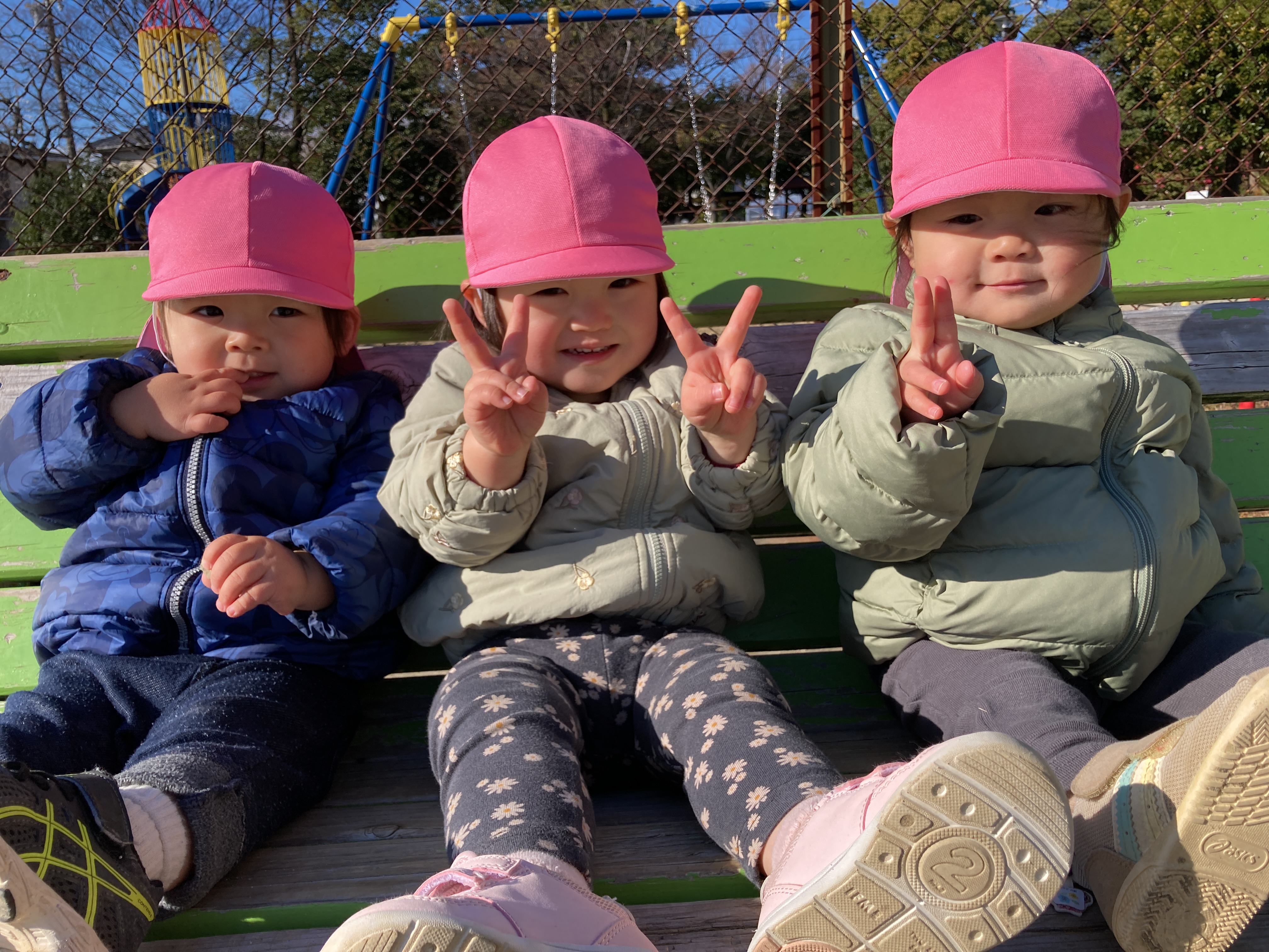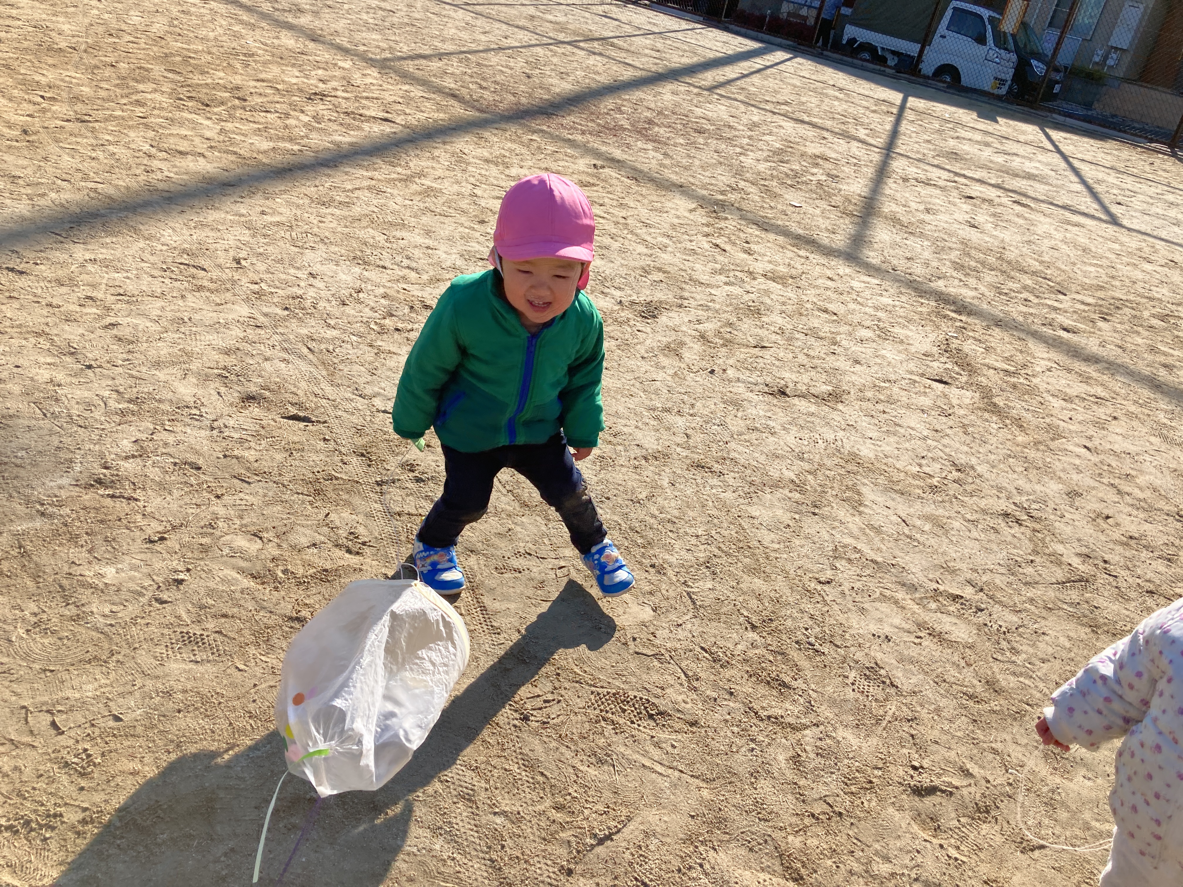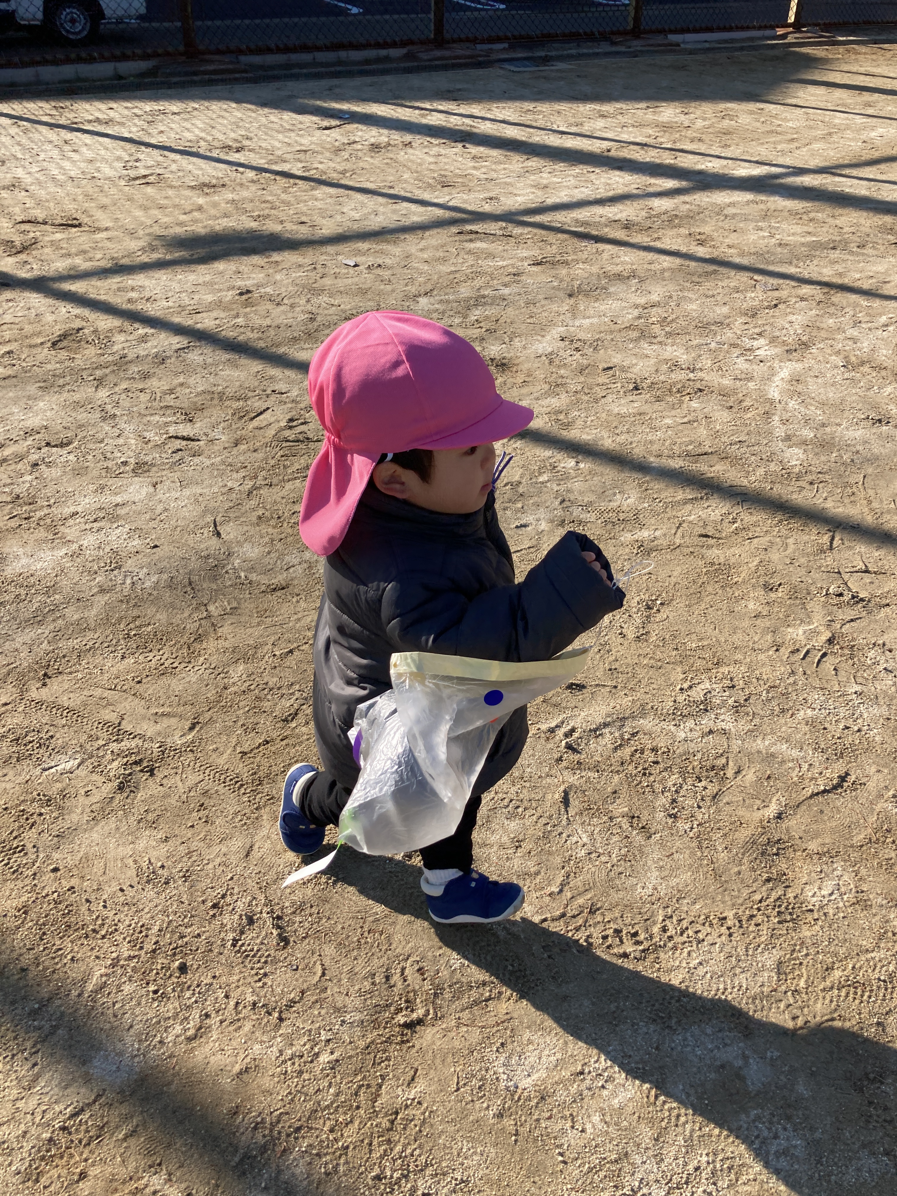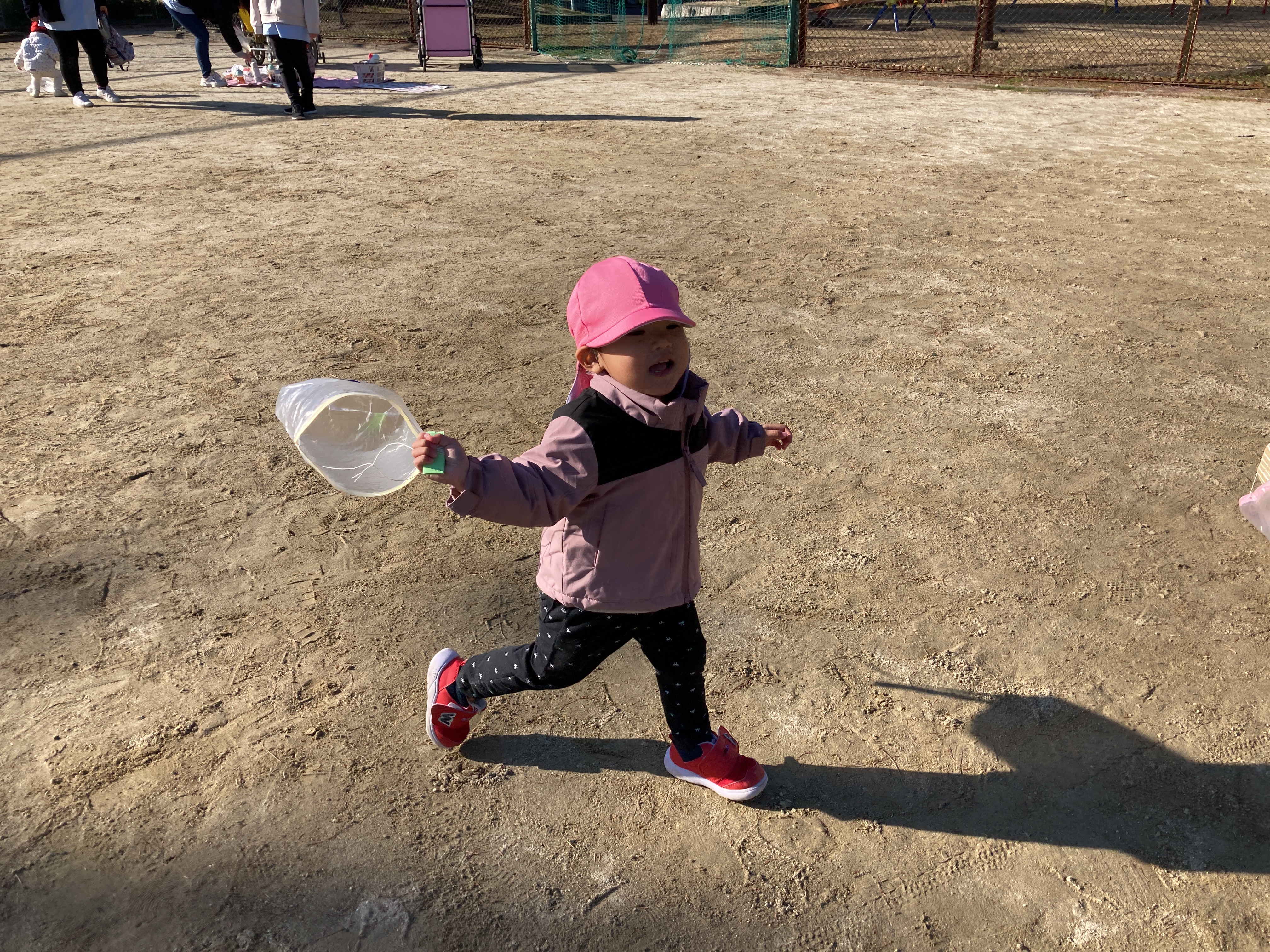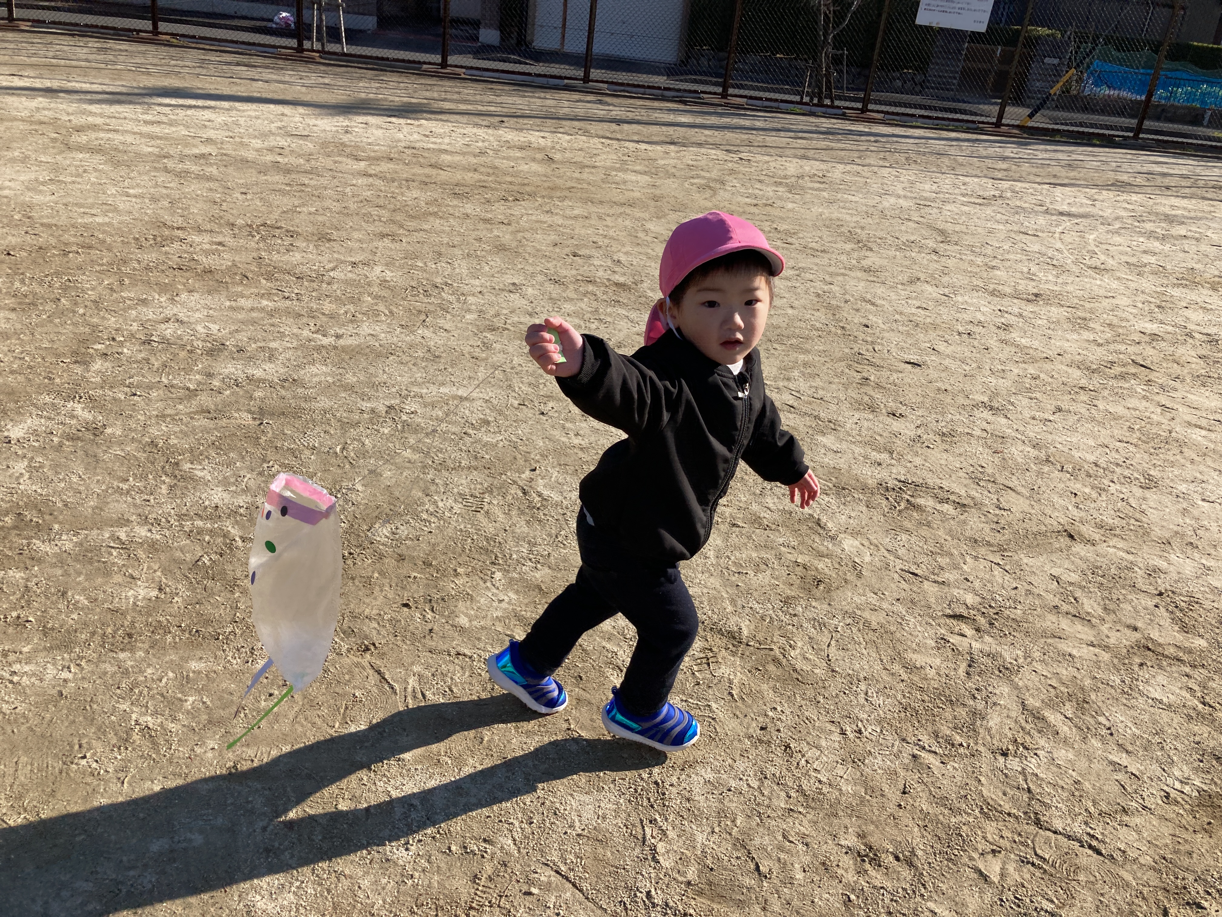 最初は「どうやるんだろう?」と不思議そうな様子でいっぱいでしたがお友だちや保育者がやっているのを見ると「ぼくも!」「わたしも!」と嬉しそうに凧揚げを始めました![]()