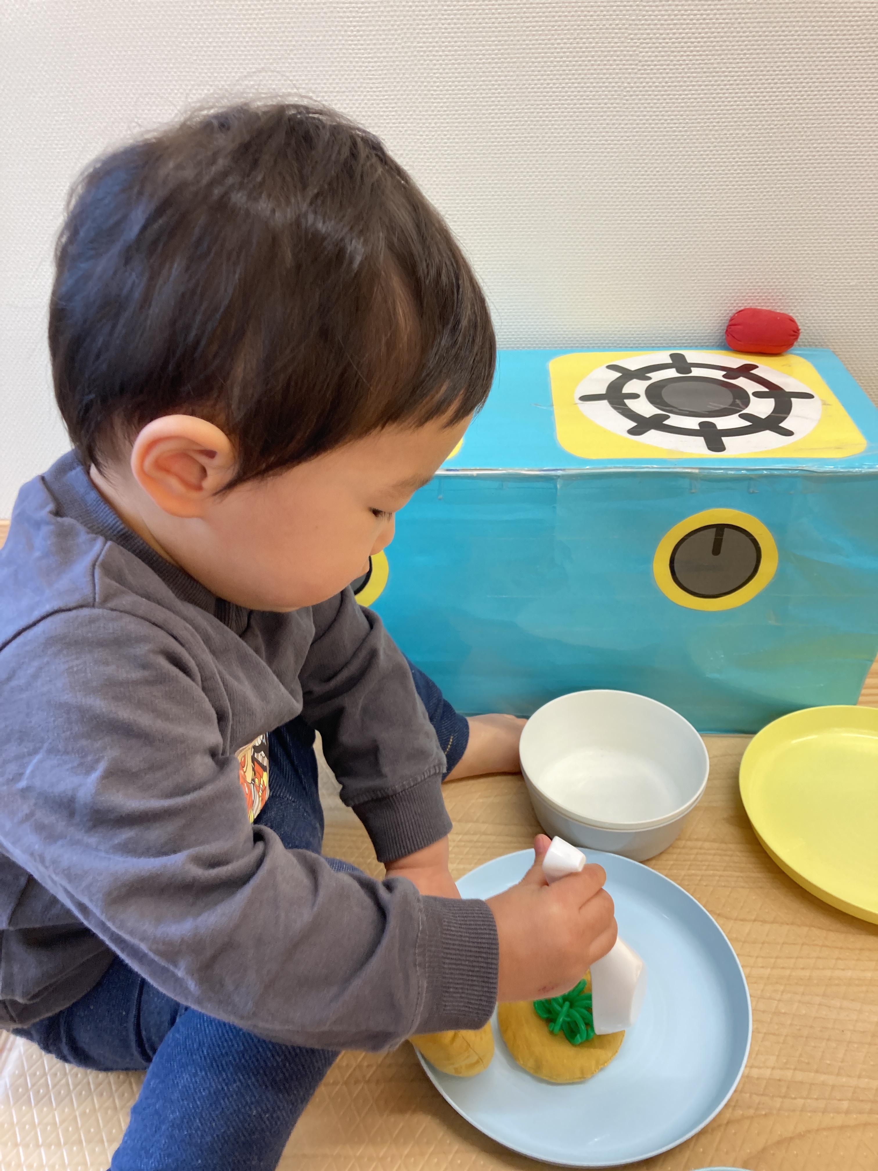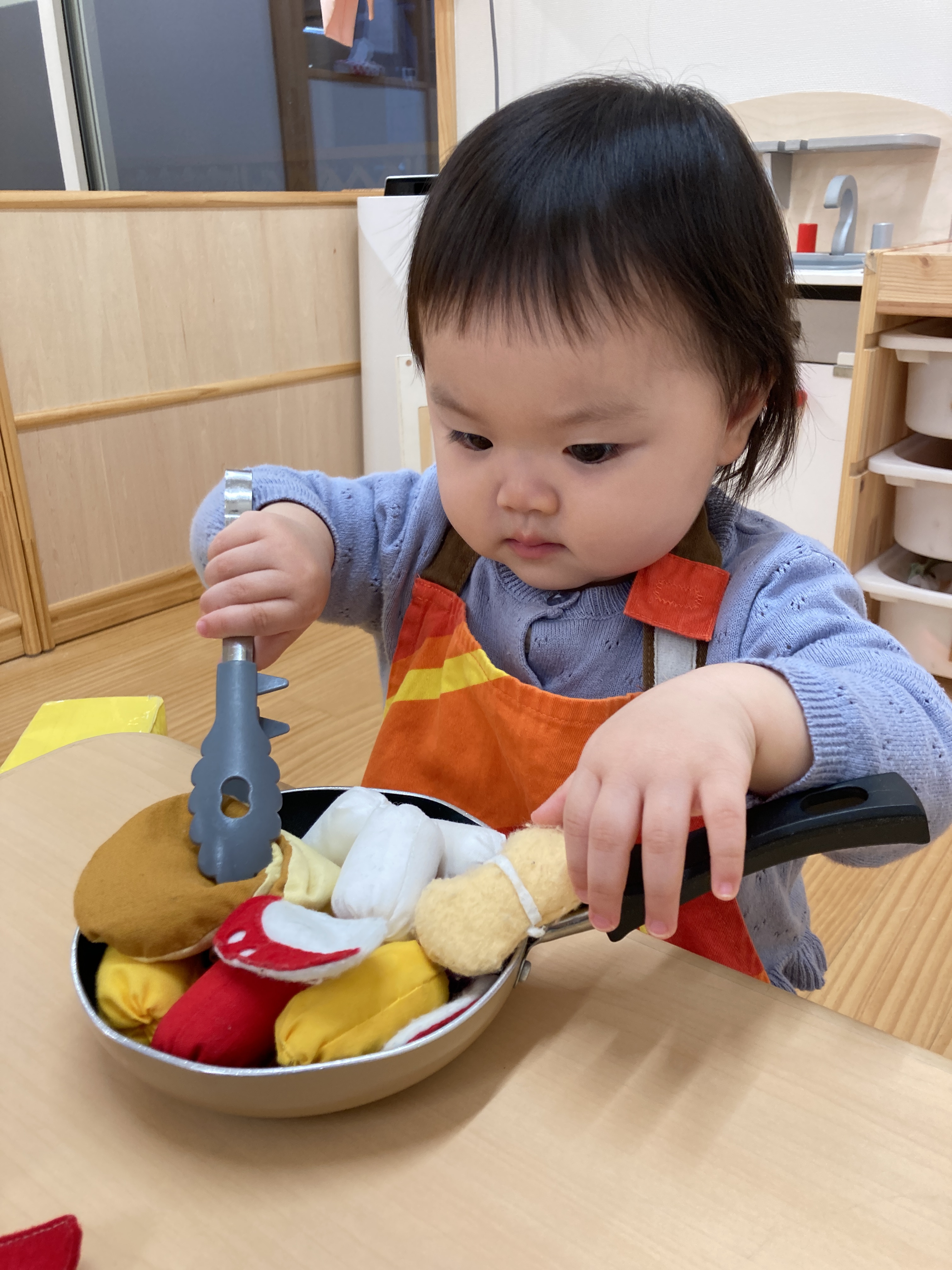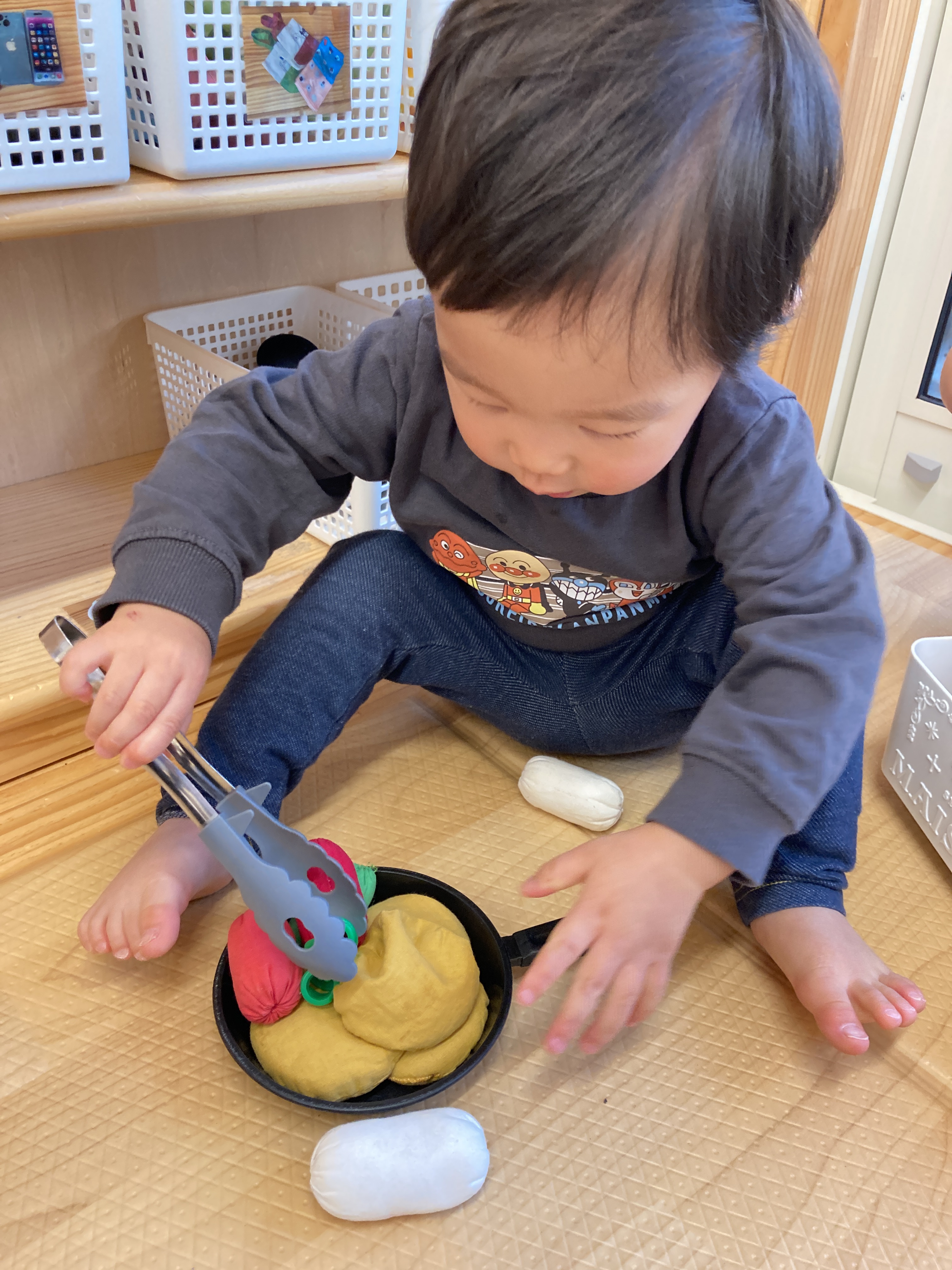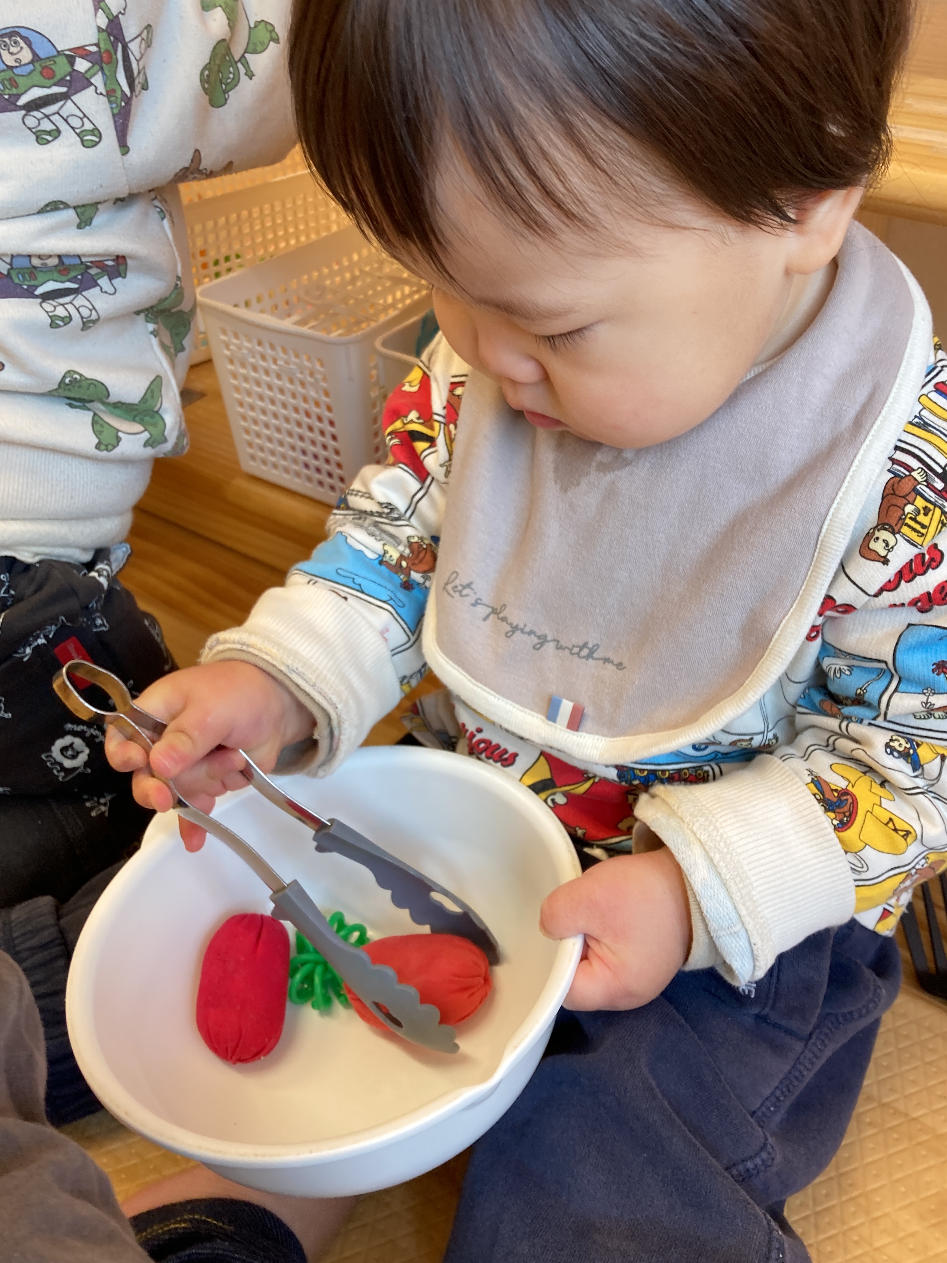 トングを使って具材を上手に掴めるようになったお友だちもいます![]()