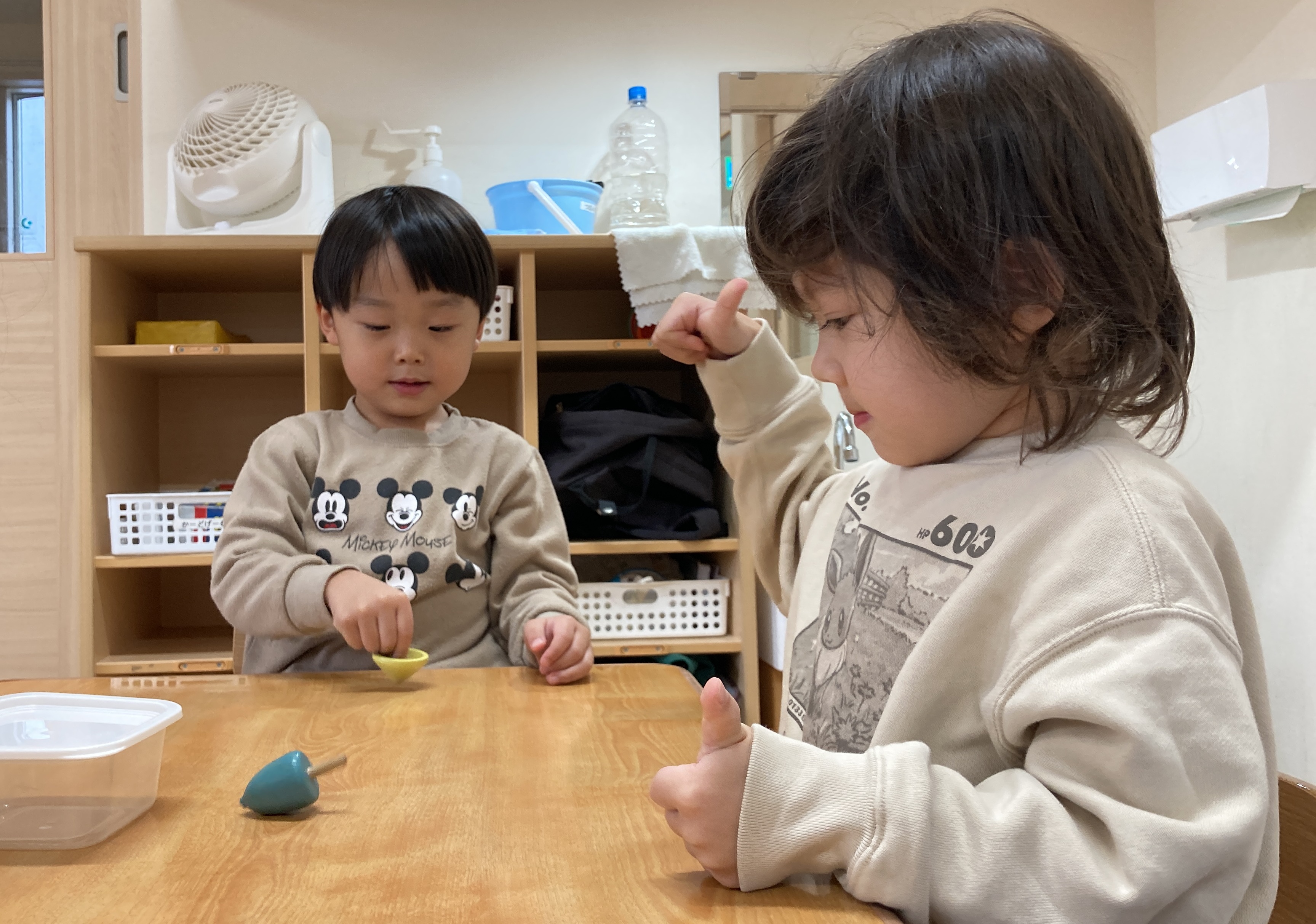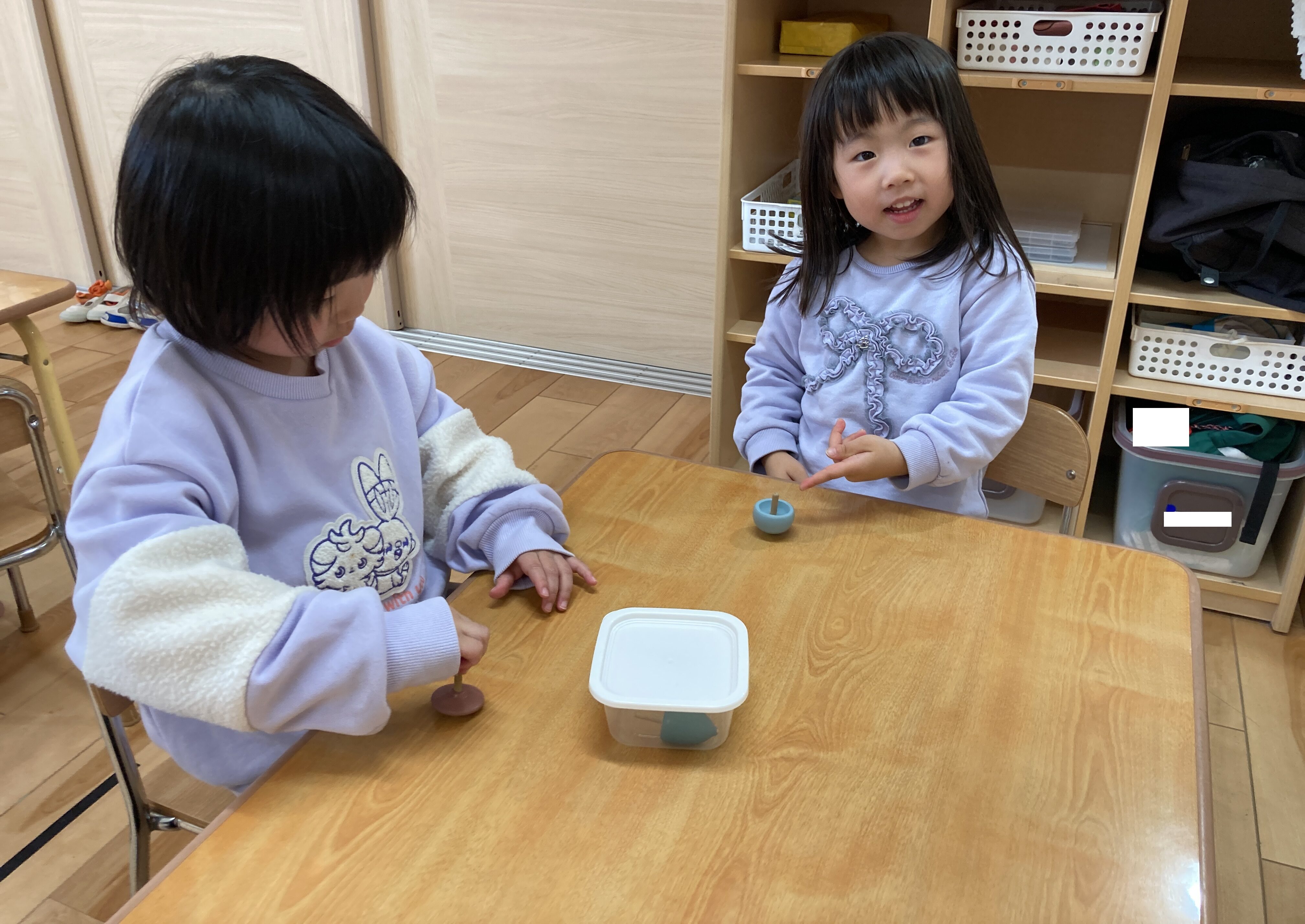 「細長いコマが一番難しい!」と奮闘中の子もいれば、「よ~い、どん!!」と友だち同士でコマ対決を始める子もいて、様々な楽しみ方が見られました