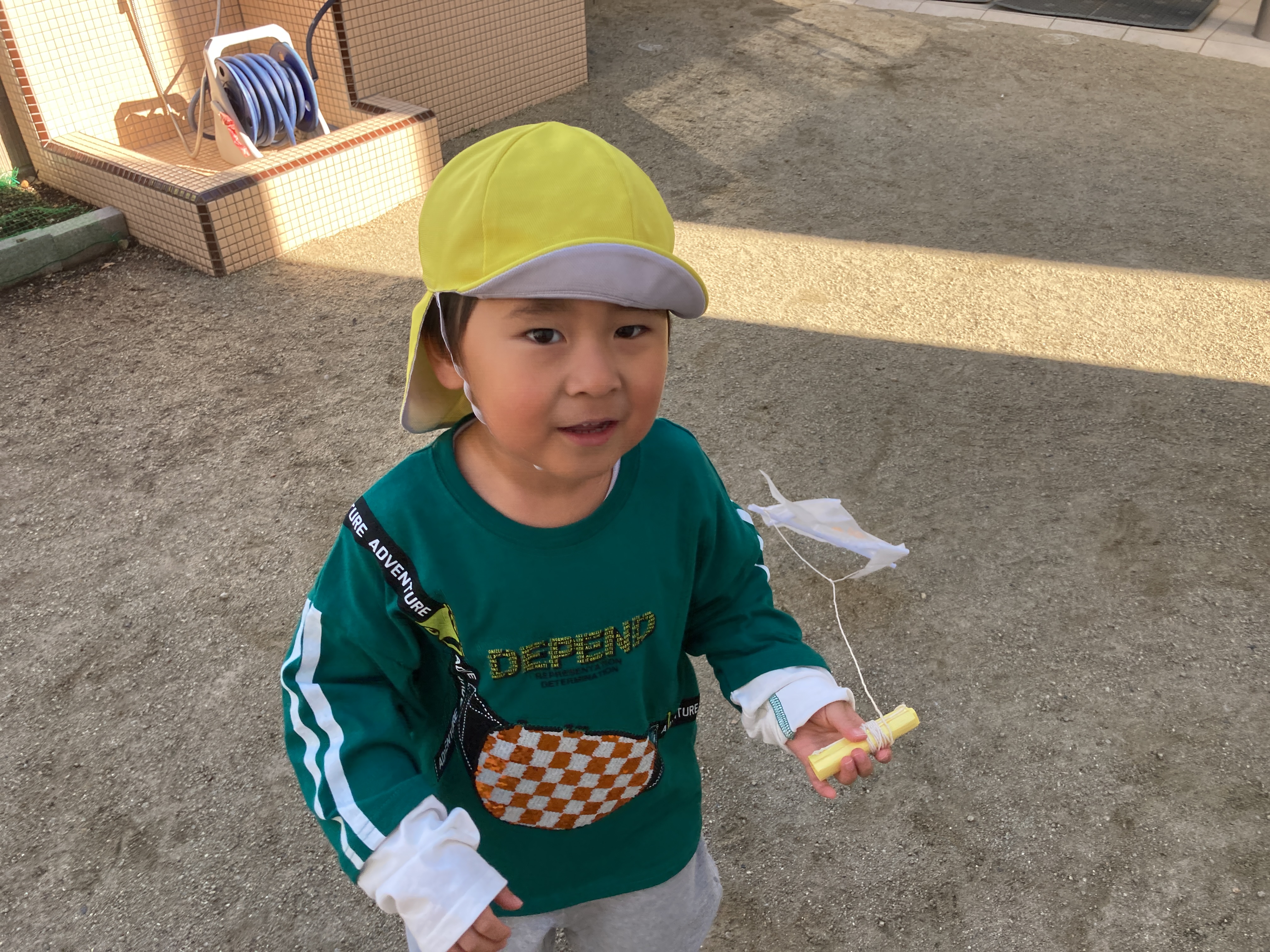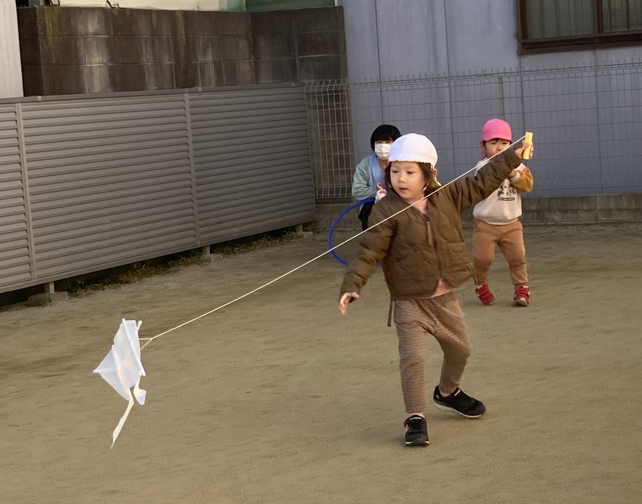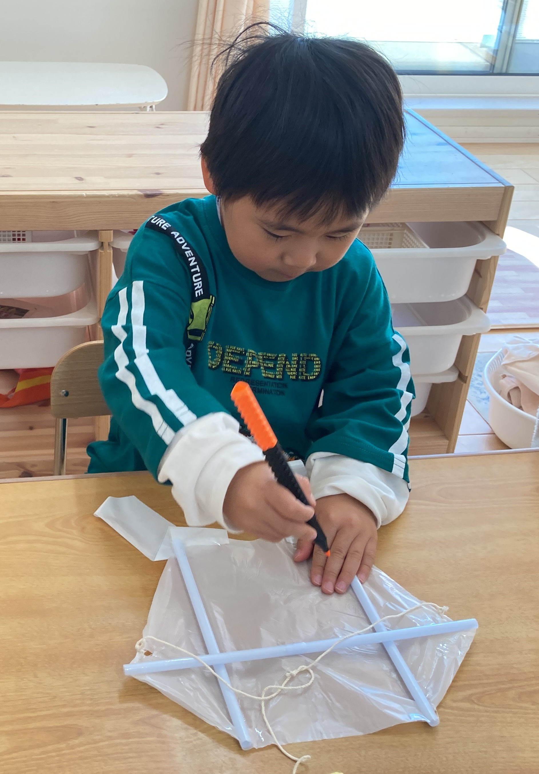たこあげはみんなすごく楽しみなようで、作っている時から「ぼくはこ~んなに高くまで飛ばせるよ!」「私はいっぱい走るよ!」と意気込んでいました