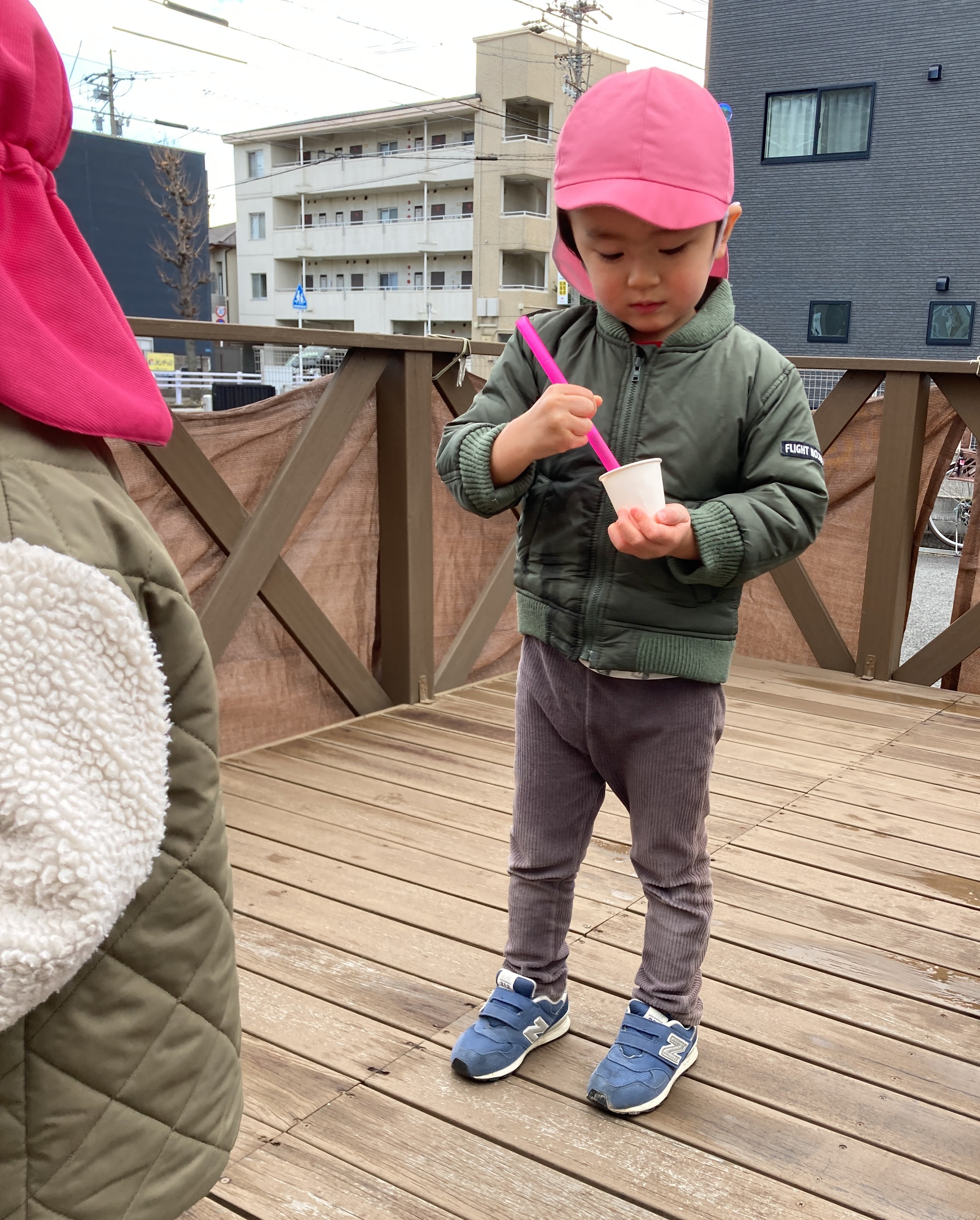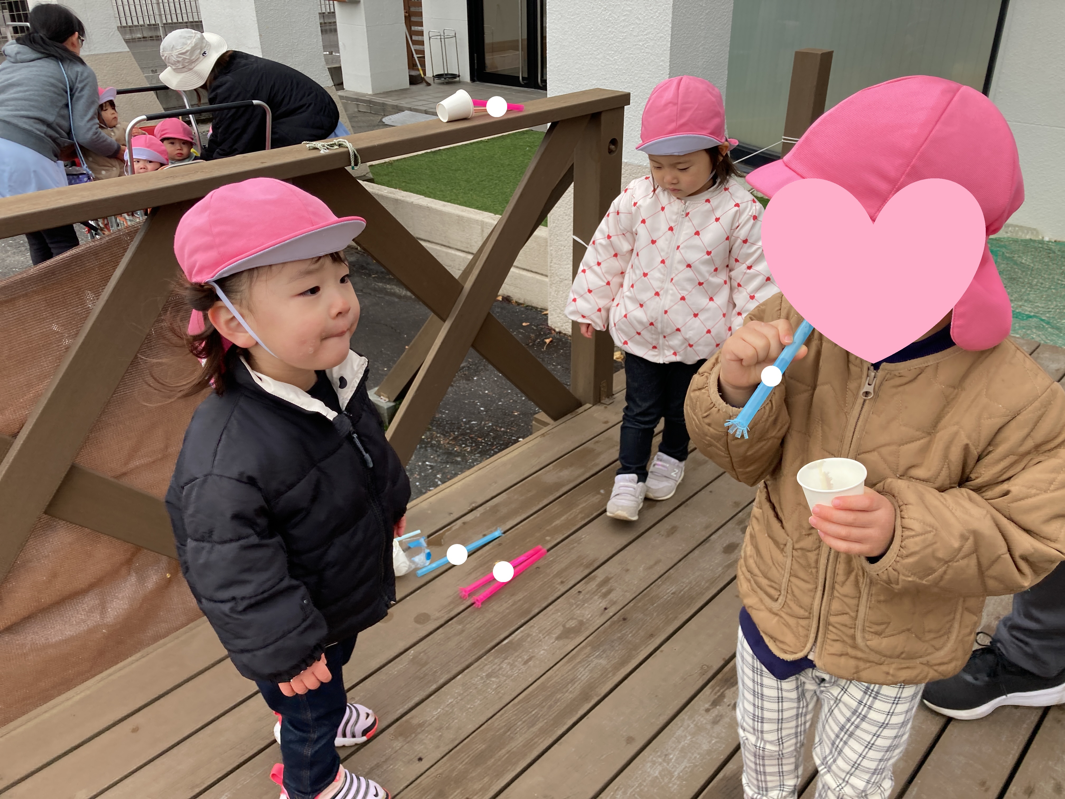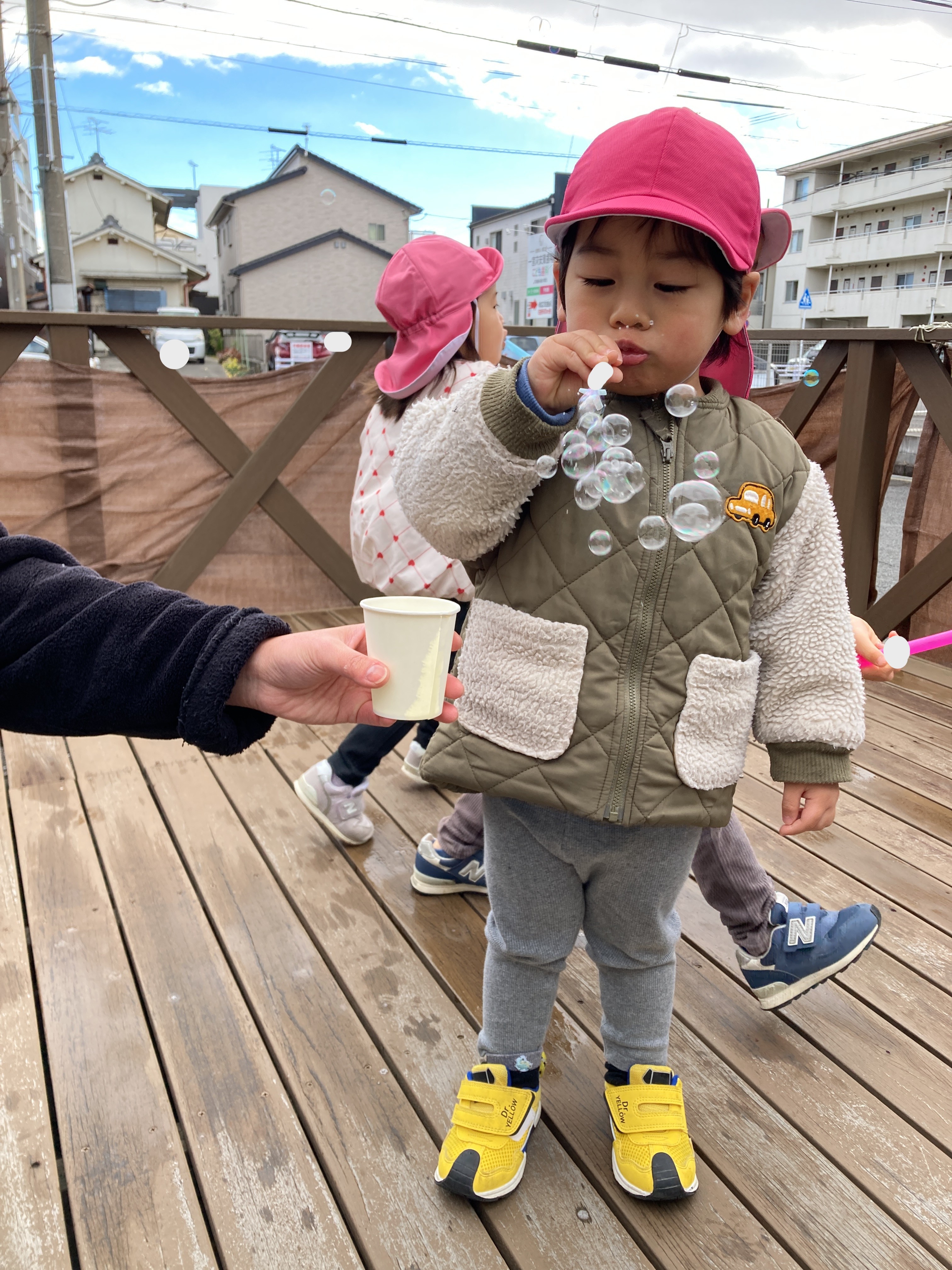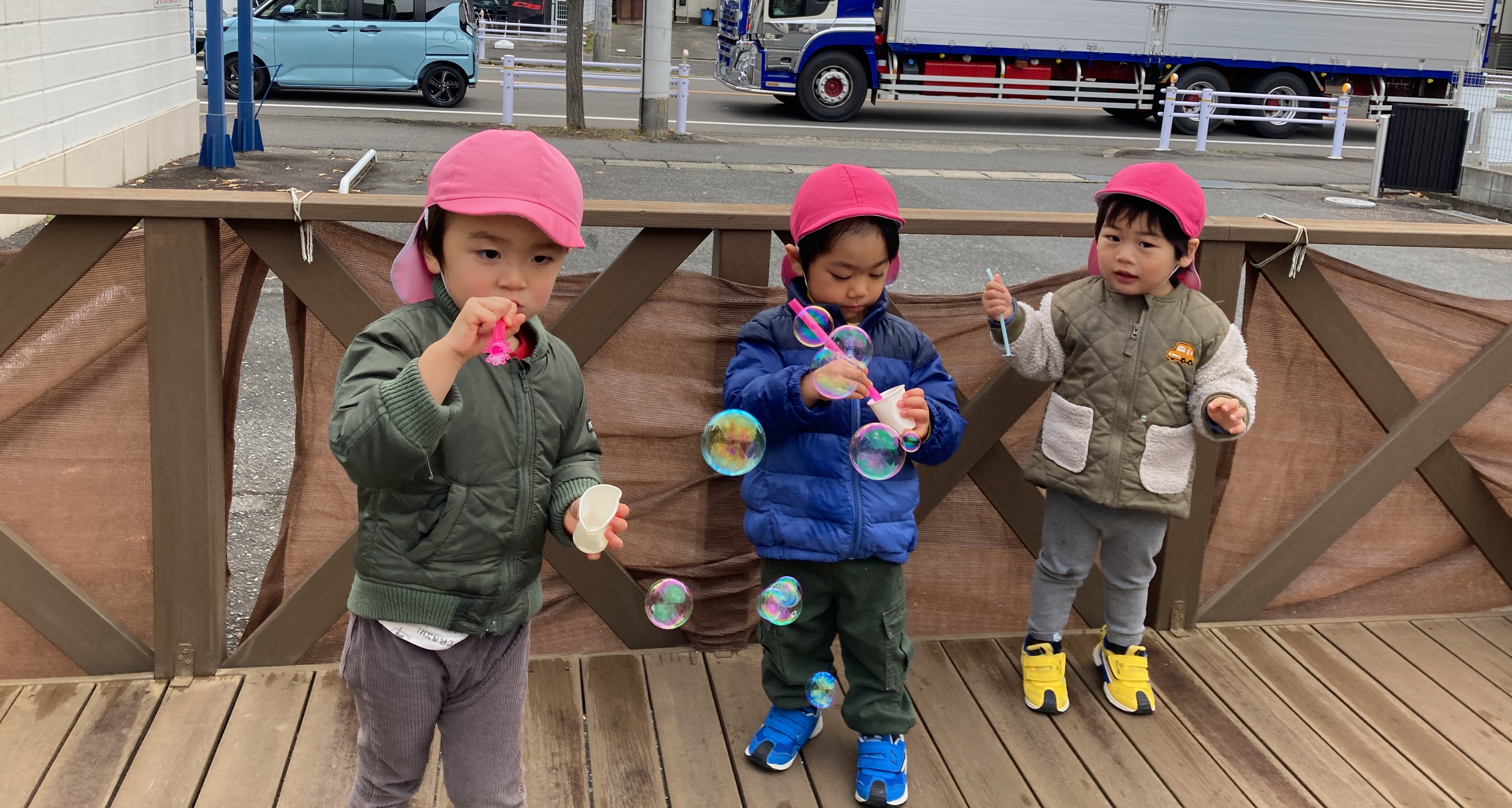 2歳児さんは、園では初めてのシャボン玉!保育士が見本を見せると、目を輝かせながら興味津々で挑戦していましたよ
