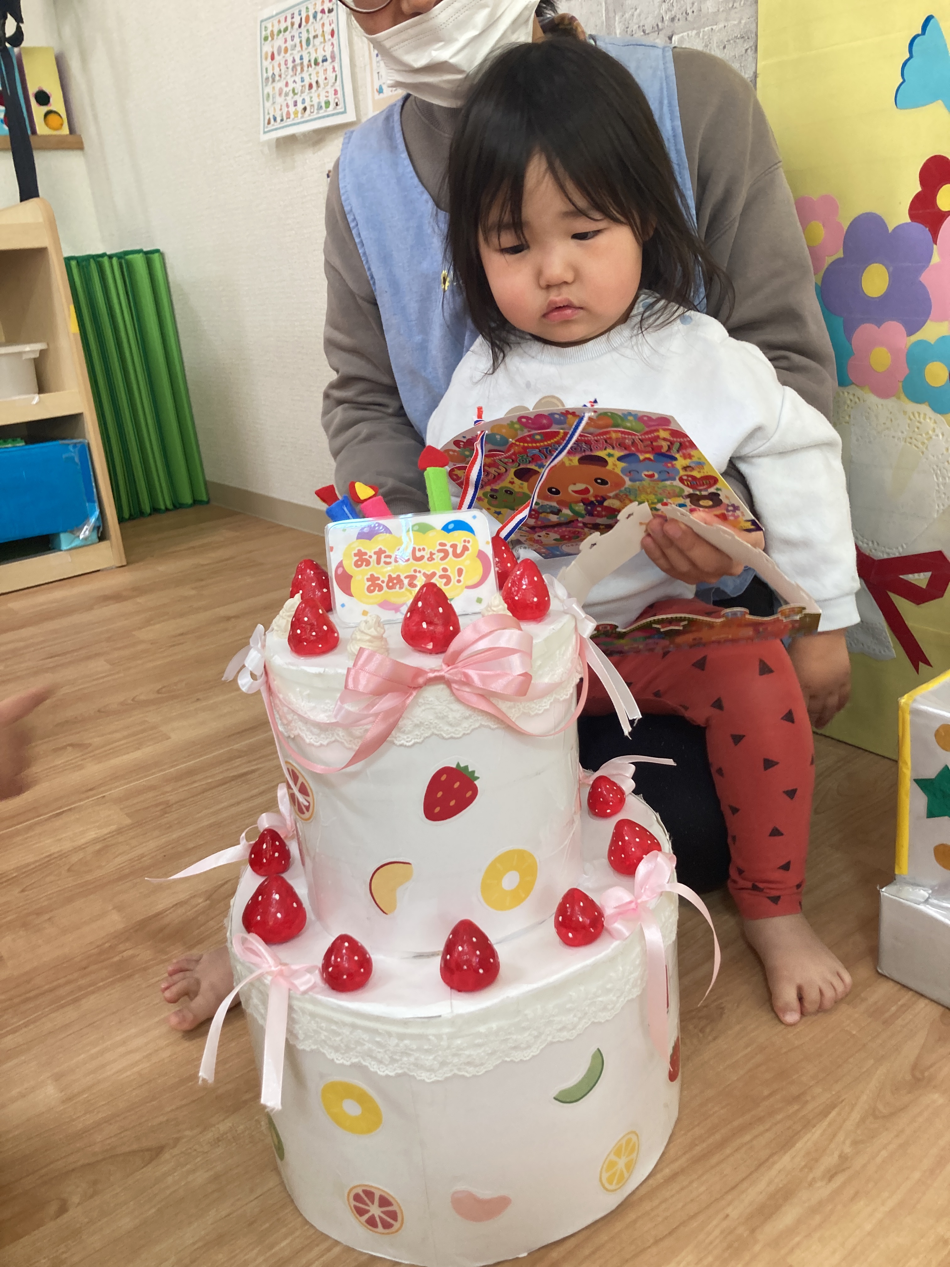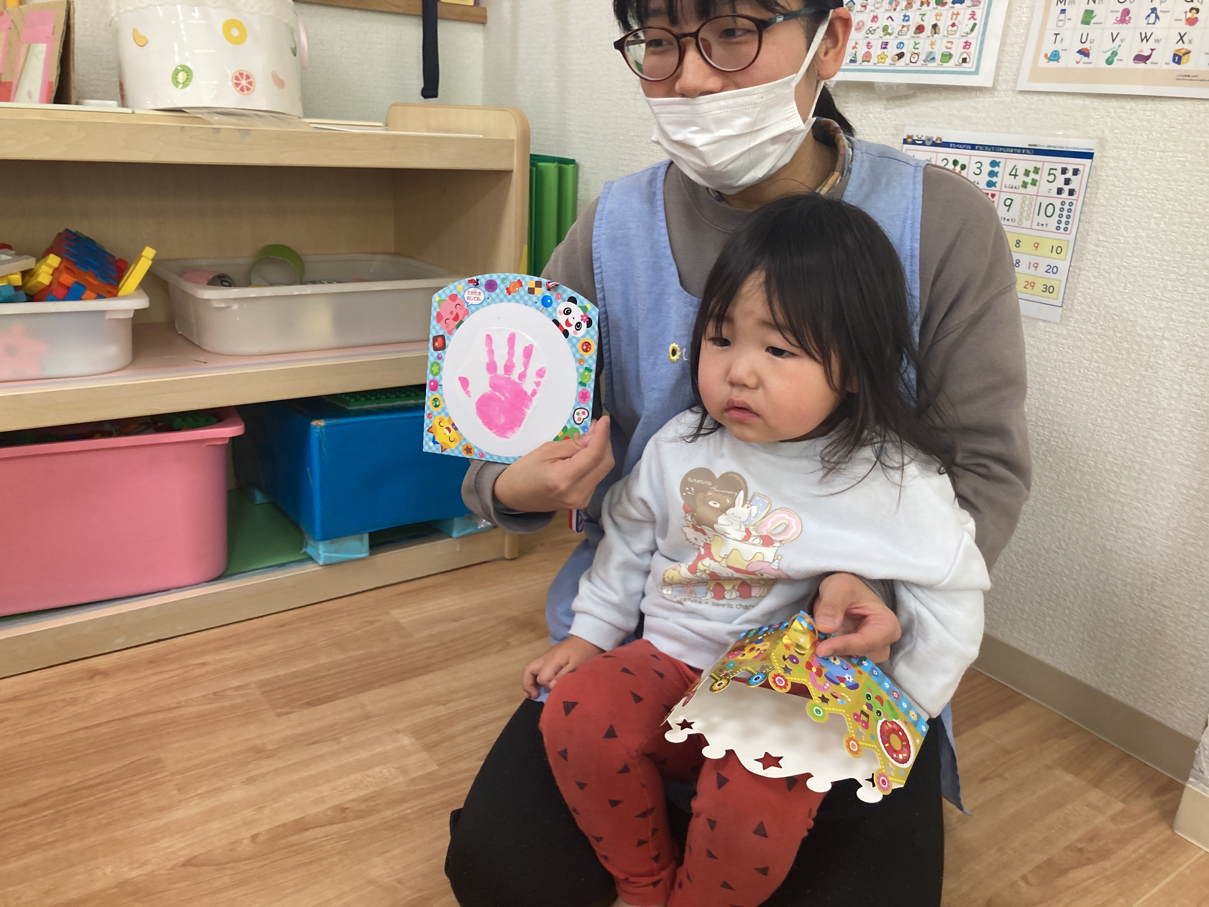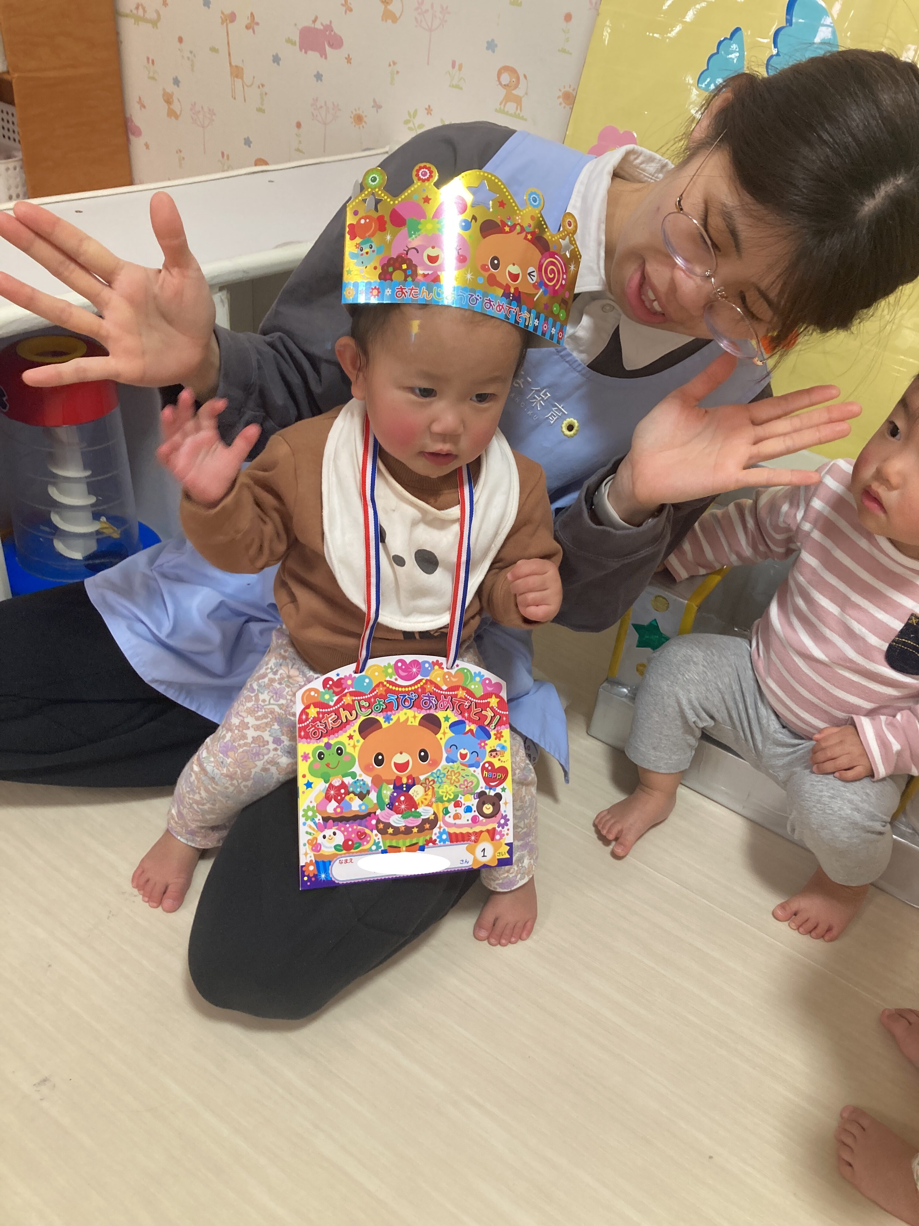 お友だちから冠と誕生日カードを受け取ってニコニコ笑顔です。