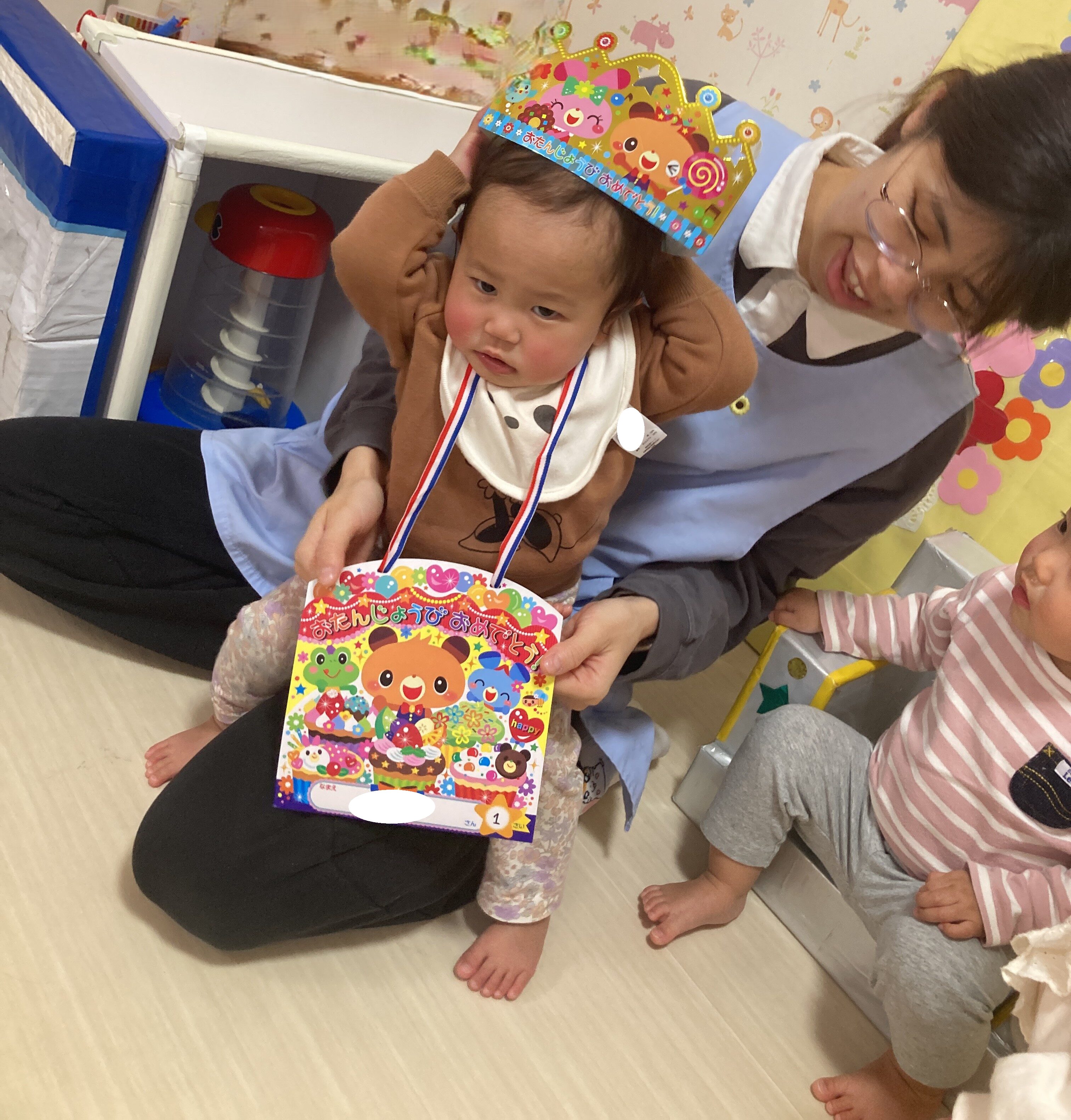 お友だちから冠と誕生日カードを受け取ってニコニコ笑顔です。