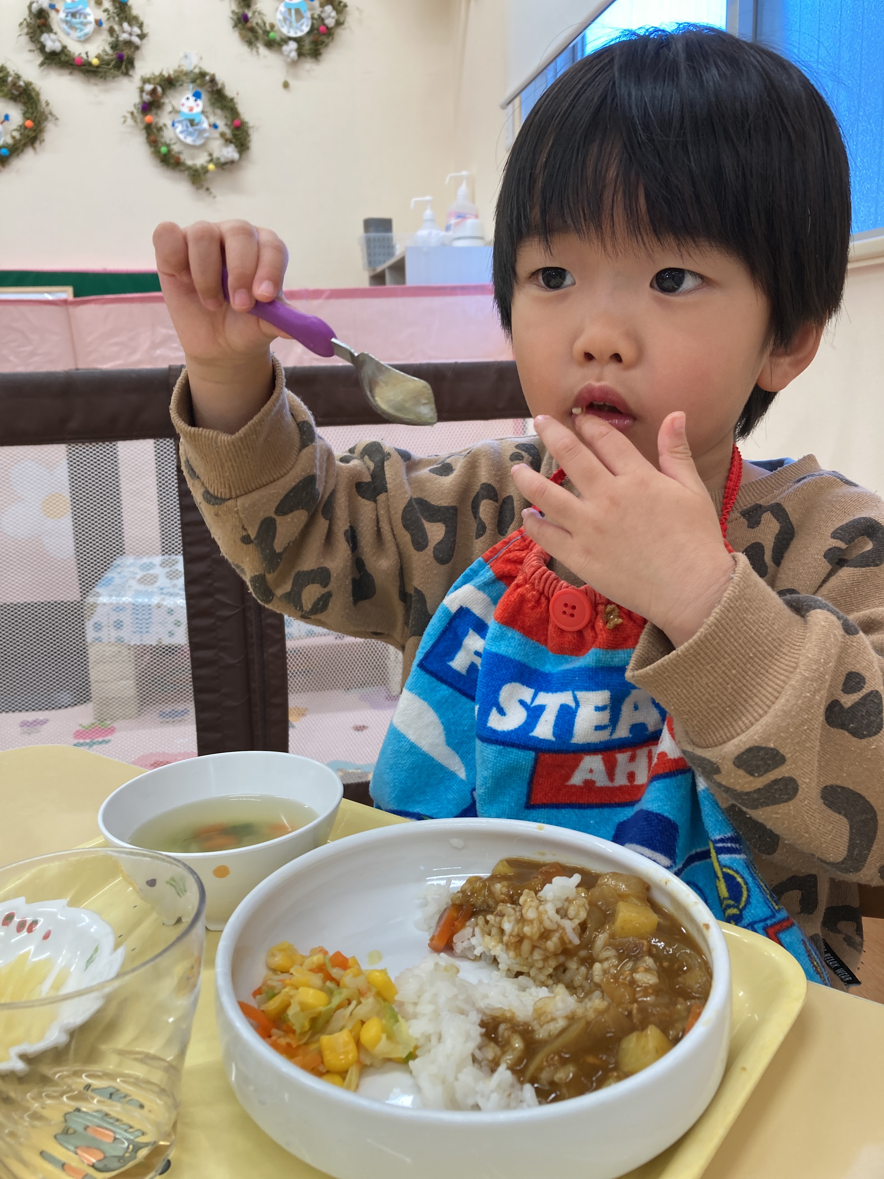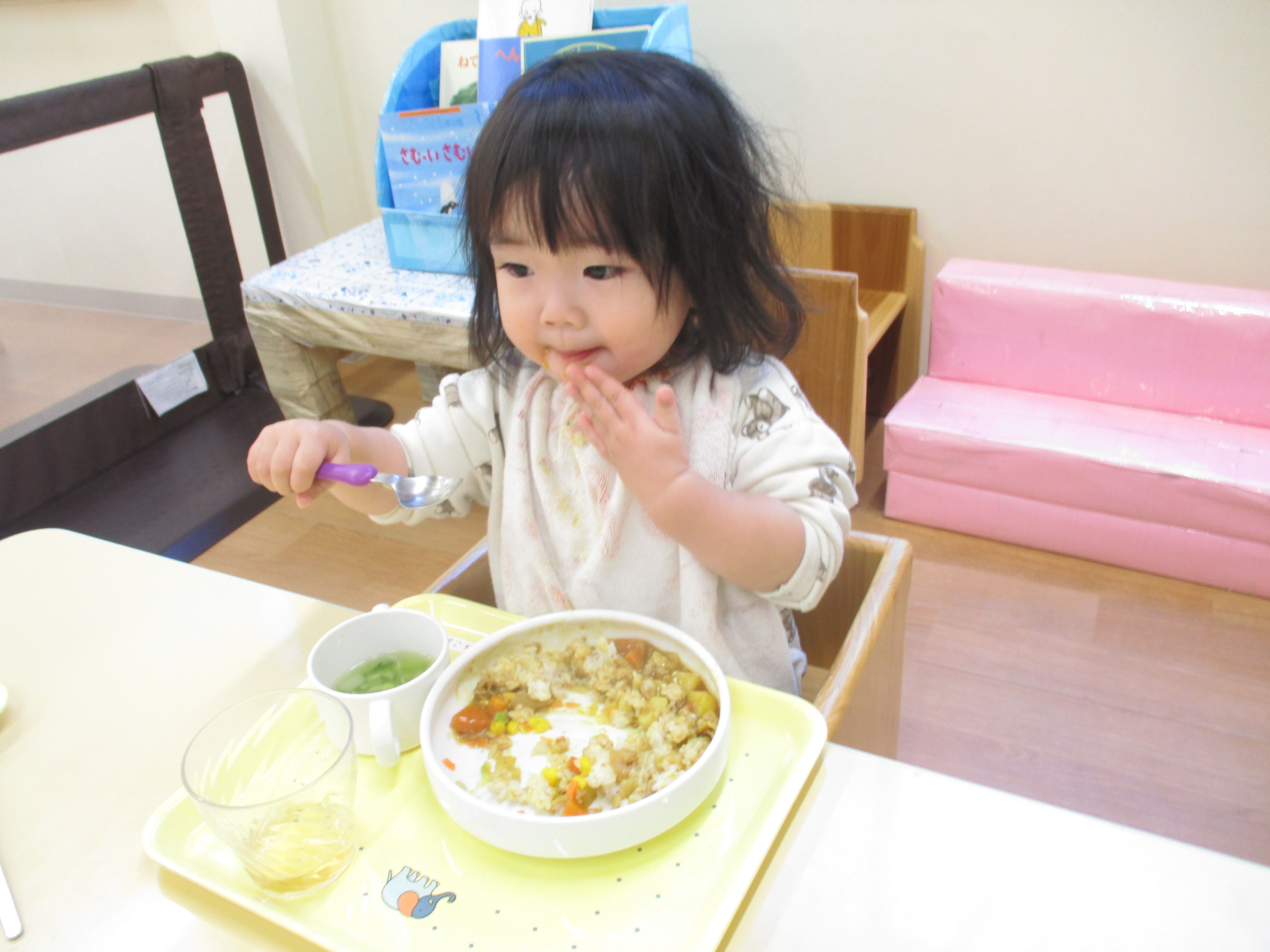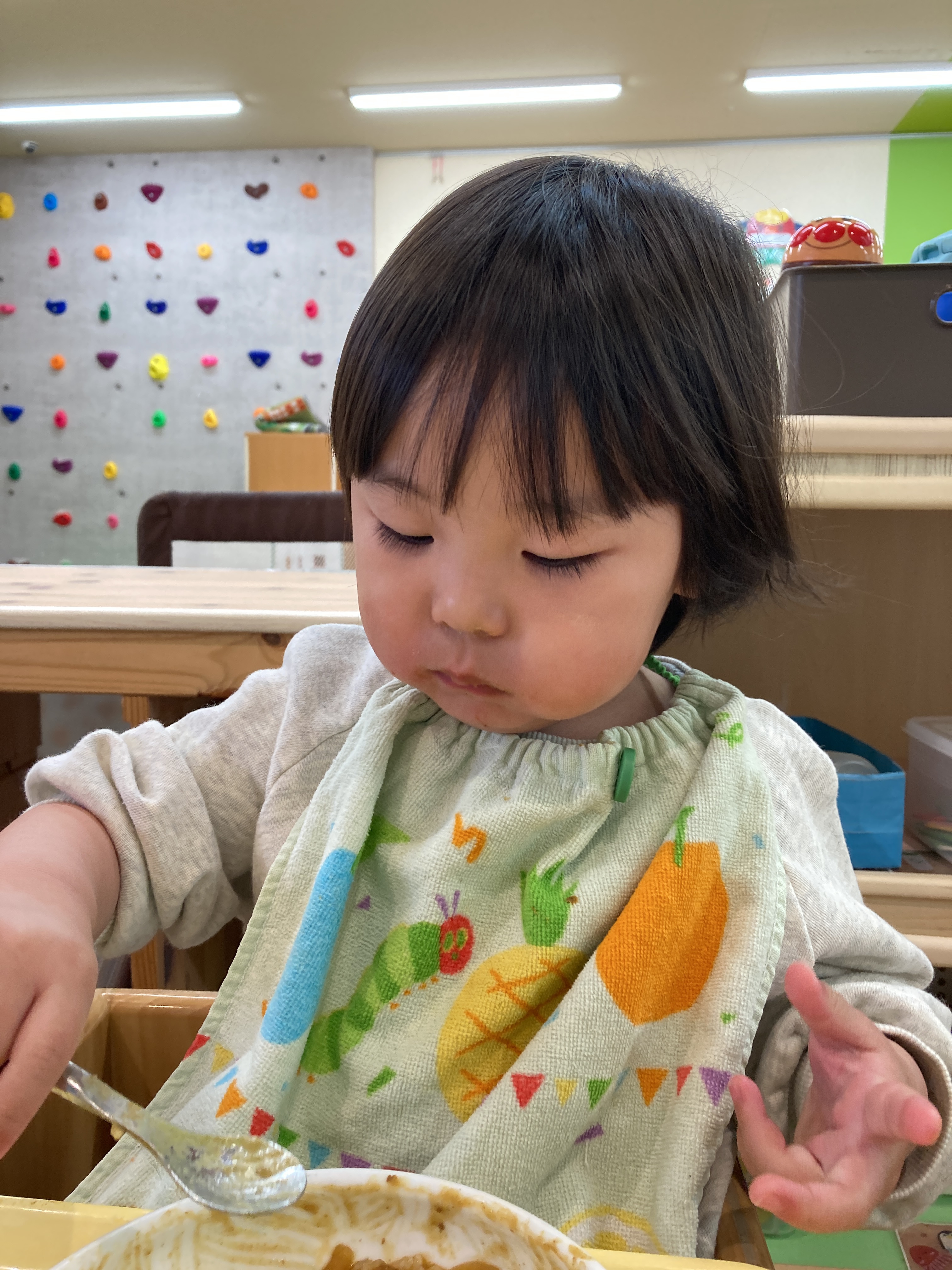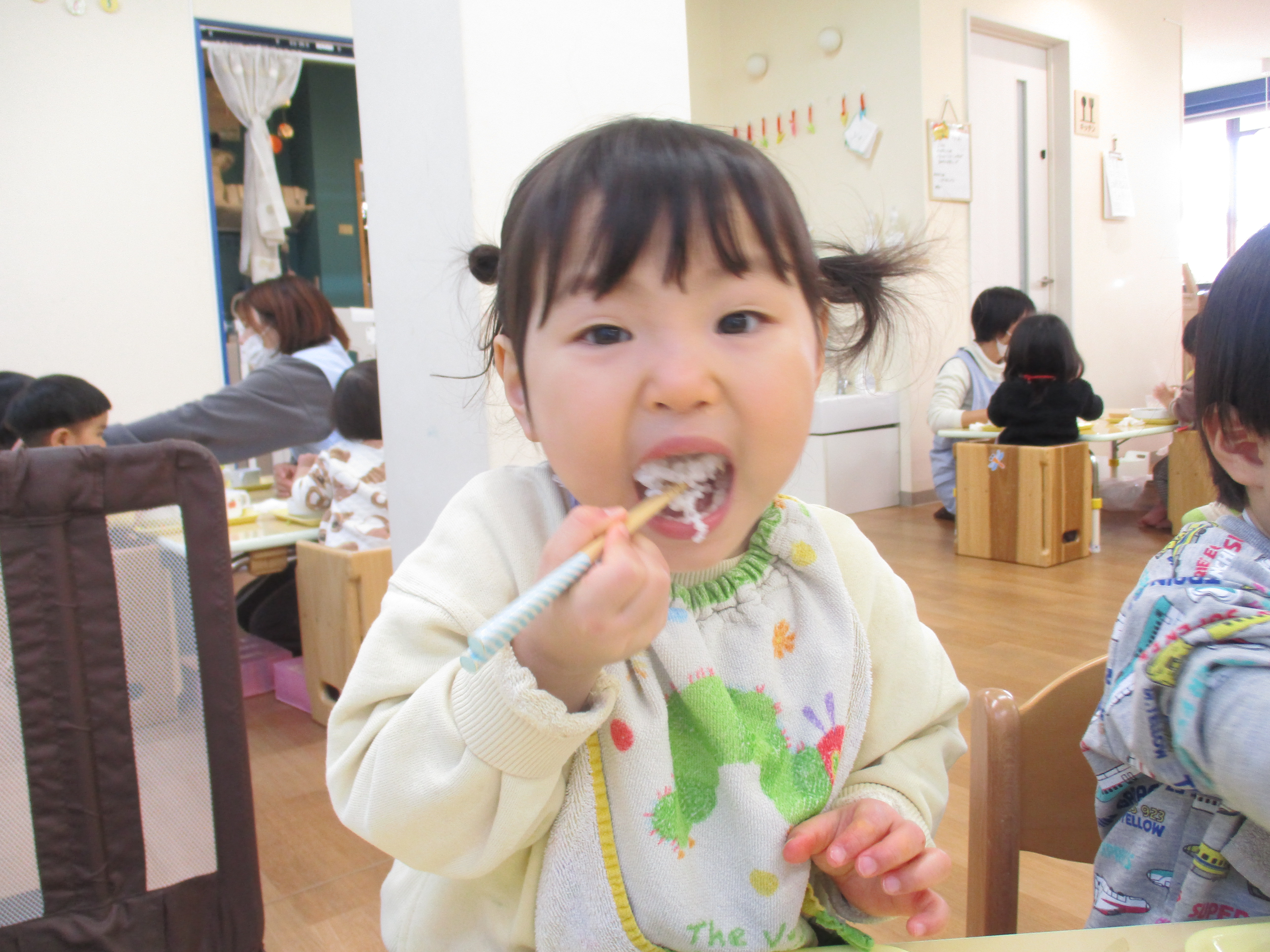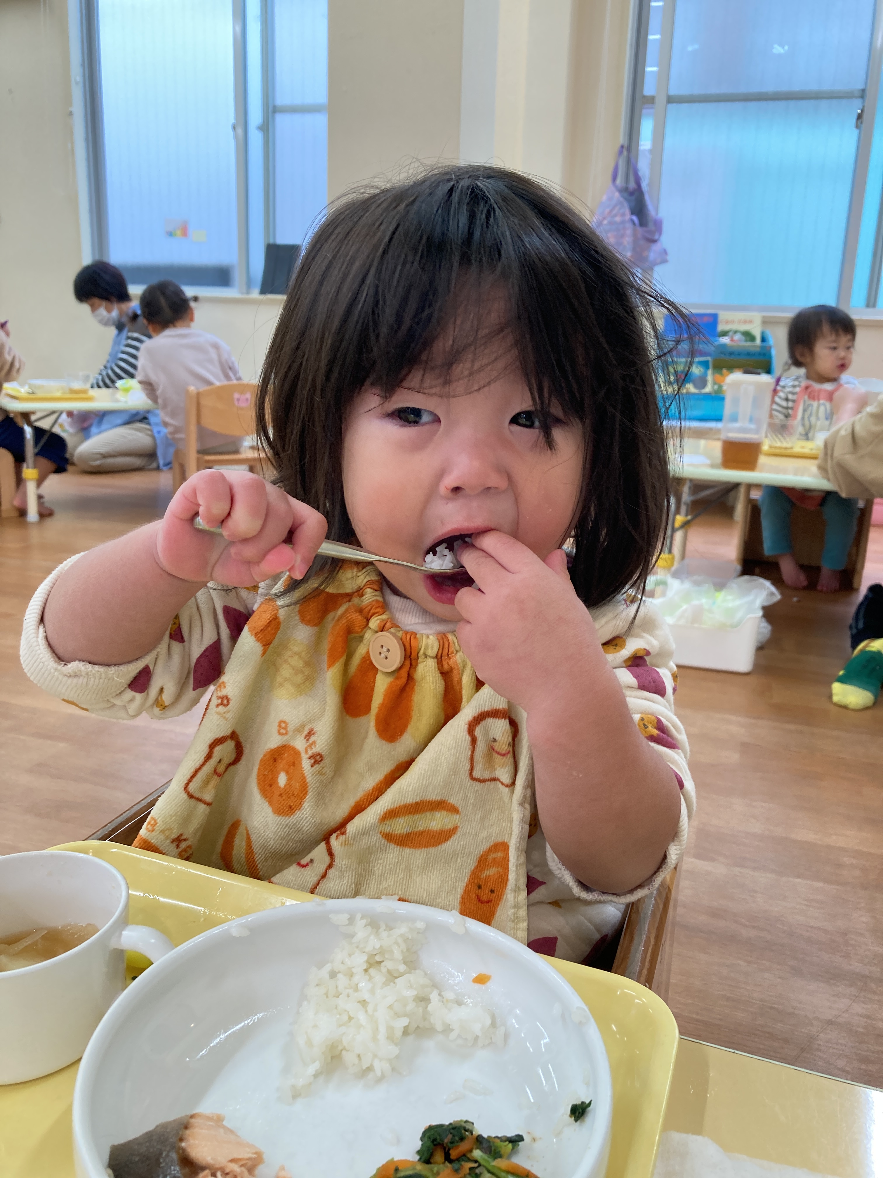 入園当初と比べると今ではしっかりとスプーンを握ってお口に運べるようになってきました![]()
