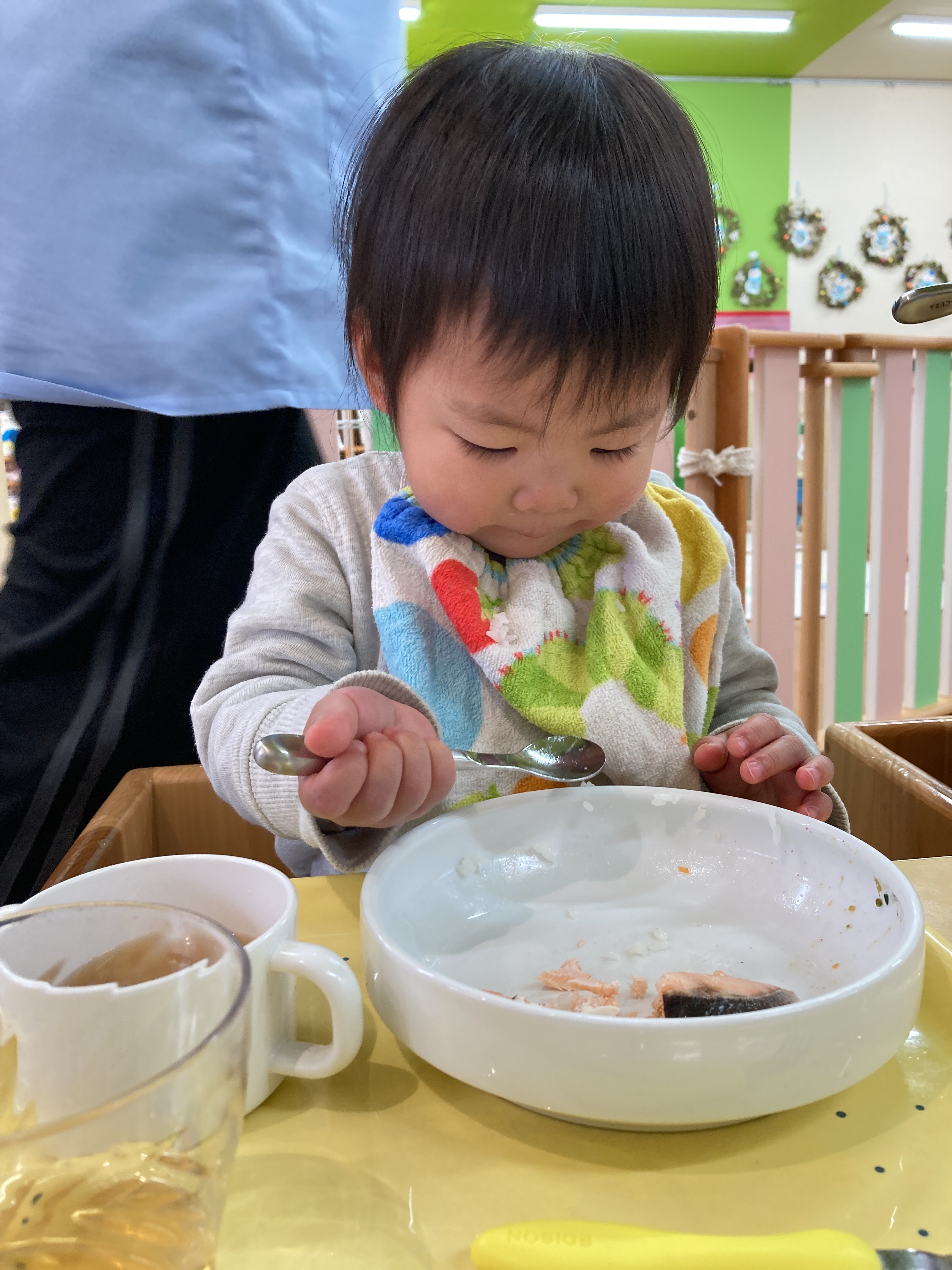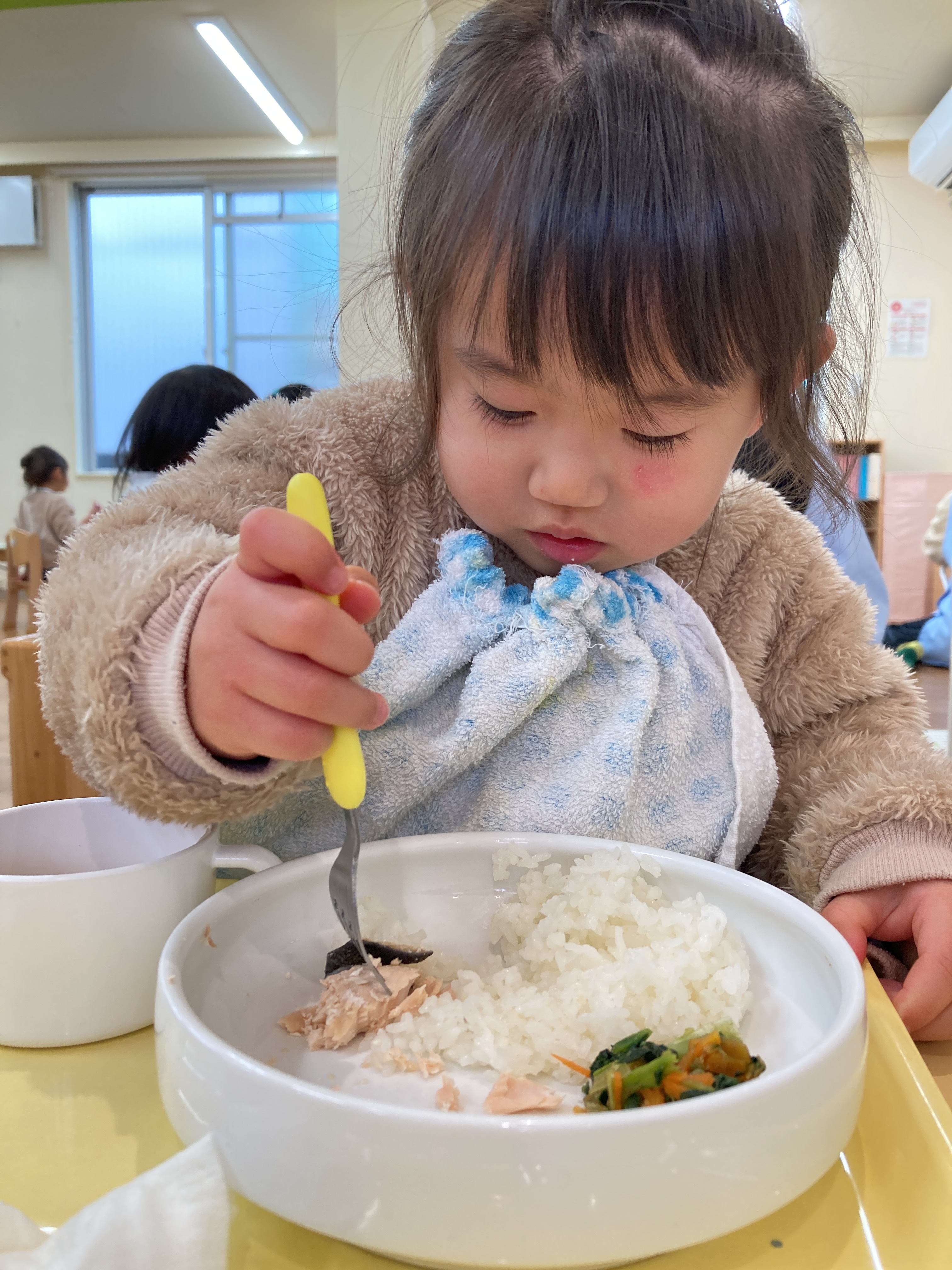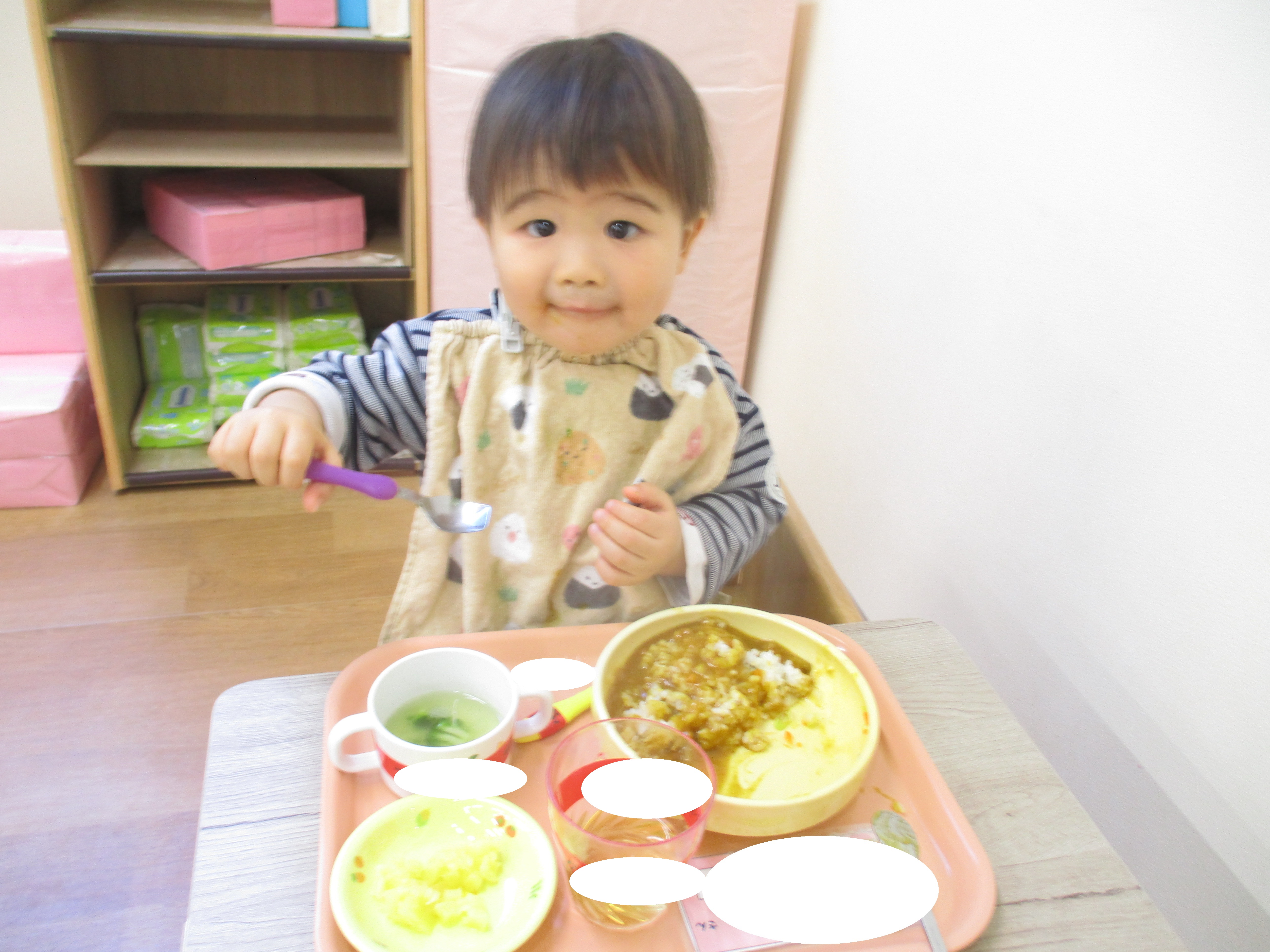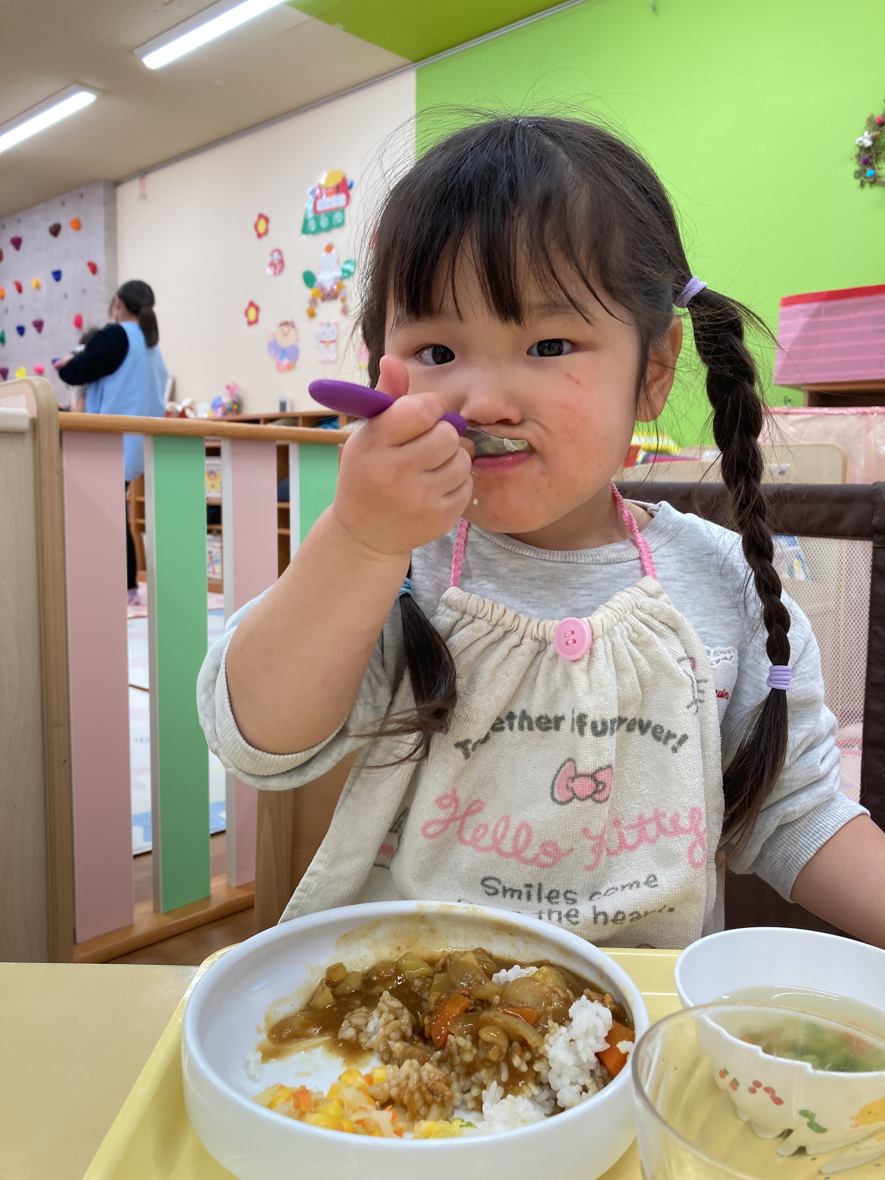 入園当初と比べると今ではしっかりとスプーンを握ってお口に運べるようになってきました![]()
