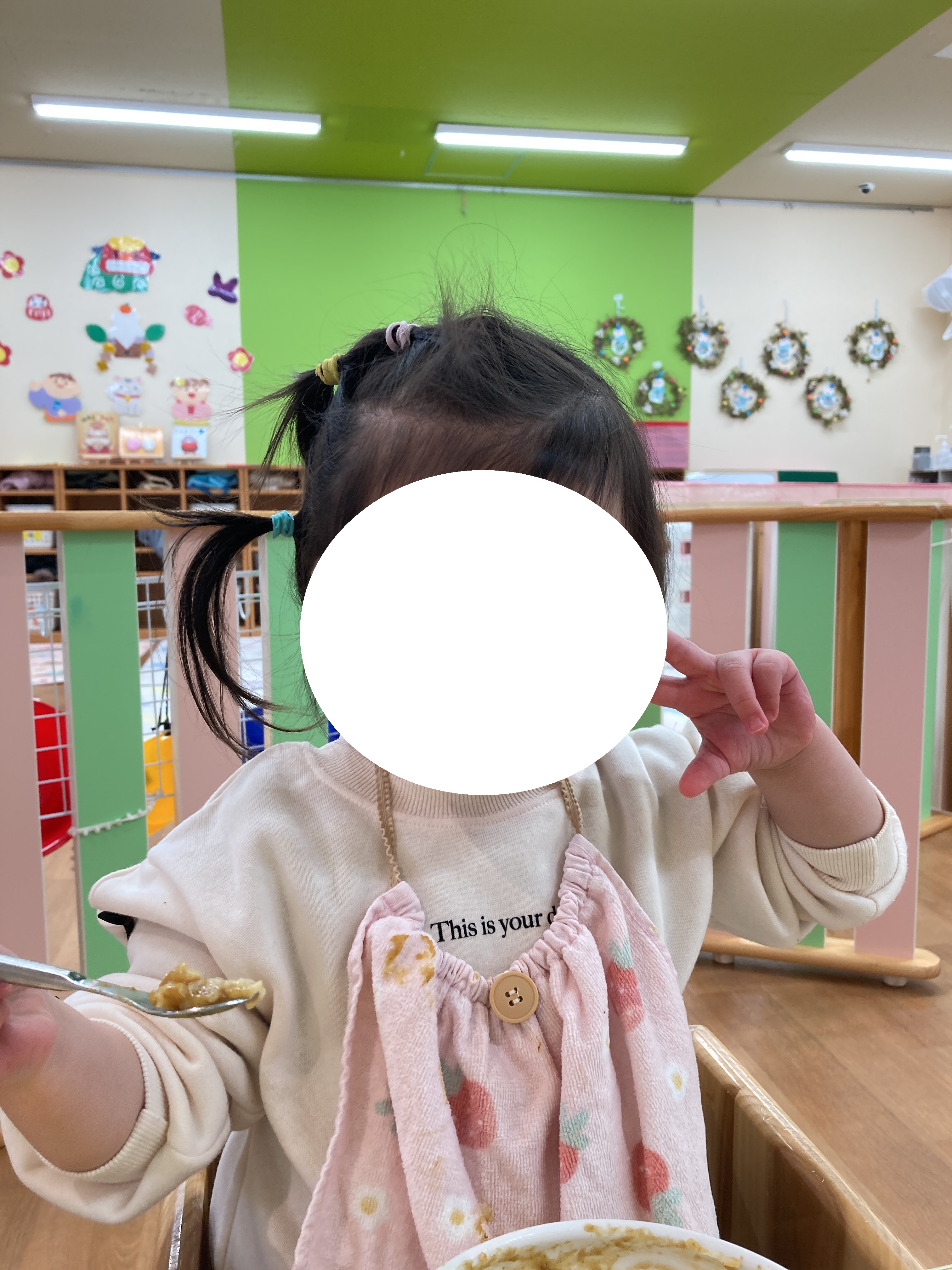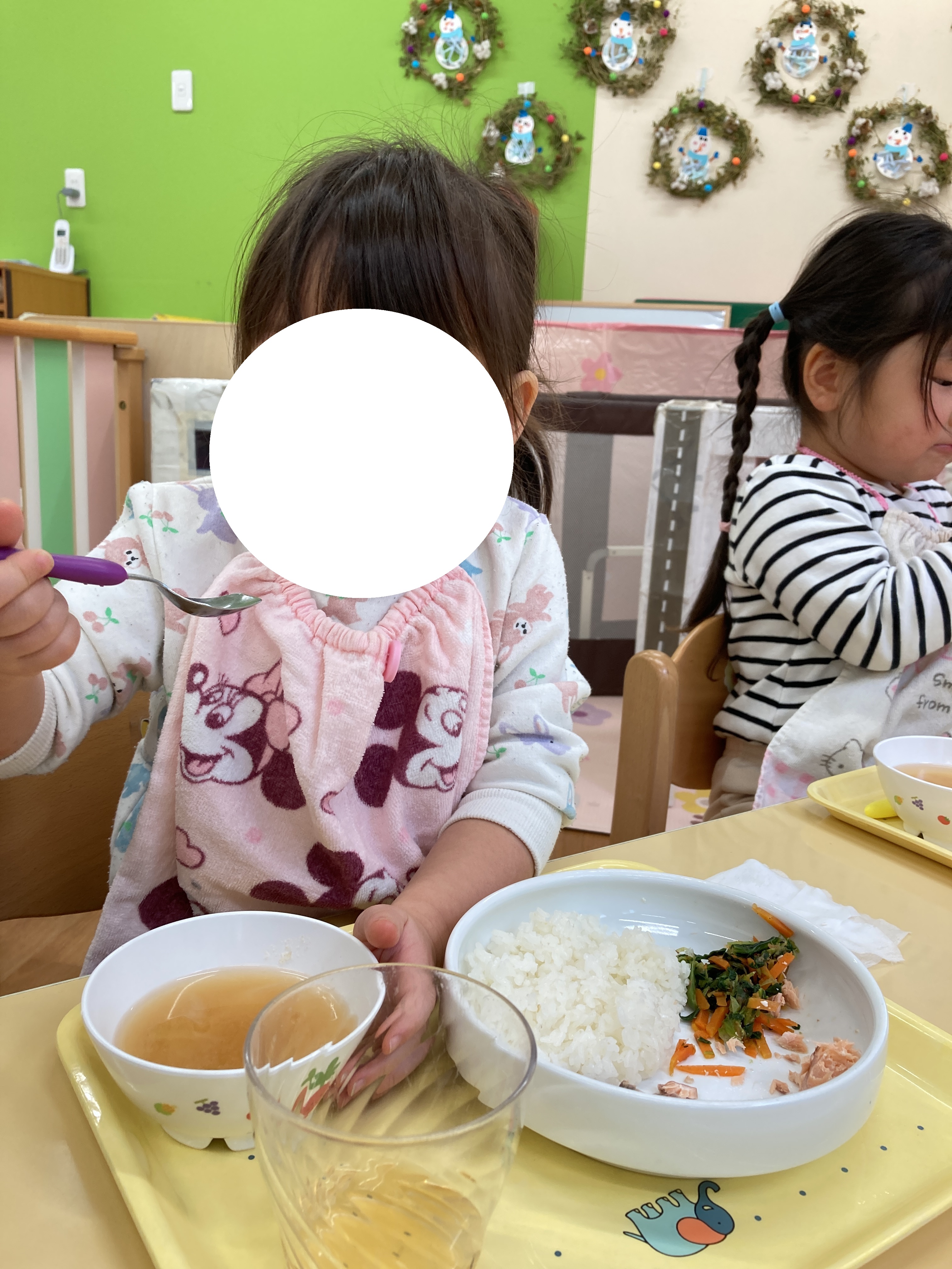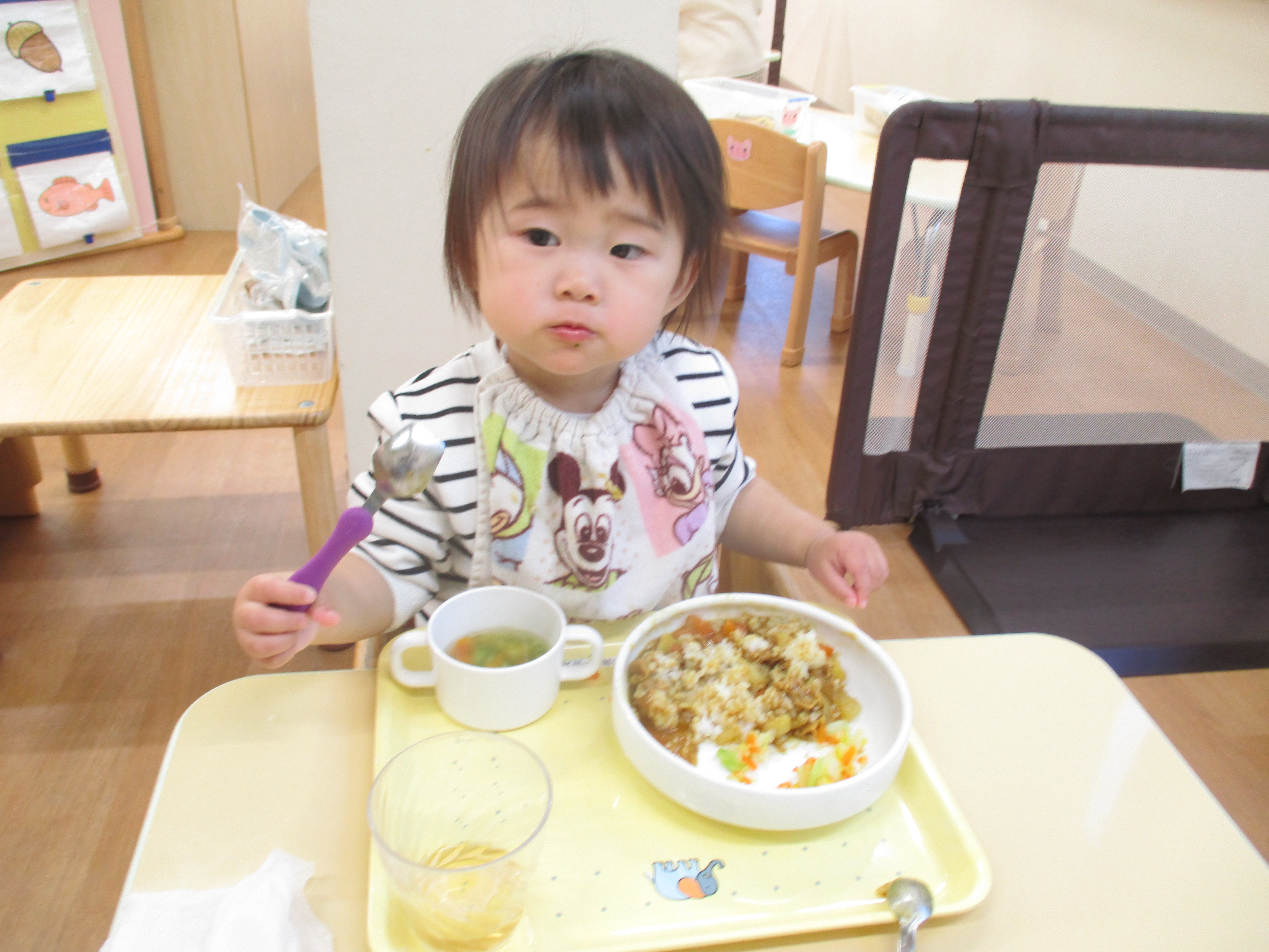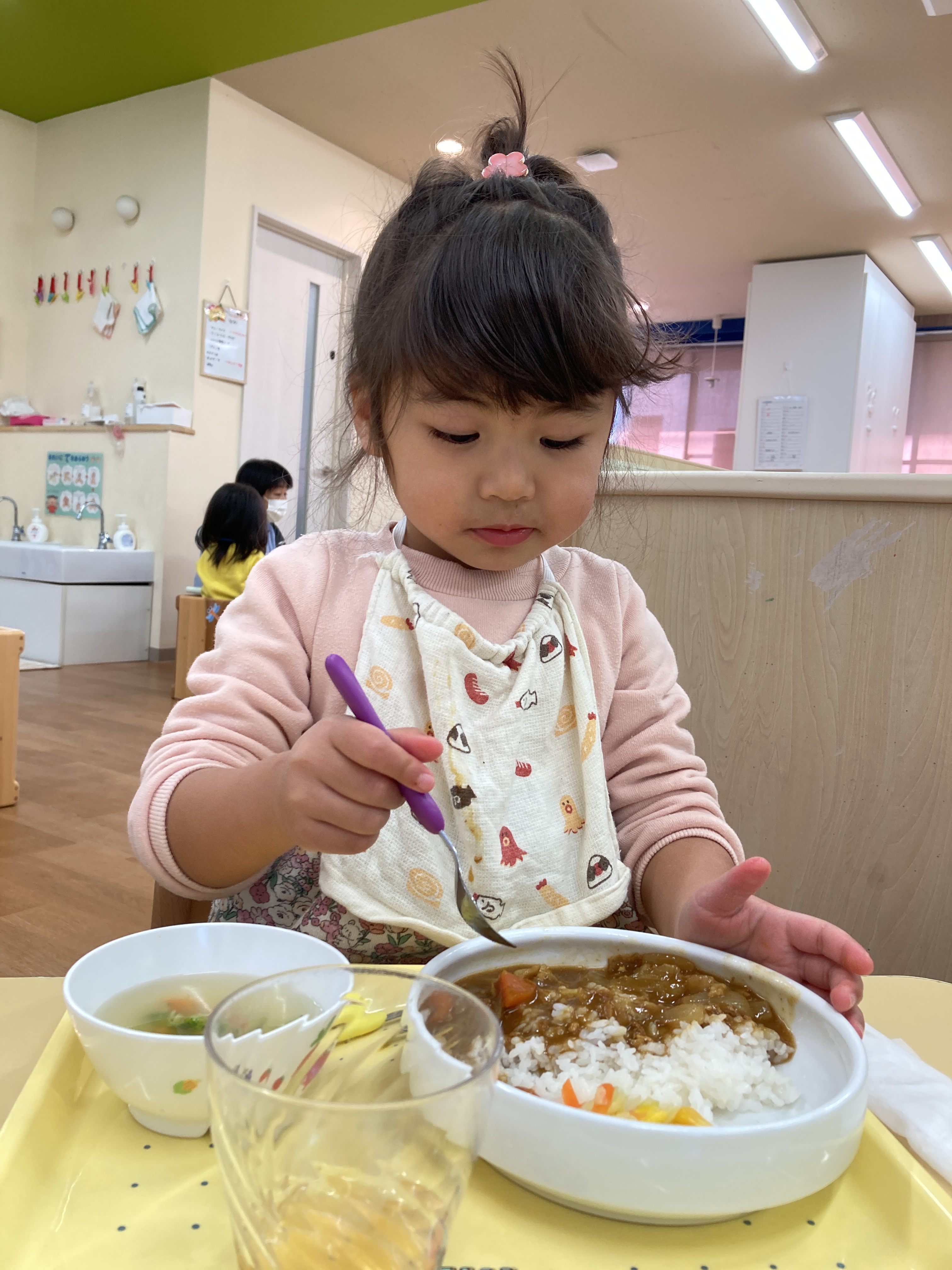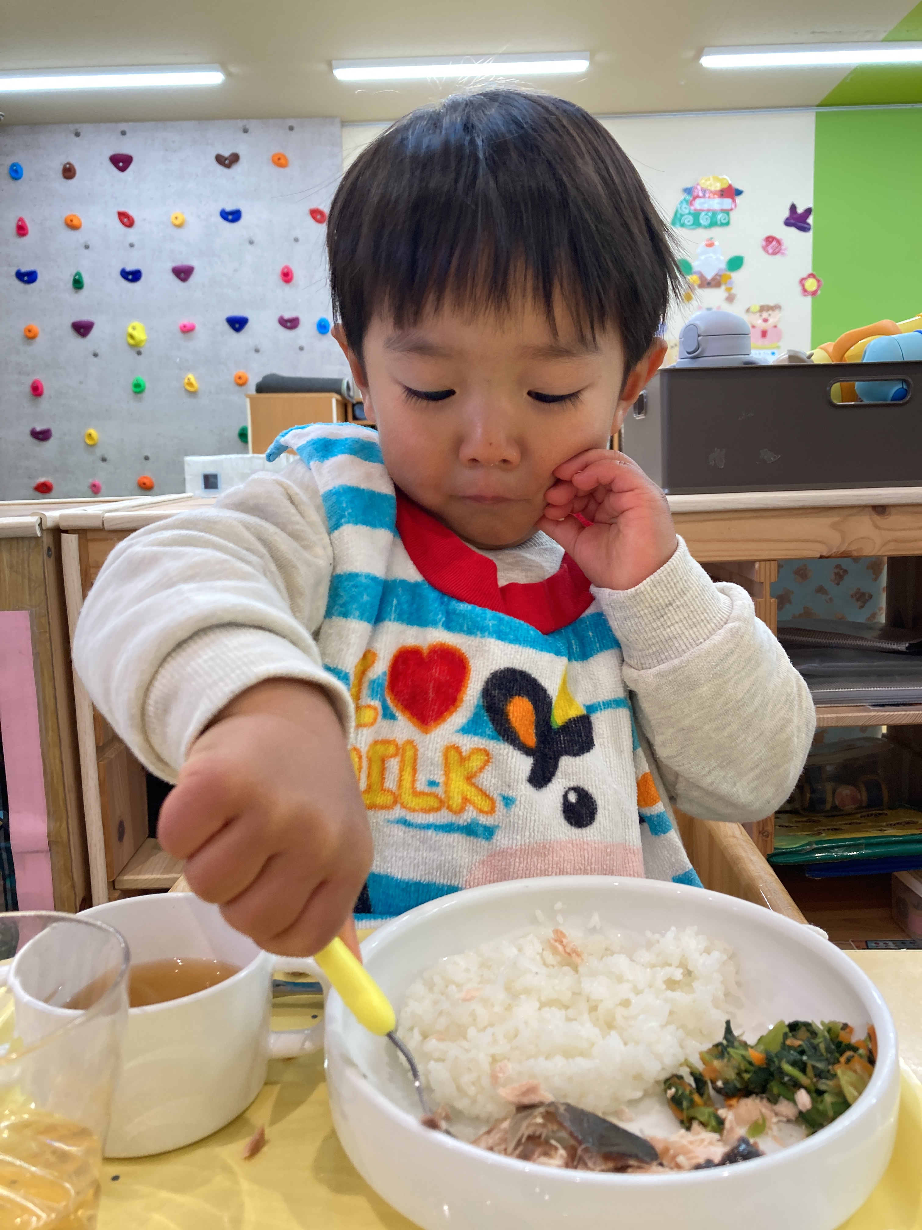 入園当初と比べると今ではしっかりとスプーンを握ってお口に運べるようになってきました![]()