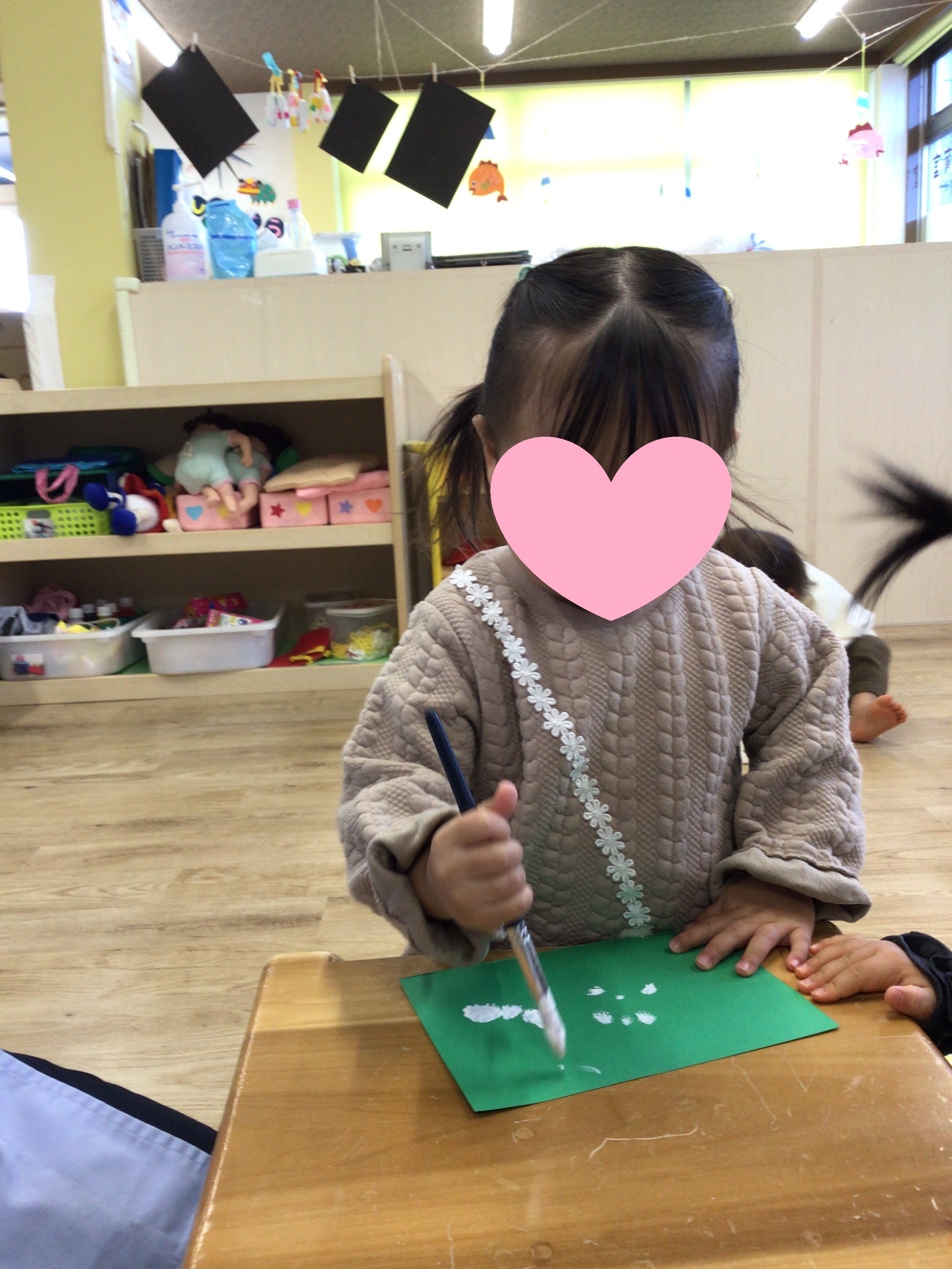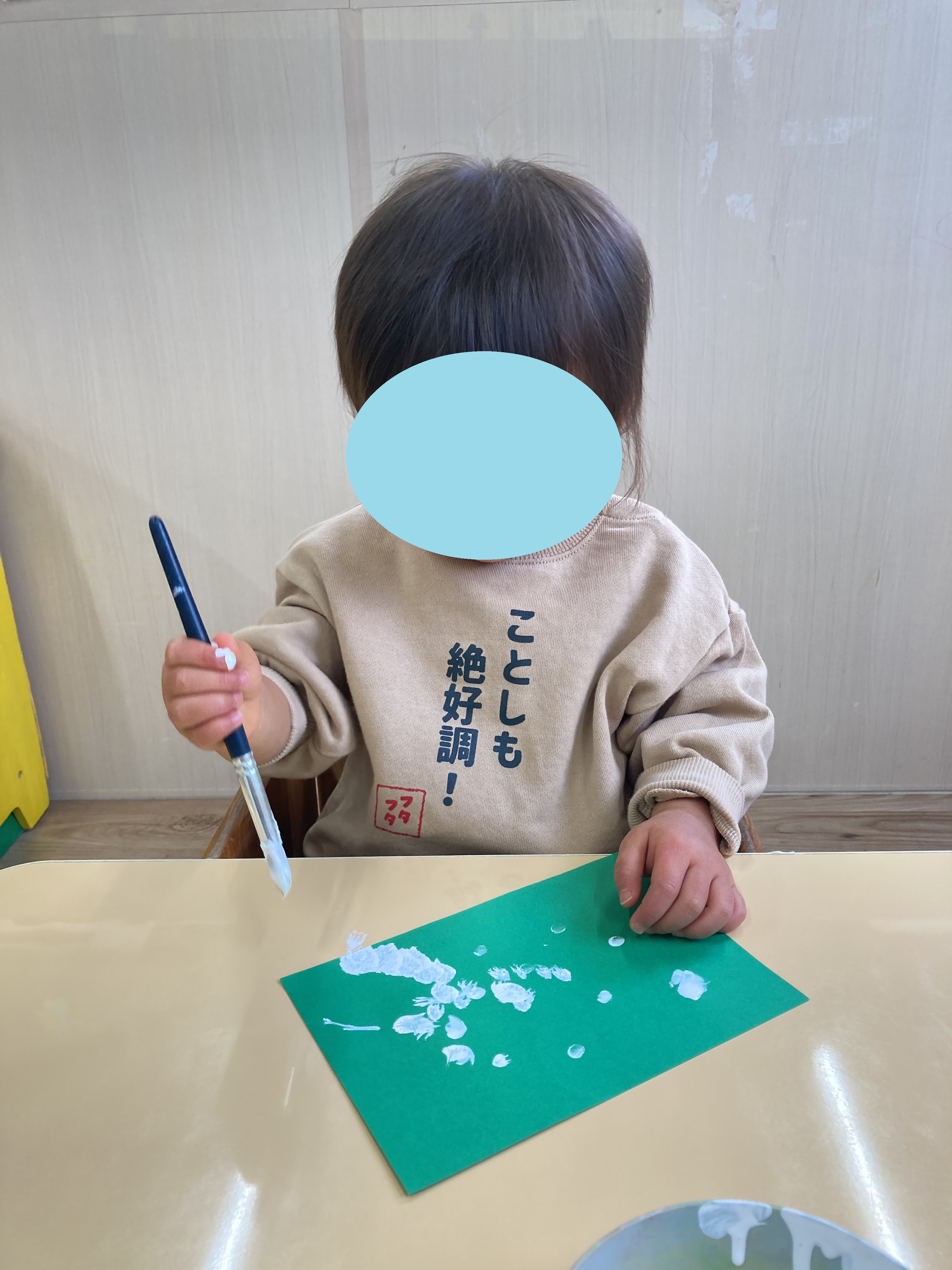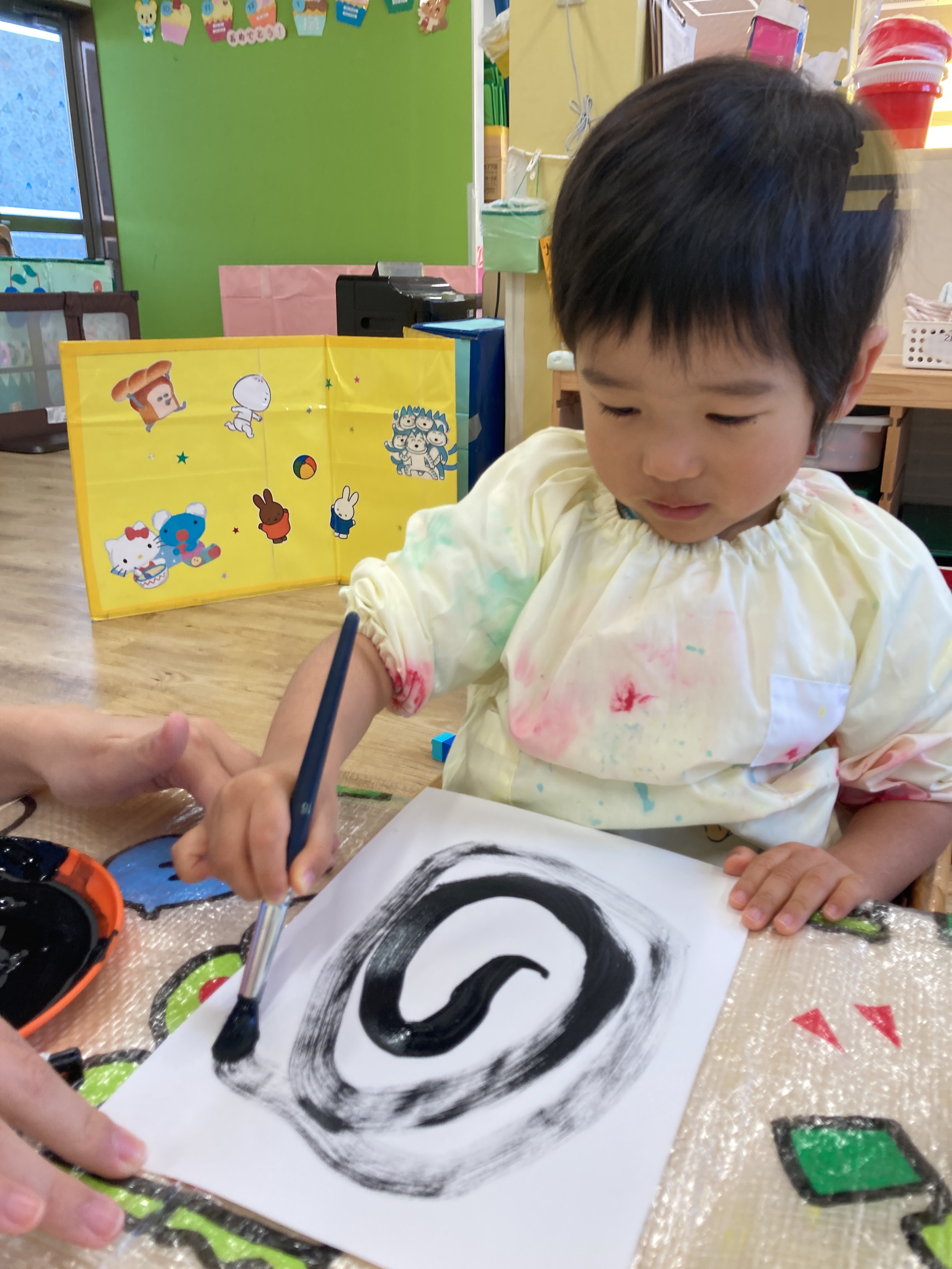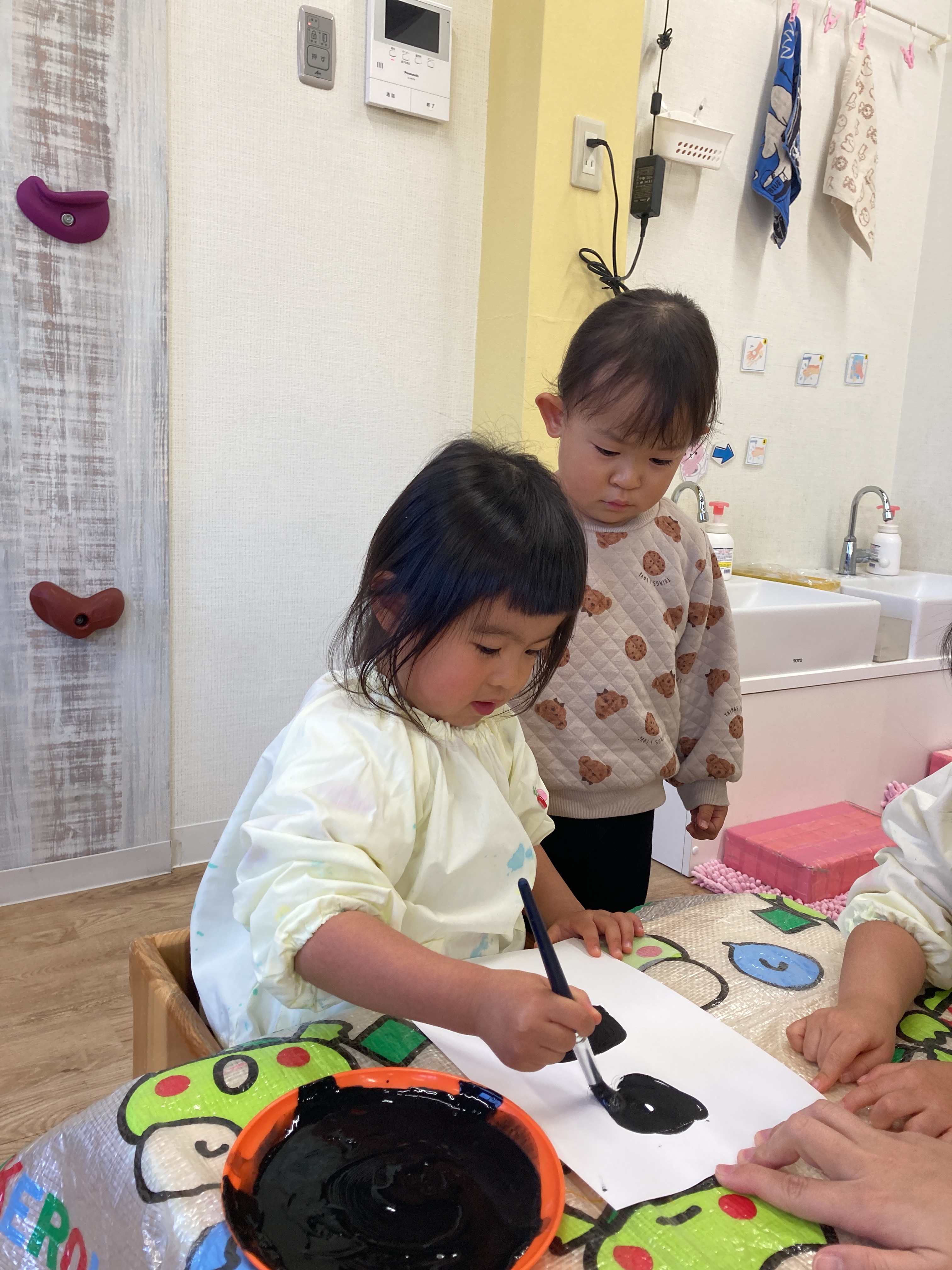製作の他に、お正月遊びとして1歳児さんはだるまの福笑い、2歳児さんは書初めを行いました![]()