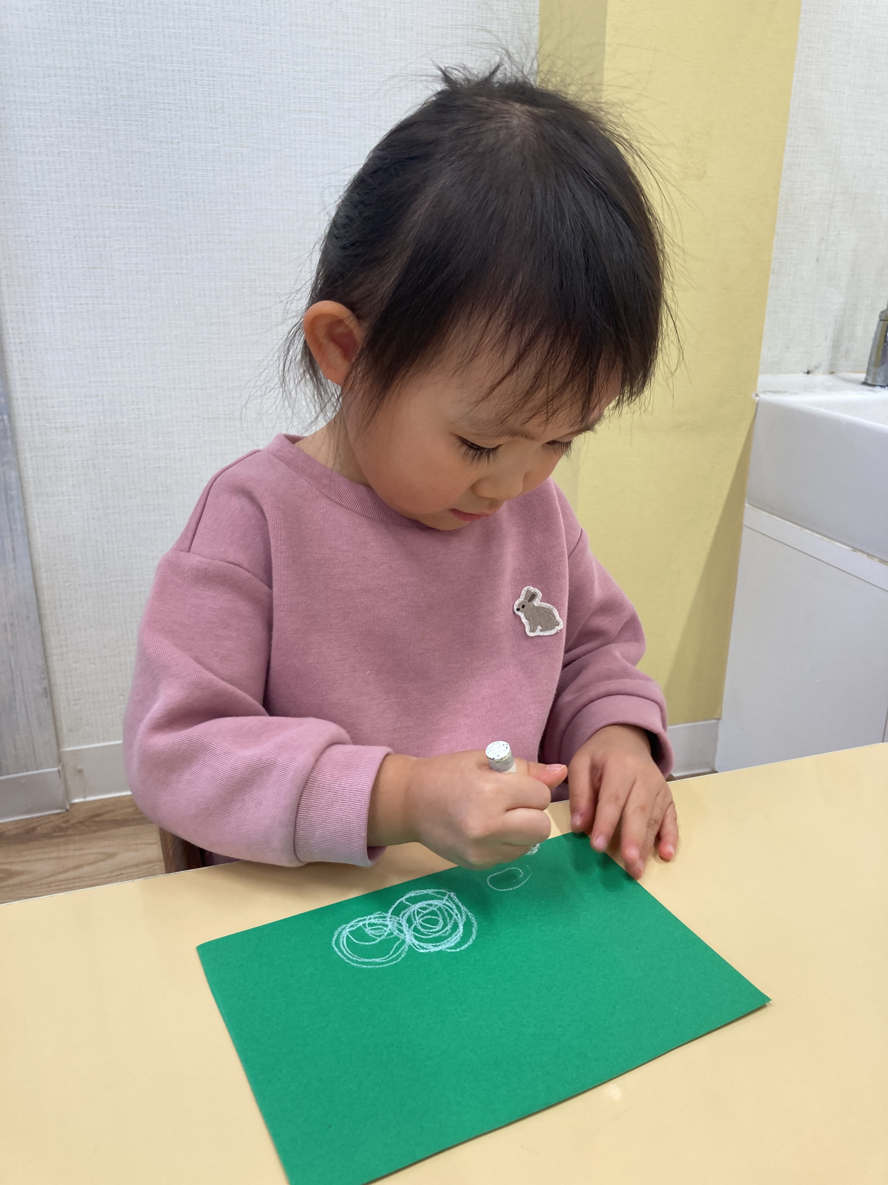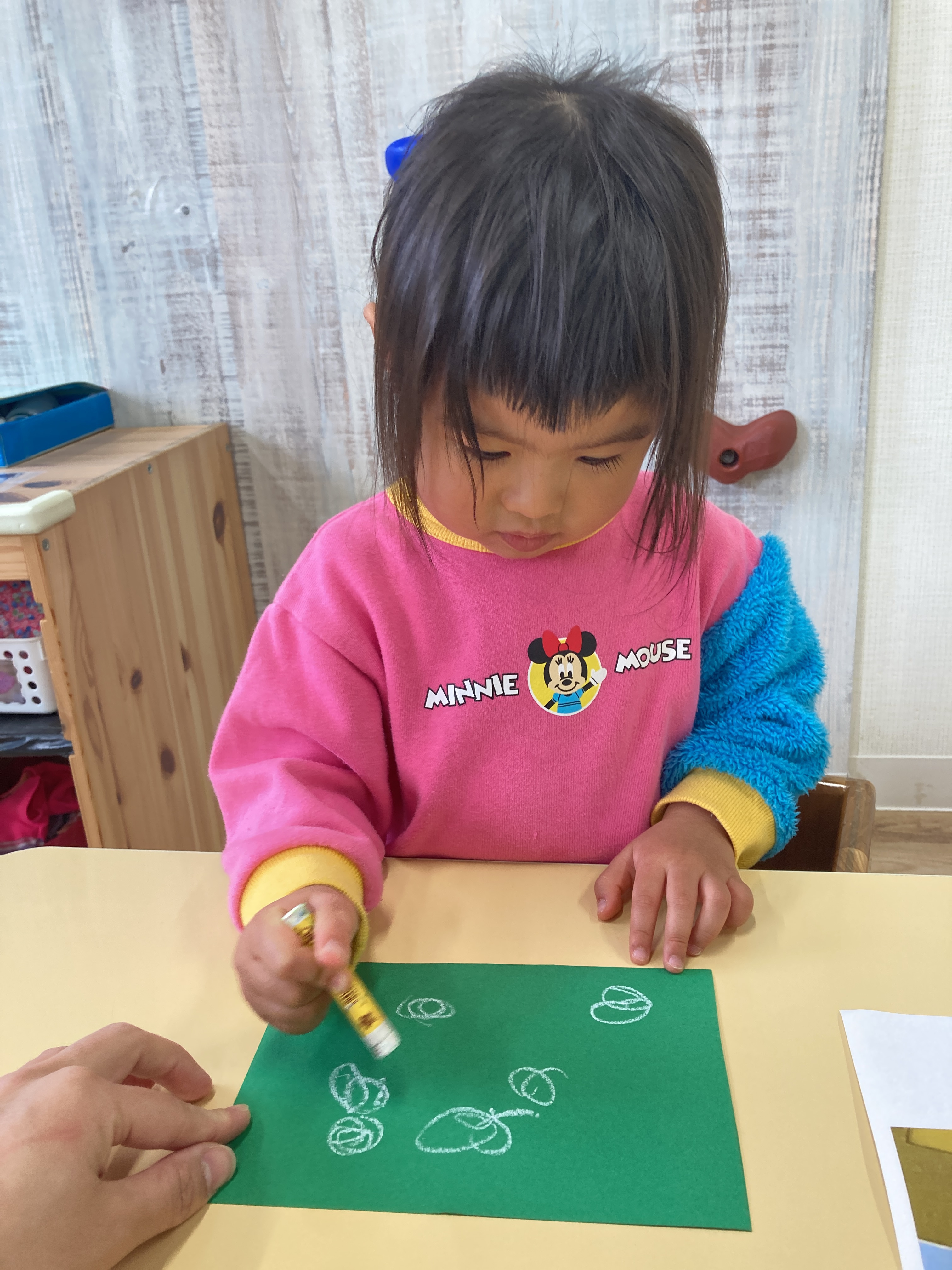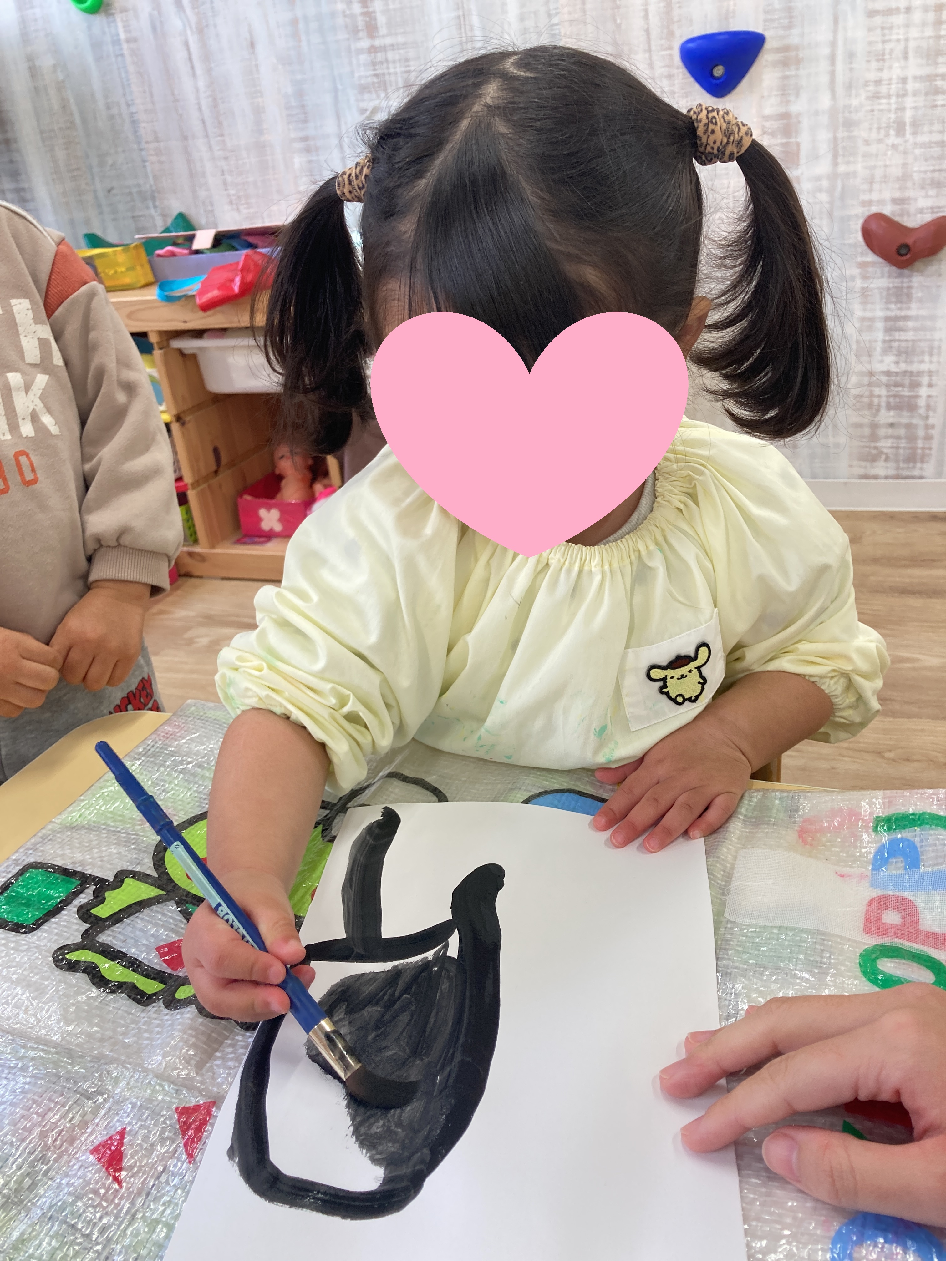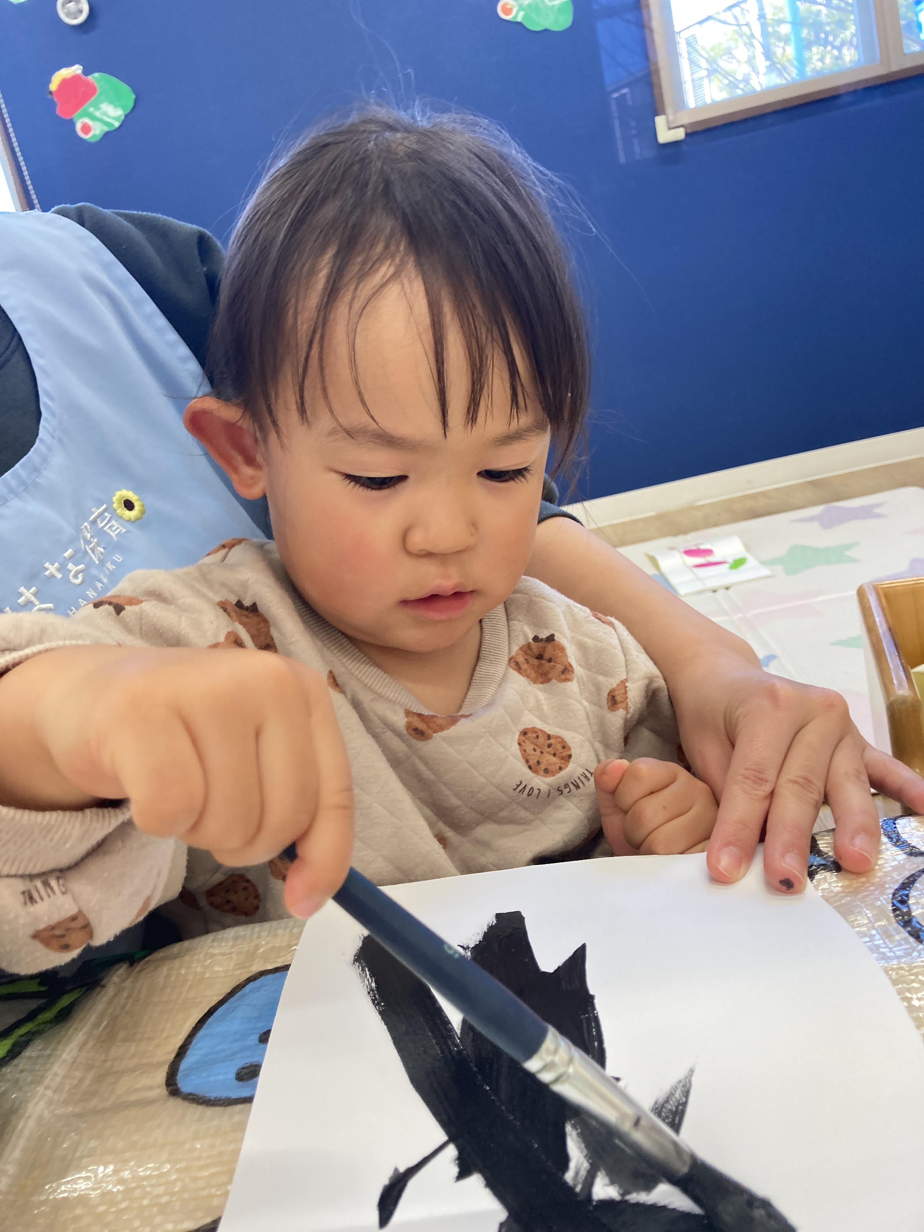 製作の他に、お正月遊びとして1歳児さんはだるまの福笑い、2歳児さんは書初めを行いました![]()
