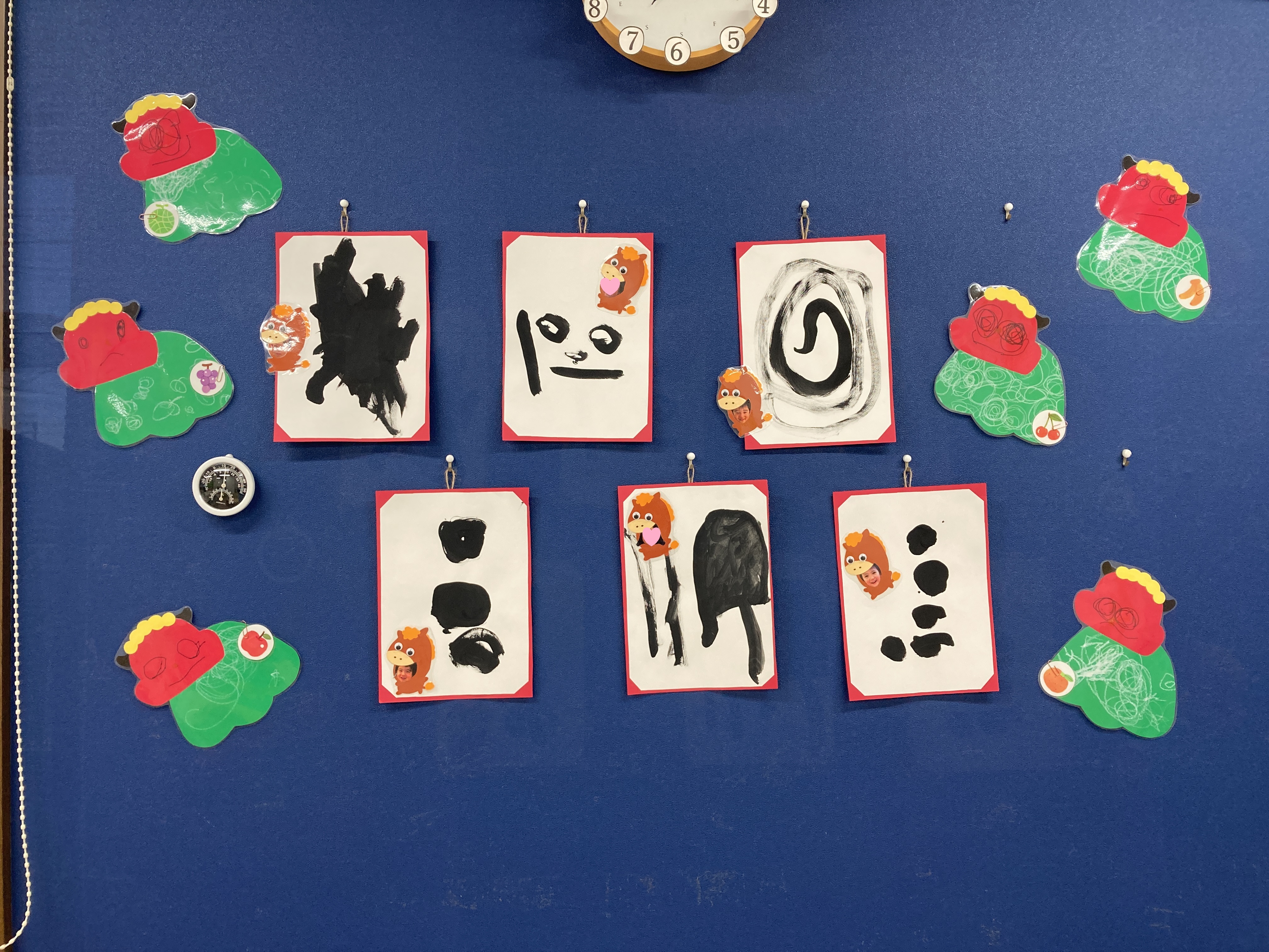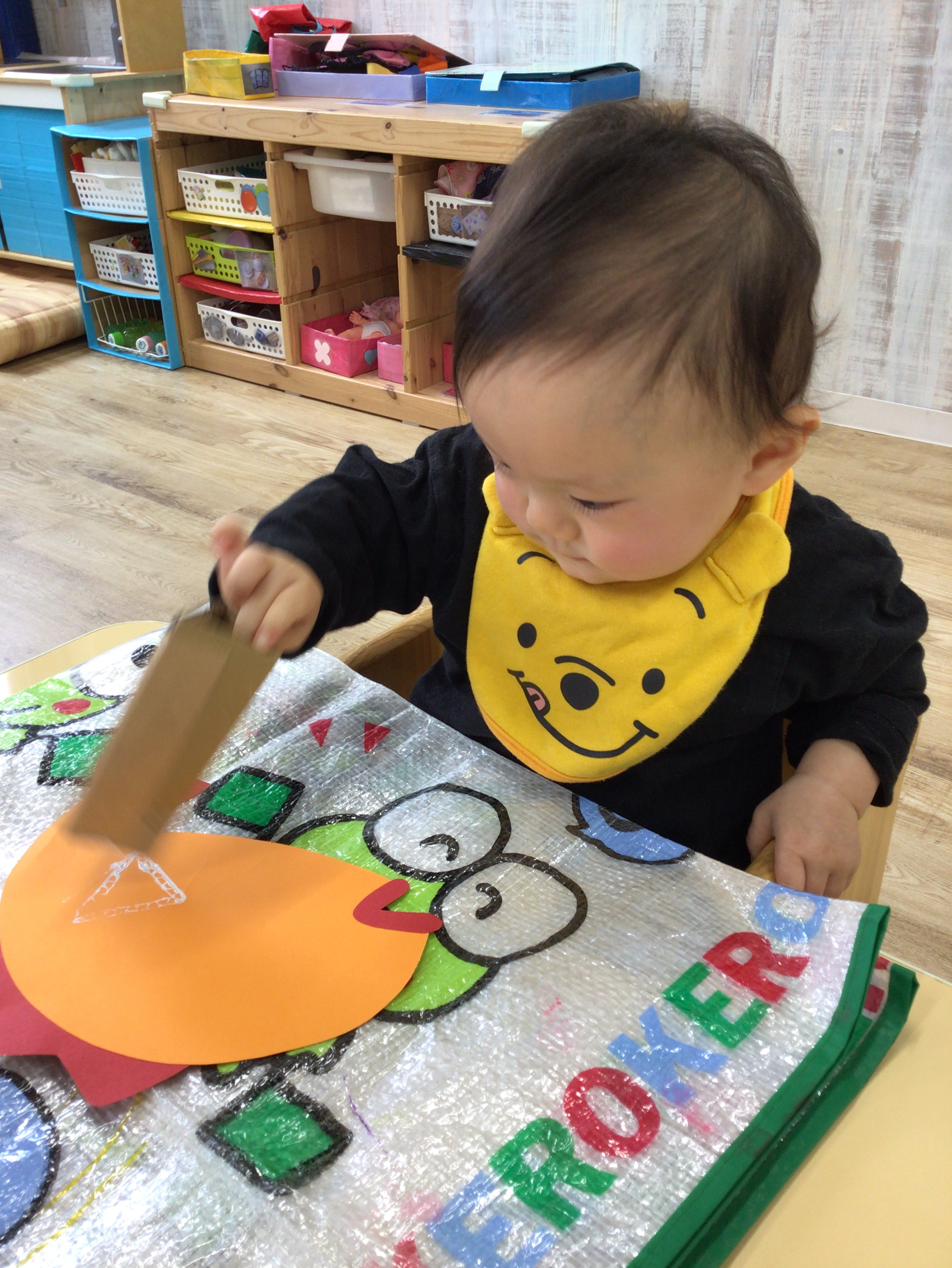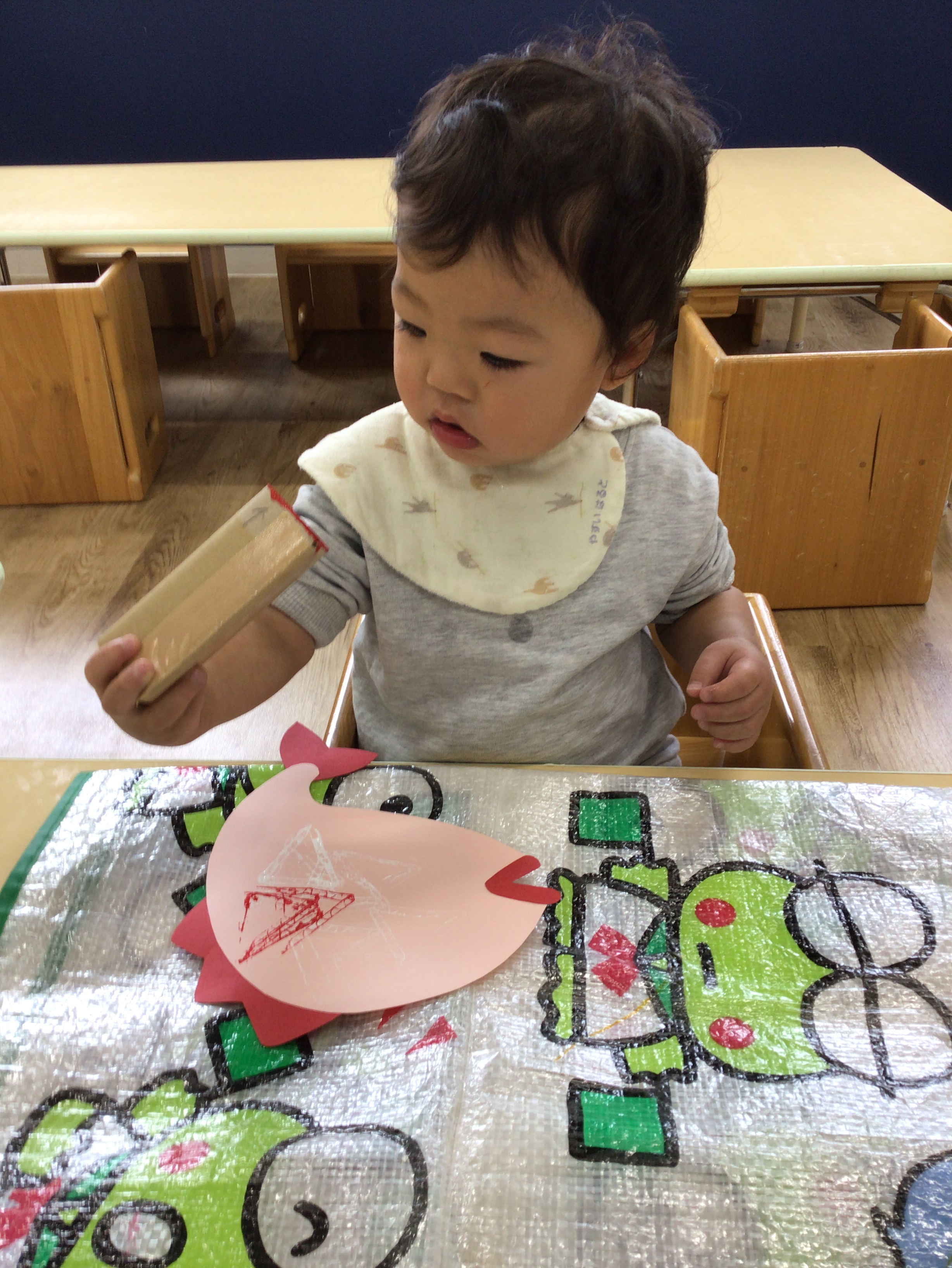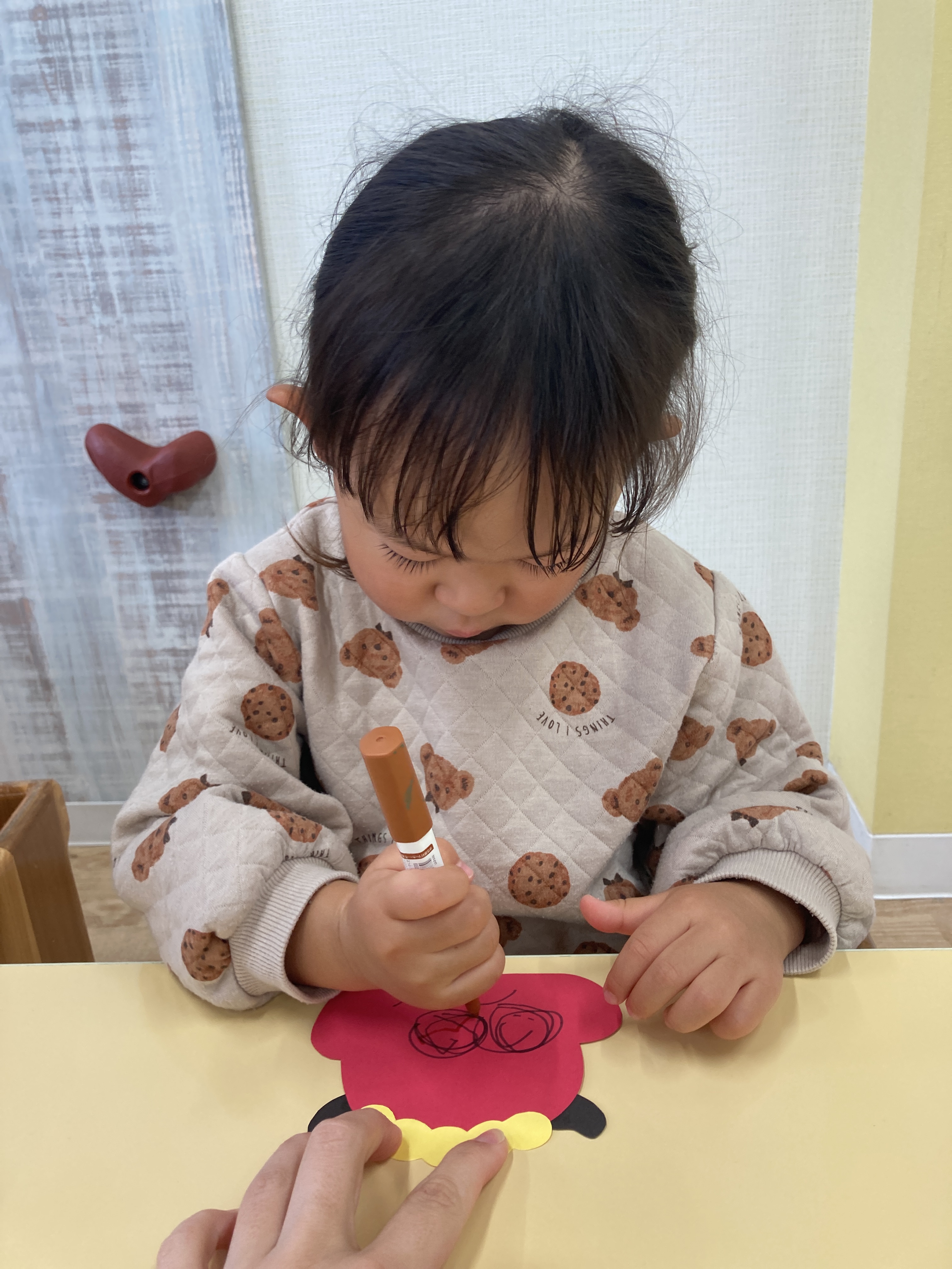 1歳児さんと2歳児さんは筆やクレヨン、指スタンプ等色んなやり方でしし舞を作りました!