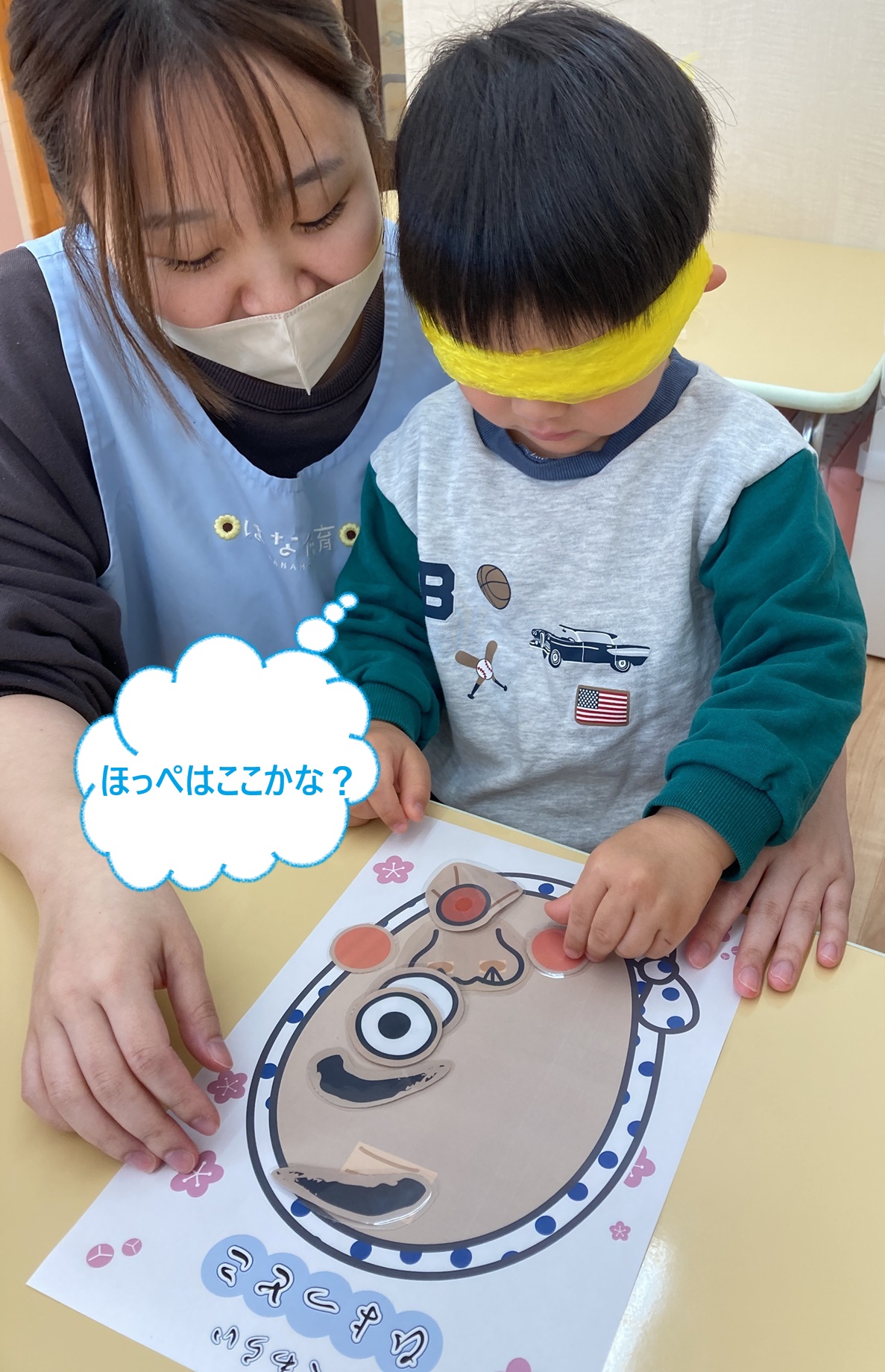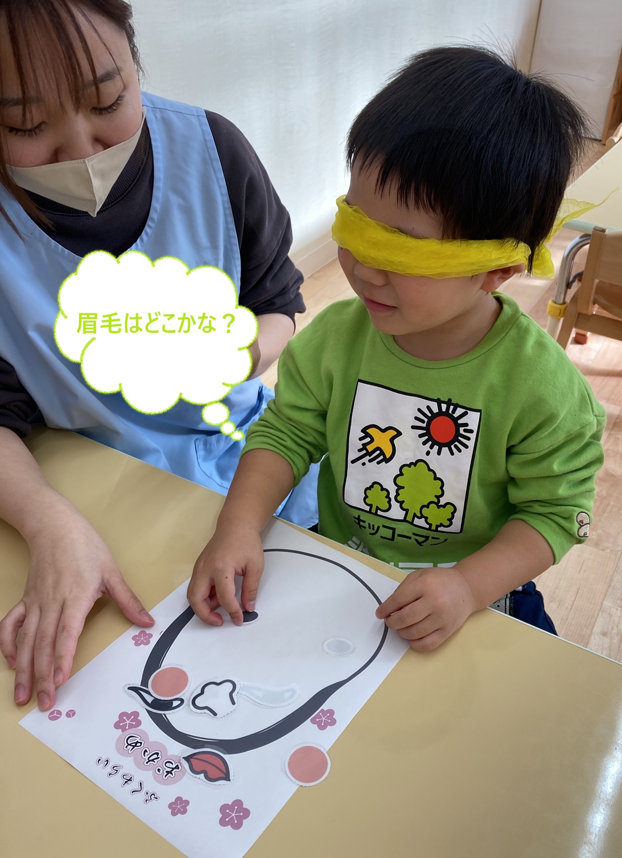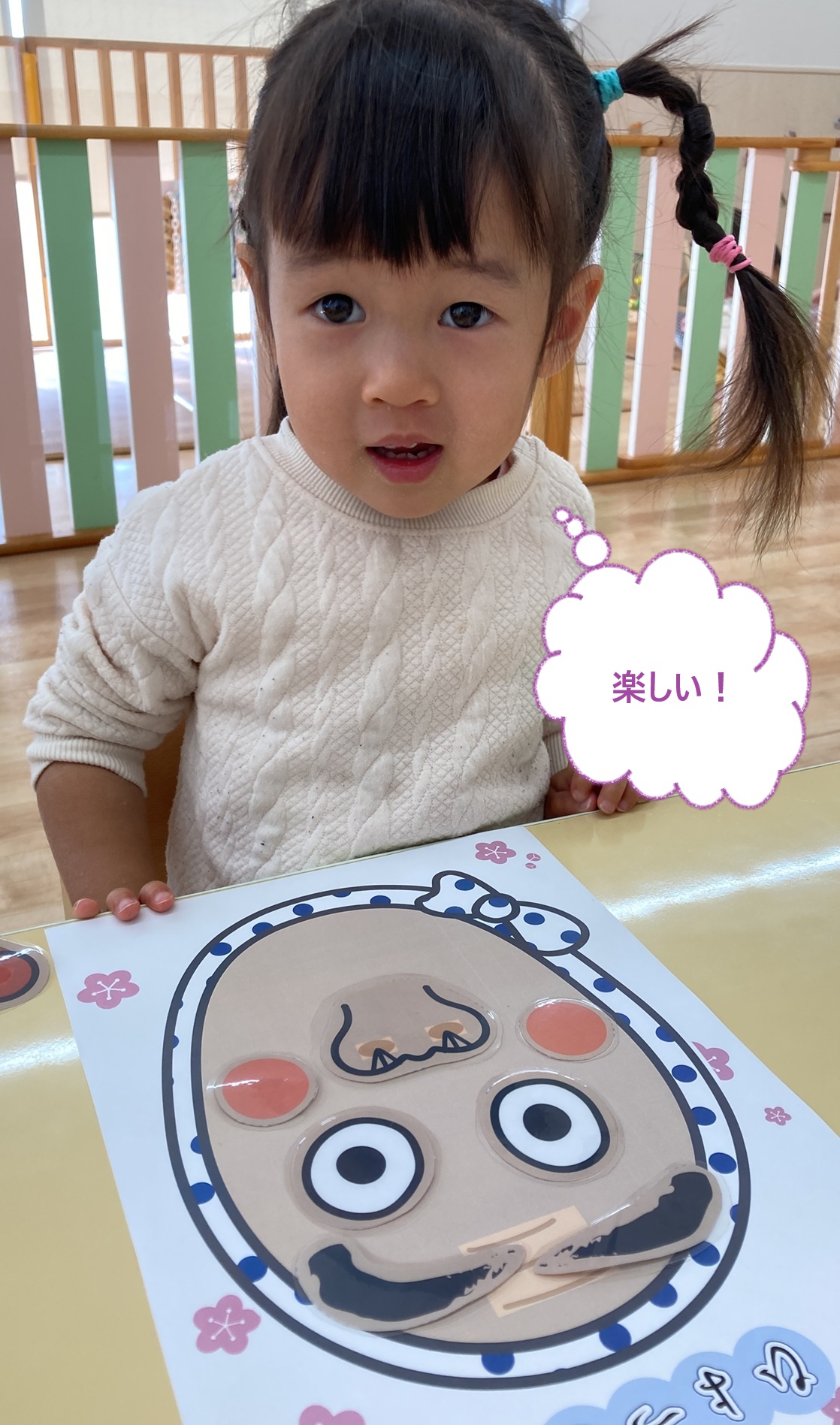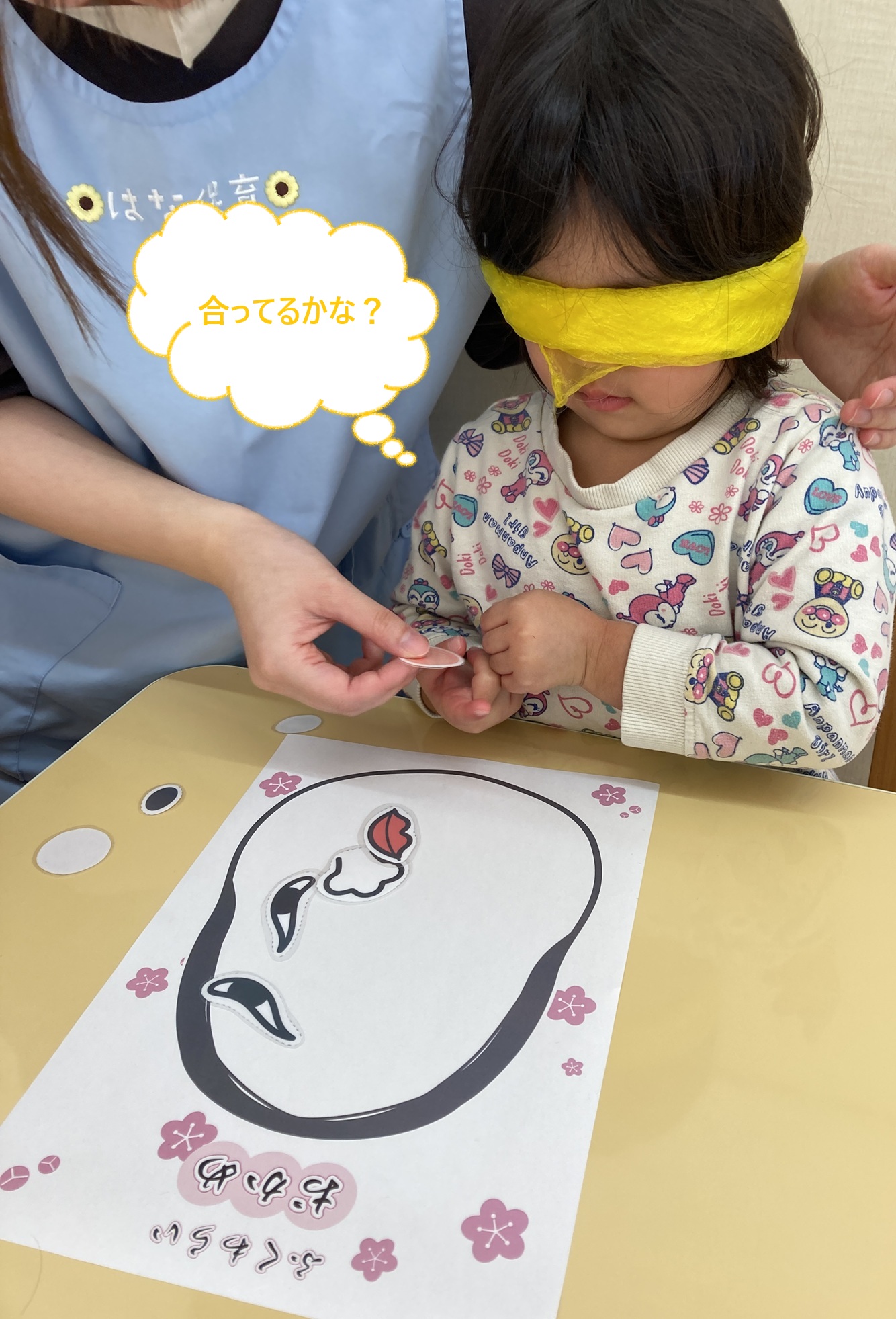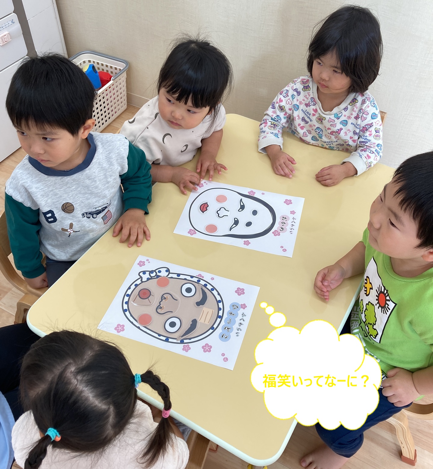 めろん組(2歳児)で初詣に行った様子とお正月遊び「福笑い」をしている様子を紹介します![]()