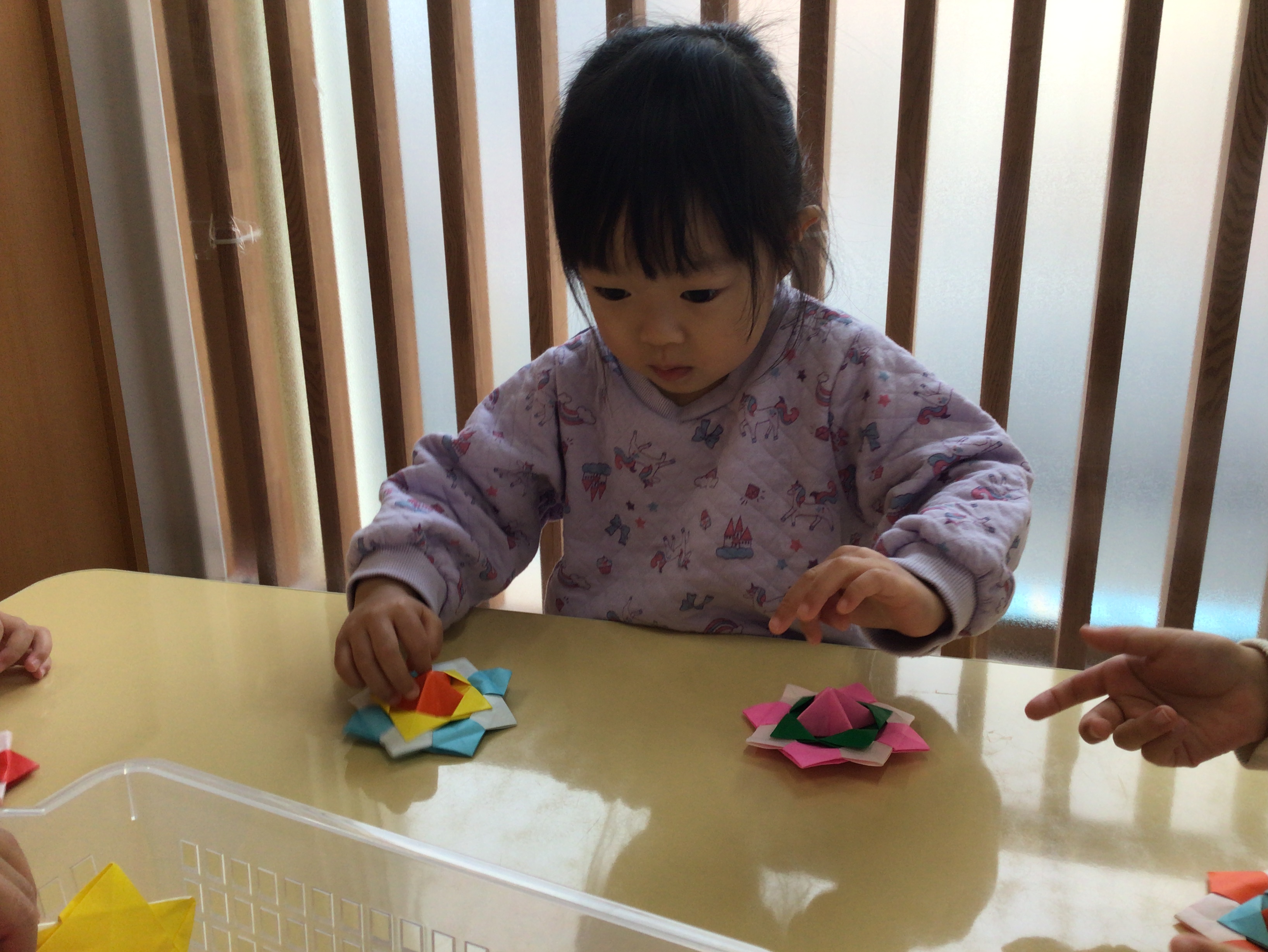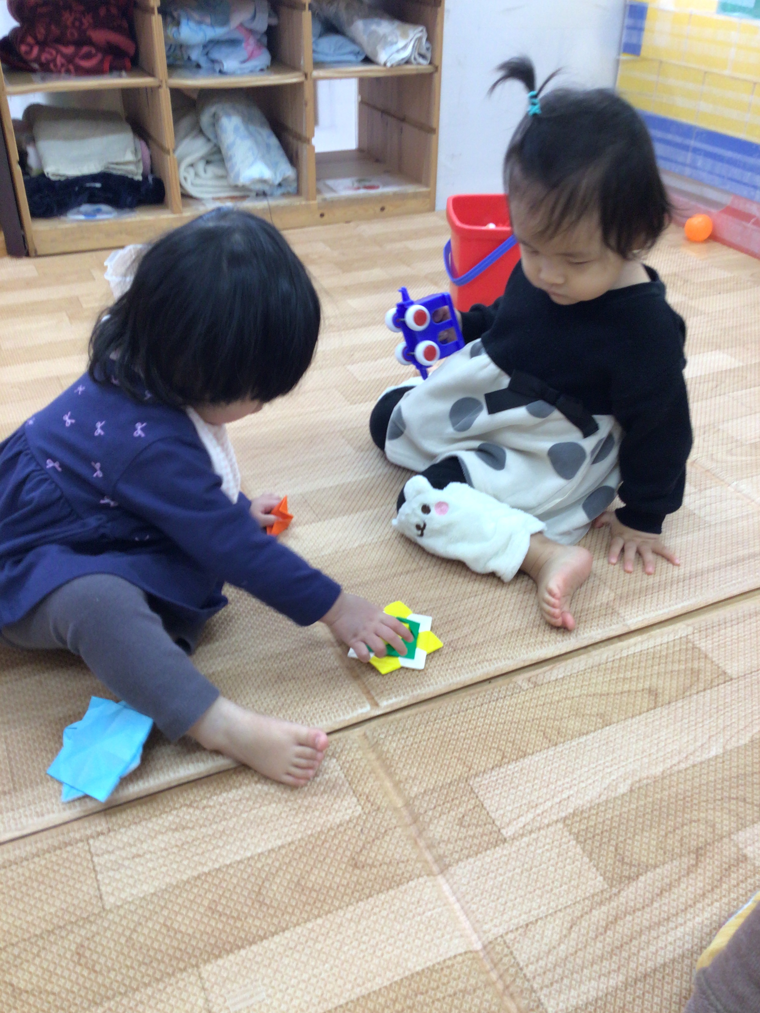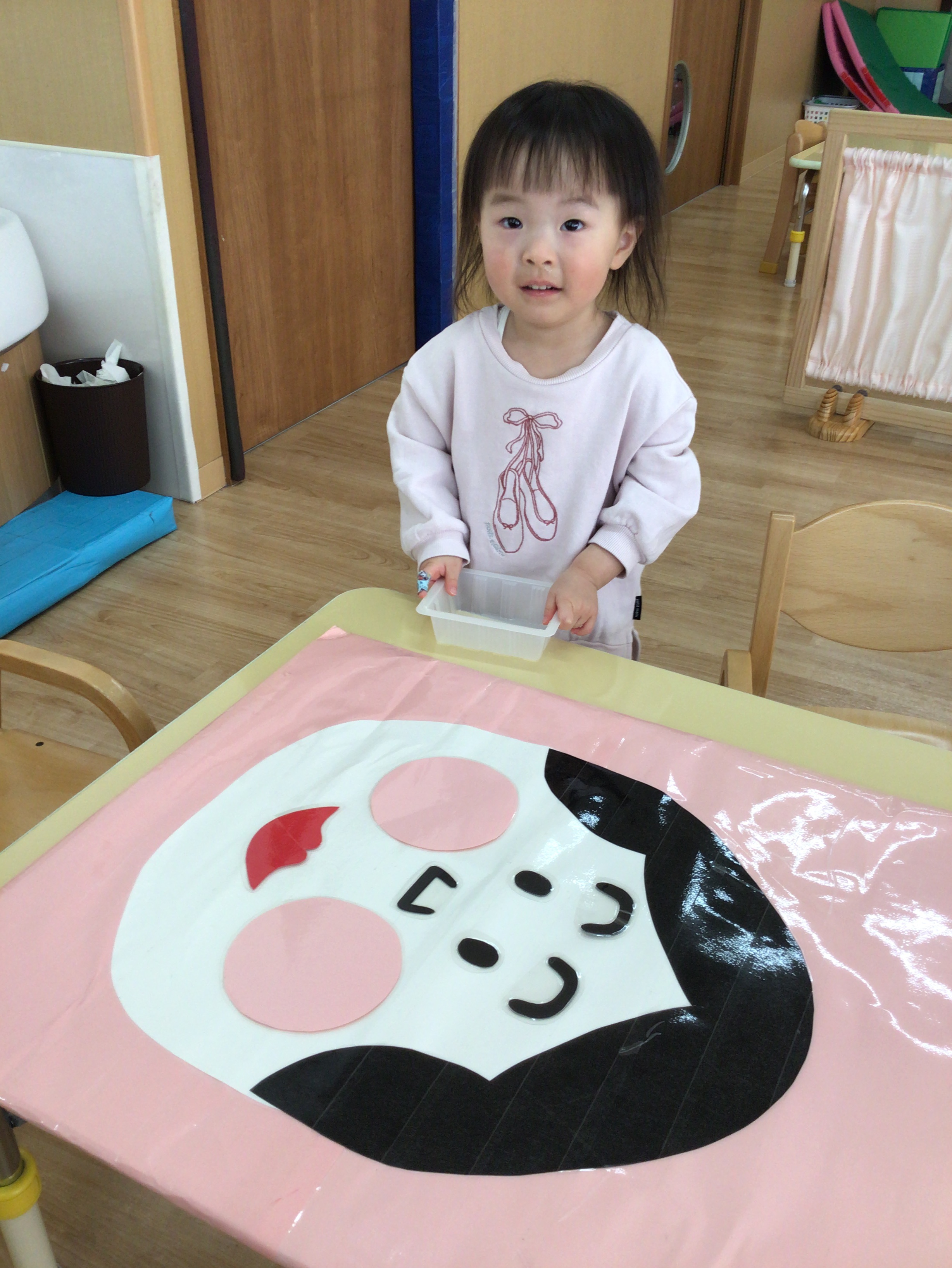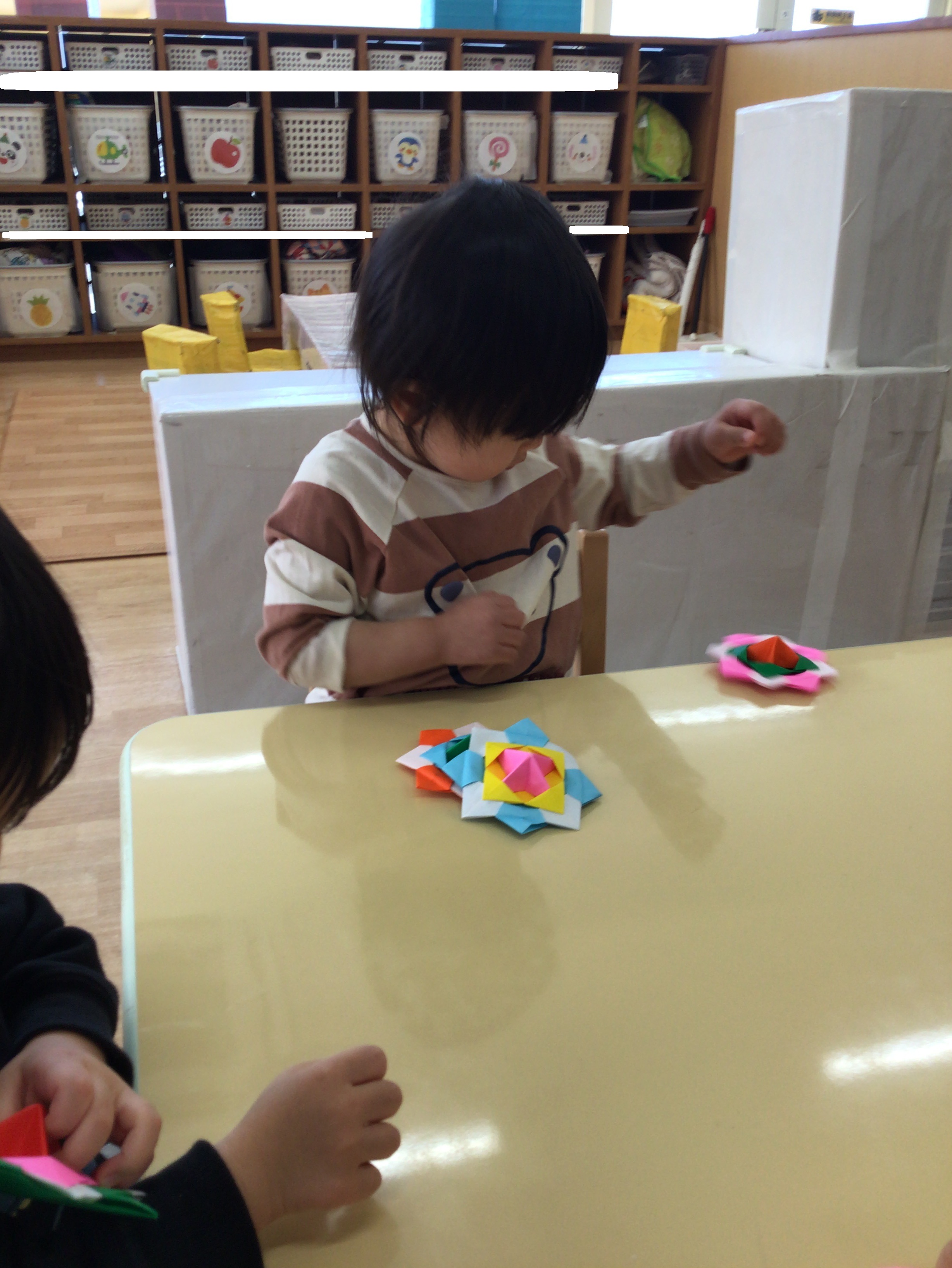 ひよこ組さんも挑戦しました!こまが回ると嬉しそうに手を叩いていましたよ!