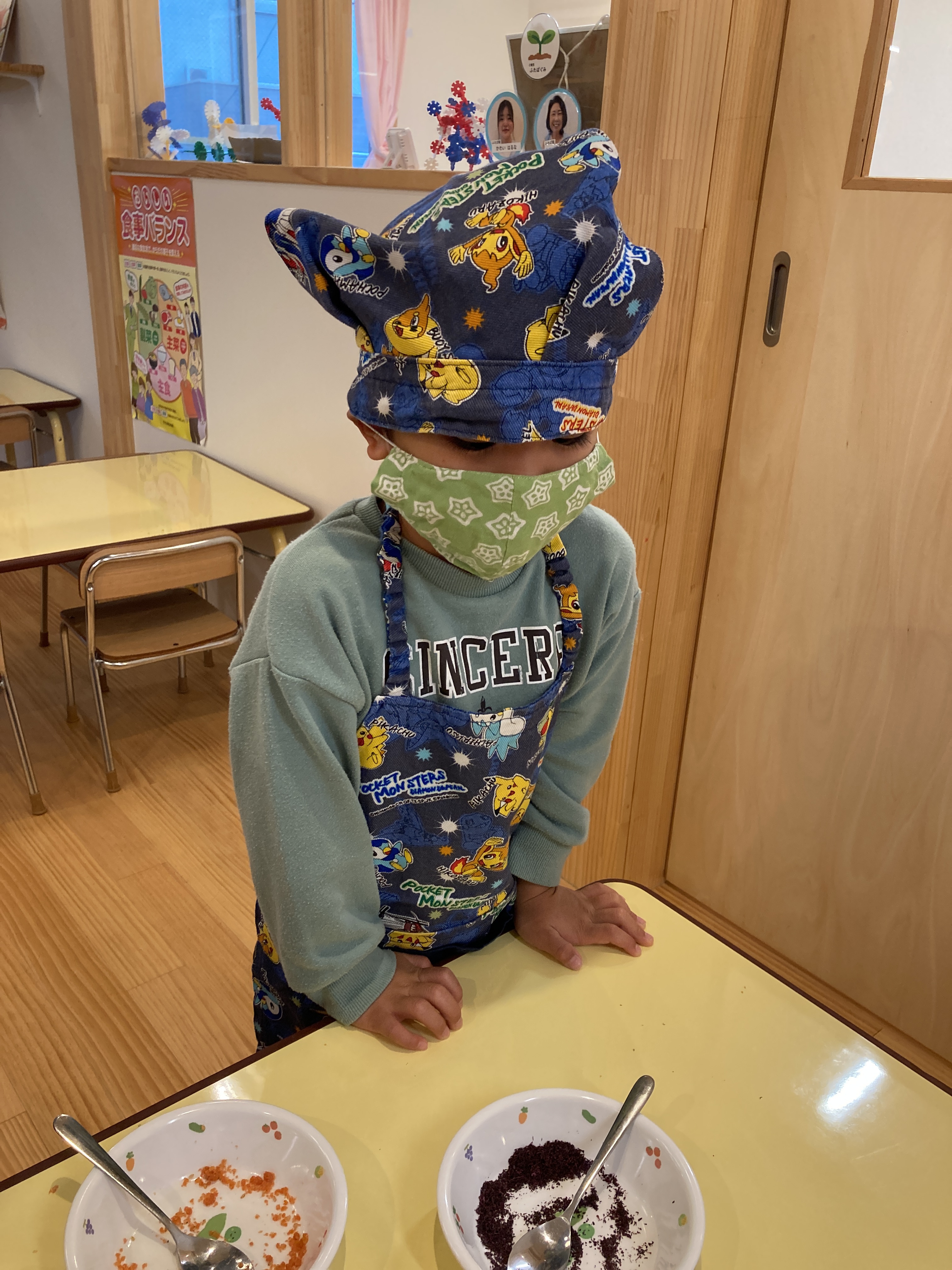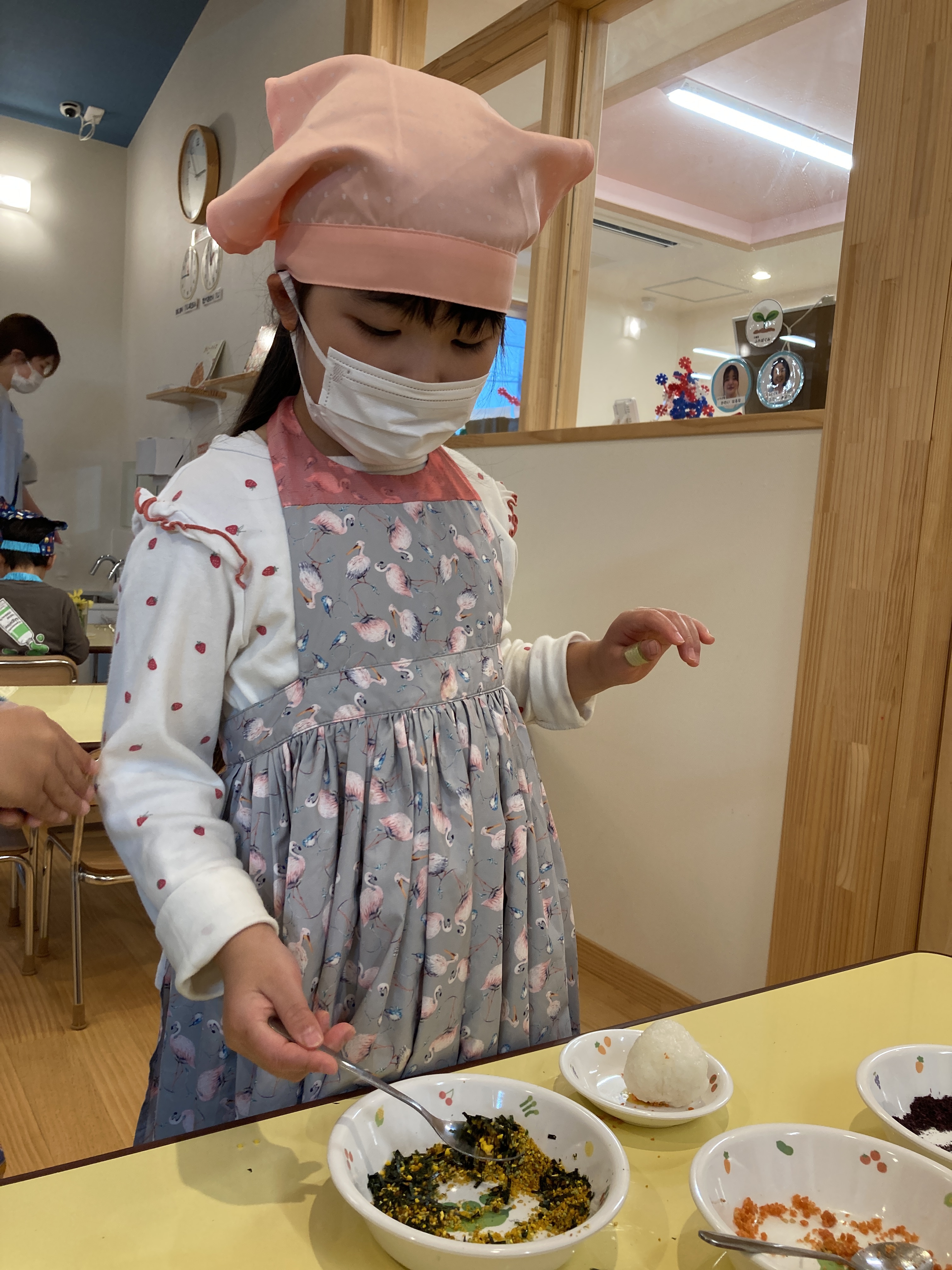 ふりかけを一種類だけかける子もいれば、二つの味を混ぜてみる子もいたり・・・