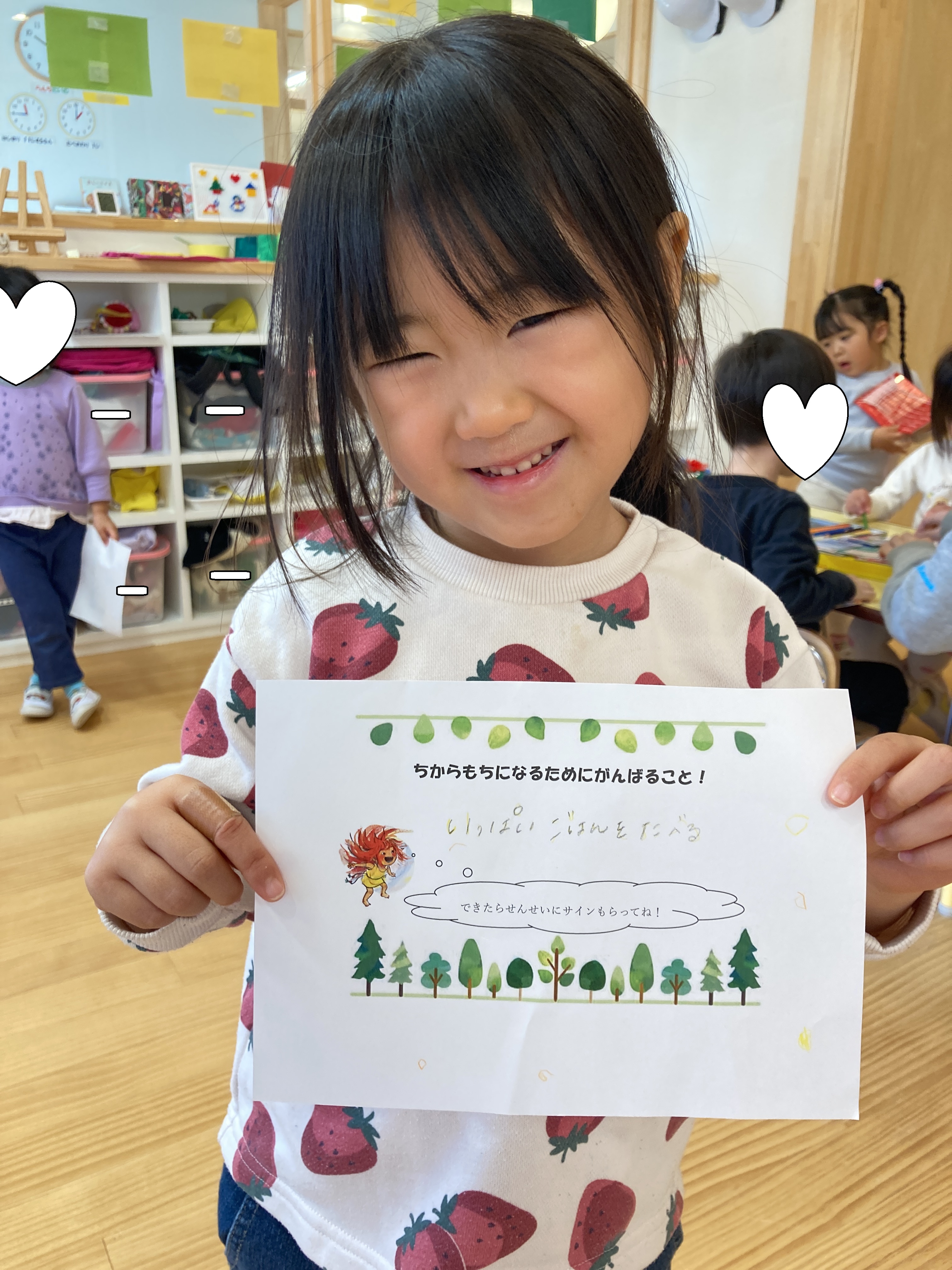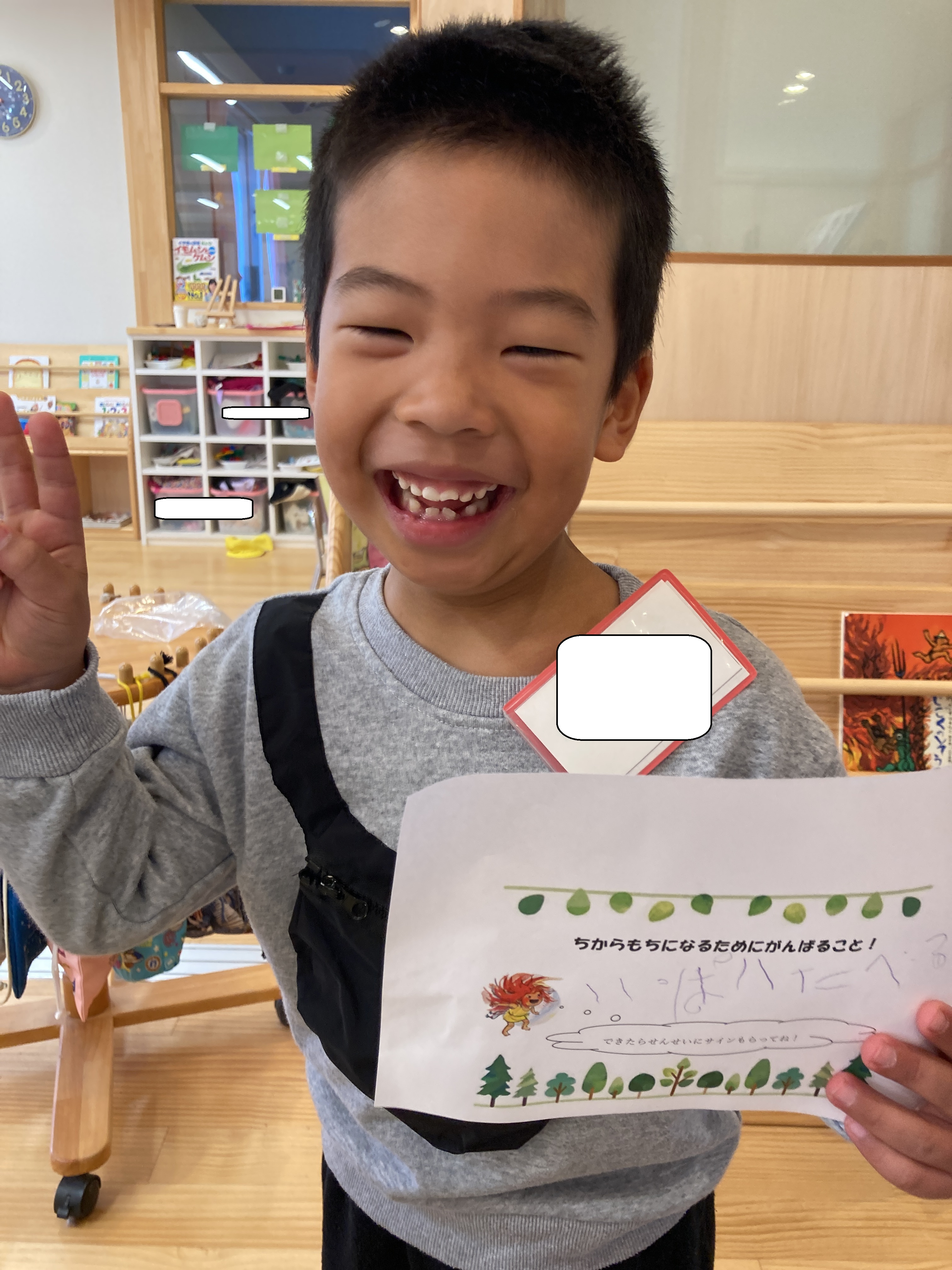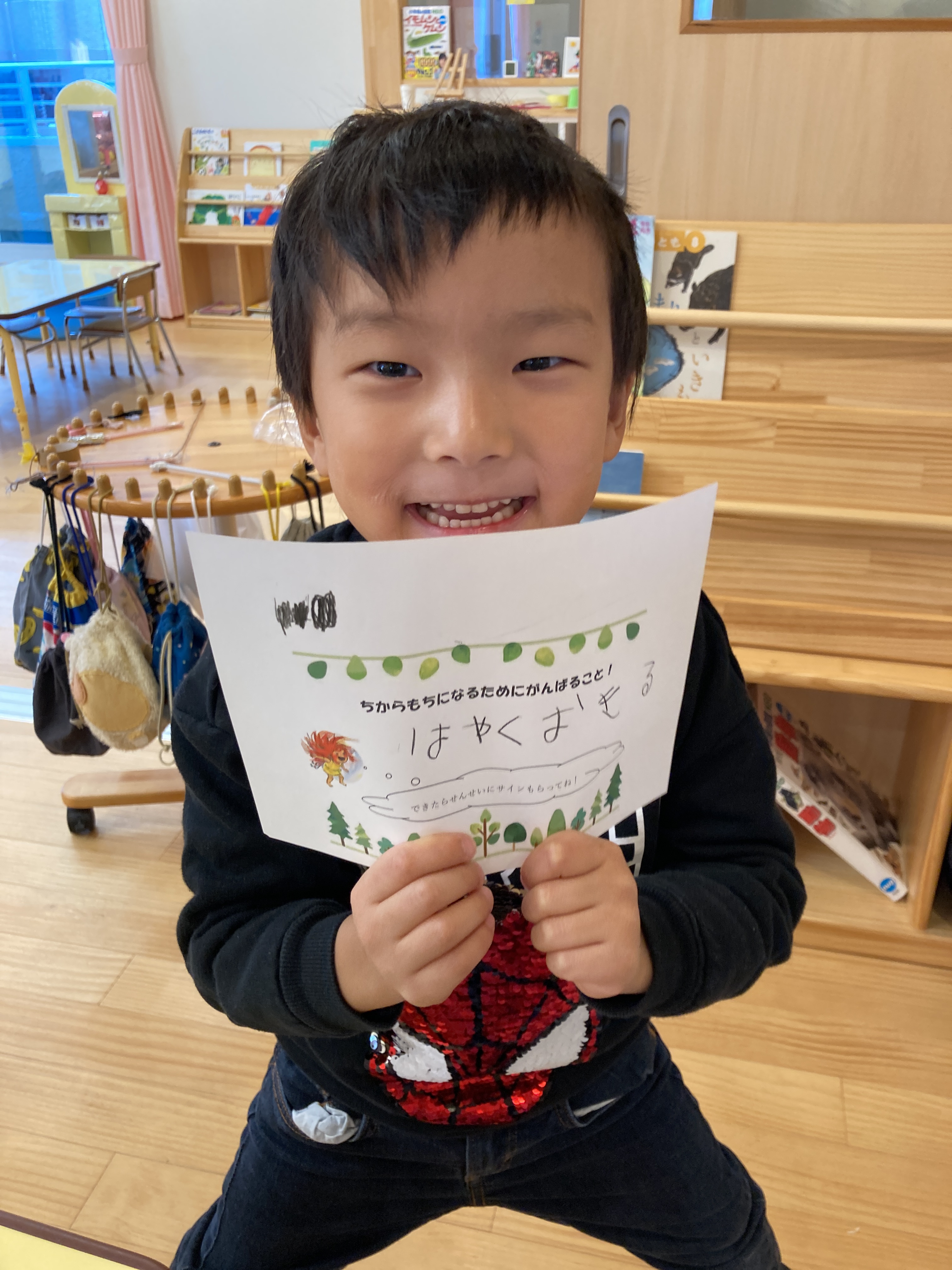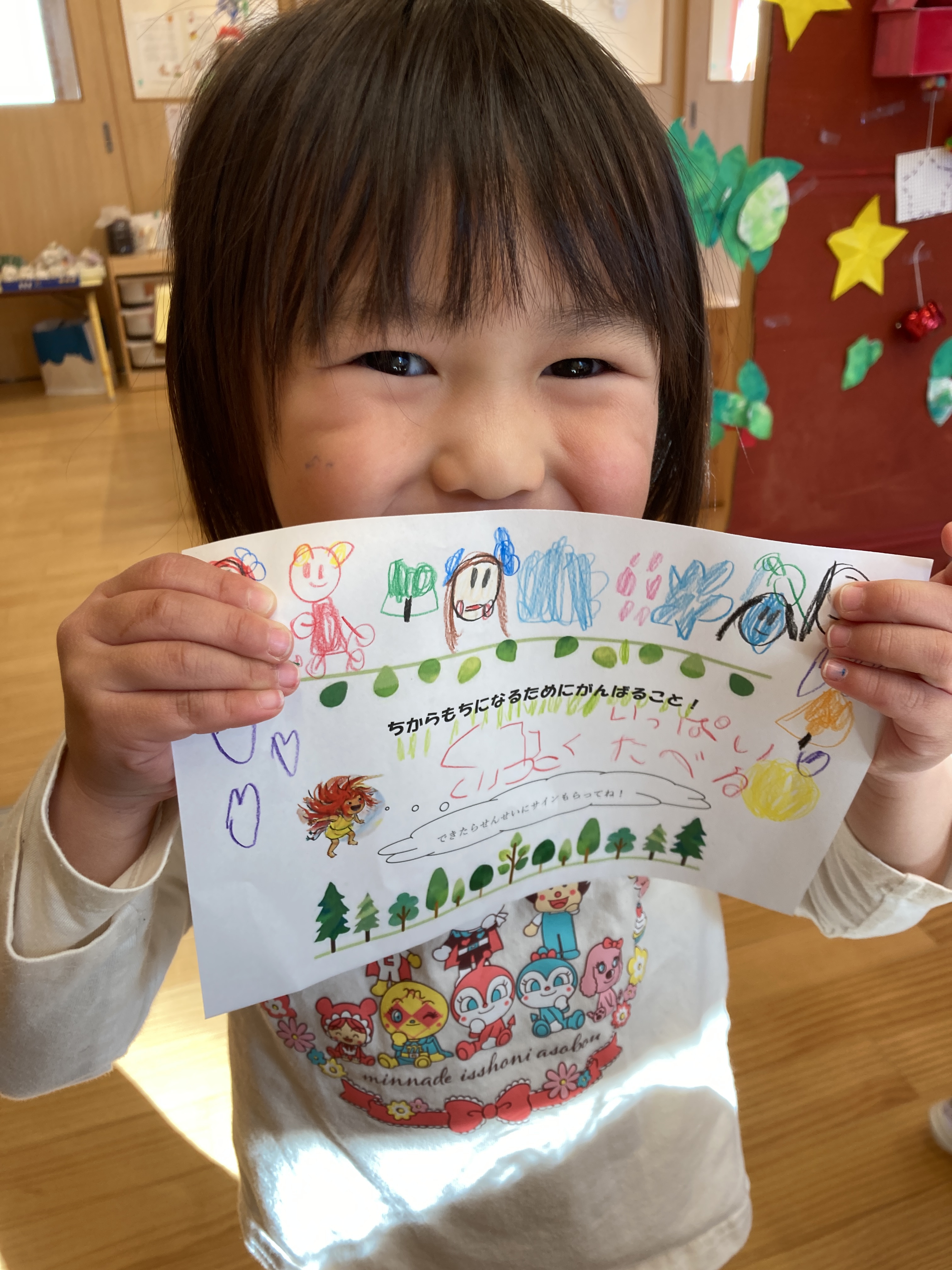 お部屋に戻りみんなでまゆからのお手紙を確認するとお礼として力もちになるために頑張ることを書く紙が入っていました!