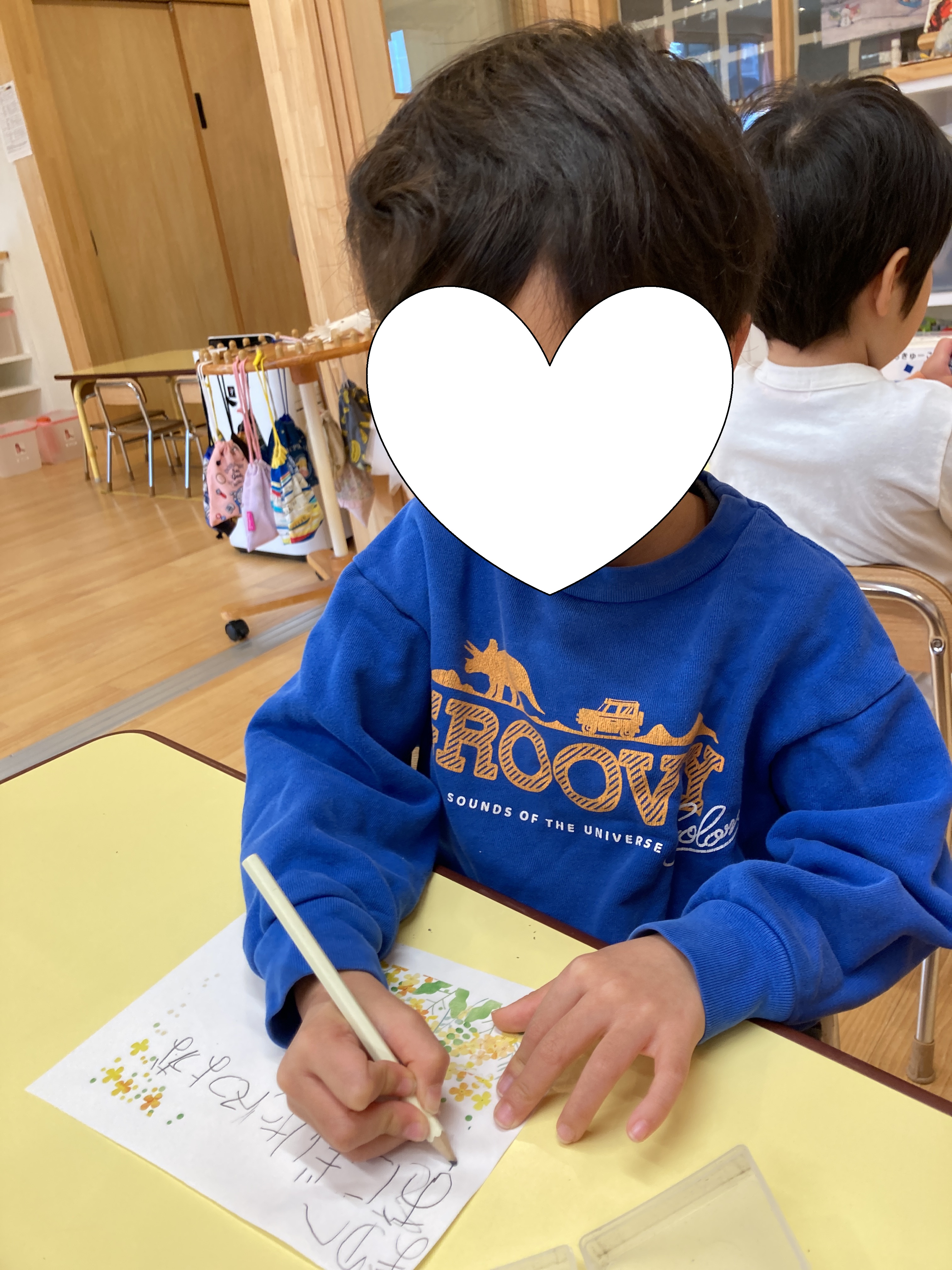 わかば組さんは保育者が書いた文字をなぞってみたり、一緒に書いてみたりしてまゆへのお手紙を書くことを頑張っています!