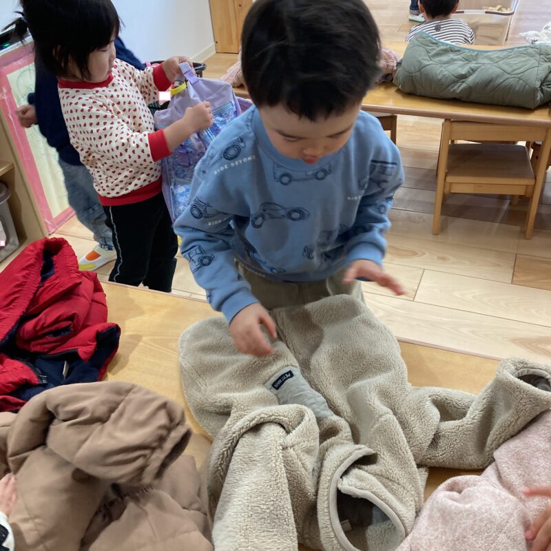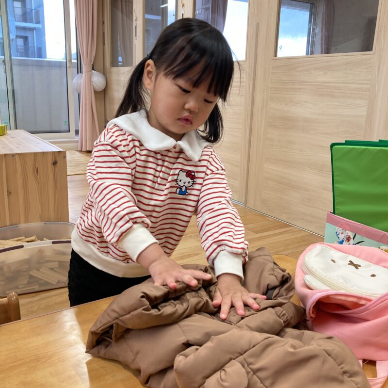 脱いだ後は、上着を広げて丁寧に畳もうとする姿もあり、少しずつ身の回りのことを自分でやろうとする気持ちが育ってきていることを感じました![]()