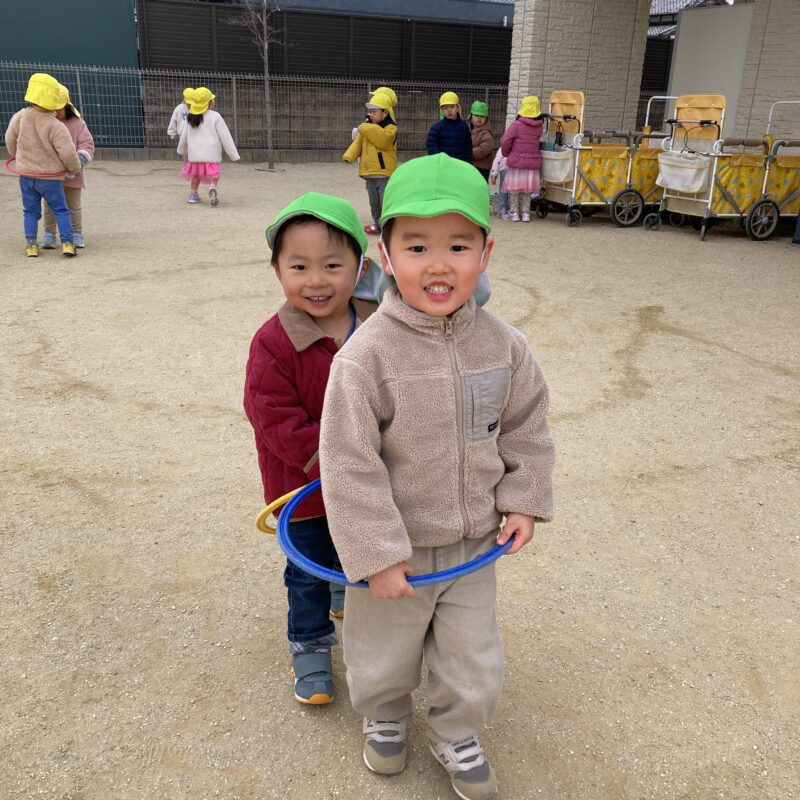 フラフープでは電車ごっこが始まり、「出発しまーす!」と声を掛け合いながら、友だちとつながって園庭をぐるり🚃