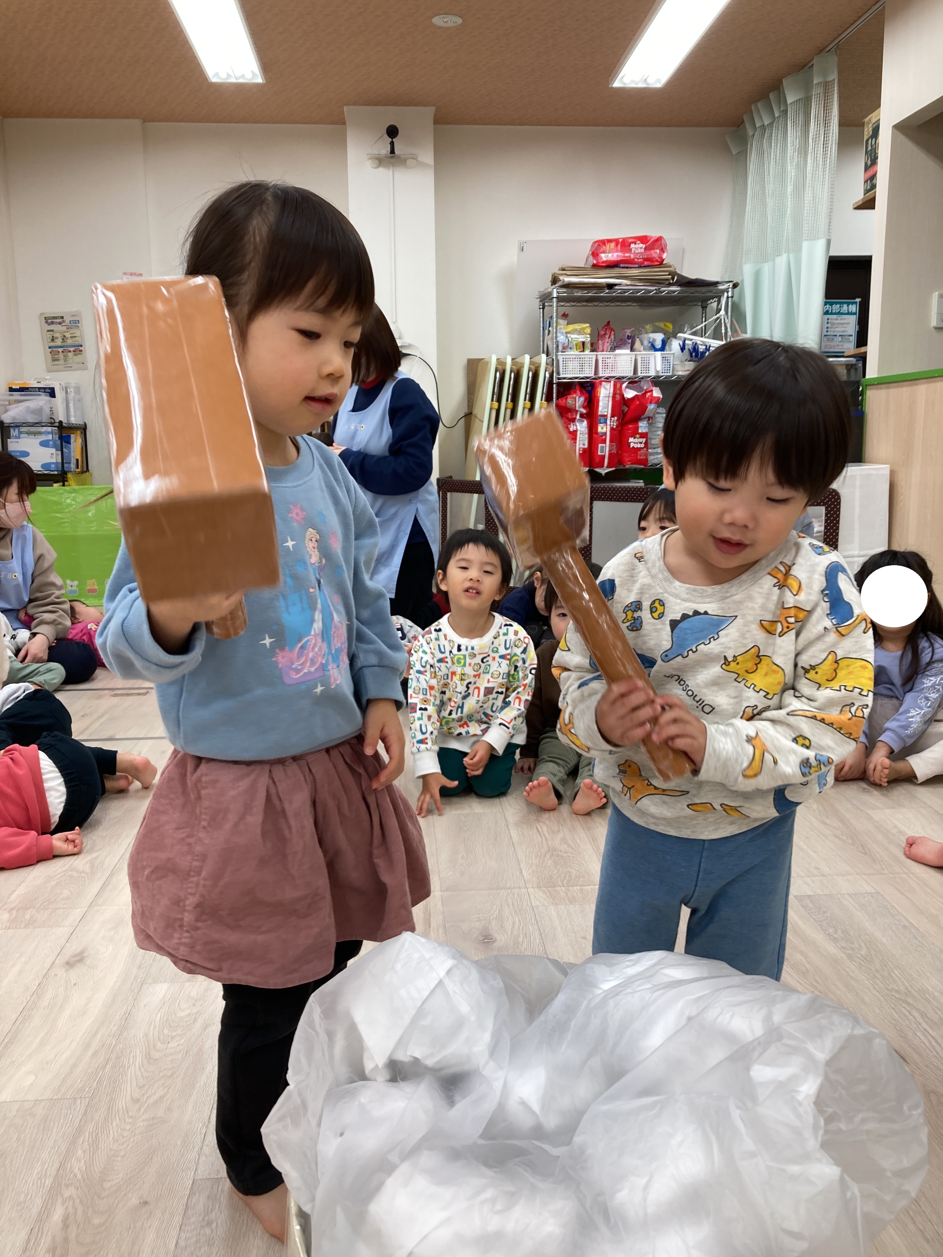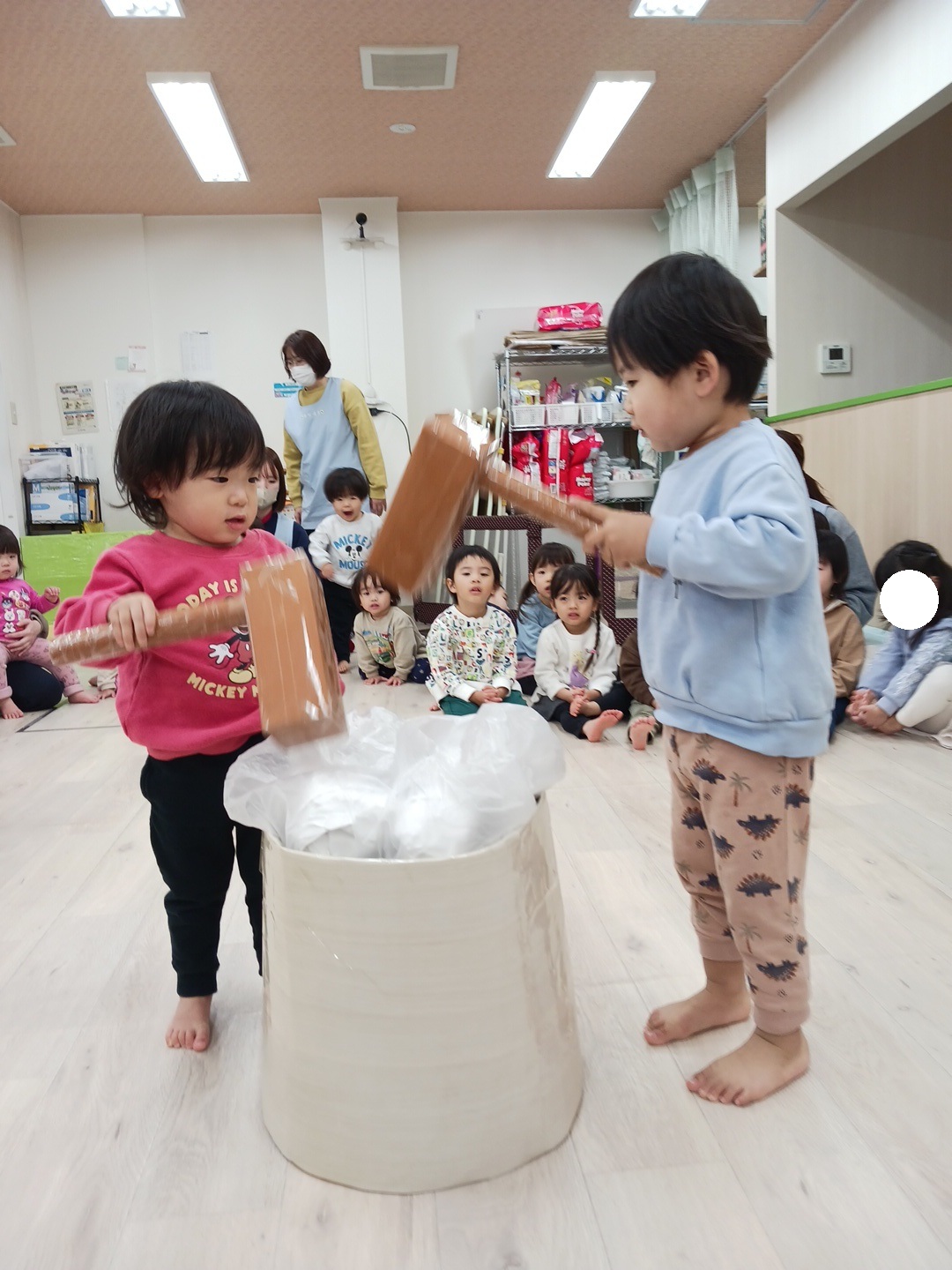 上手に杵を持って保育士のかけ声に合わせてついていましたよ![]()