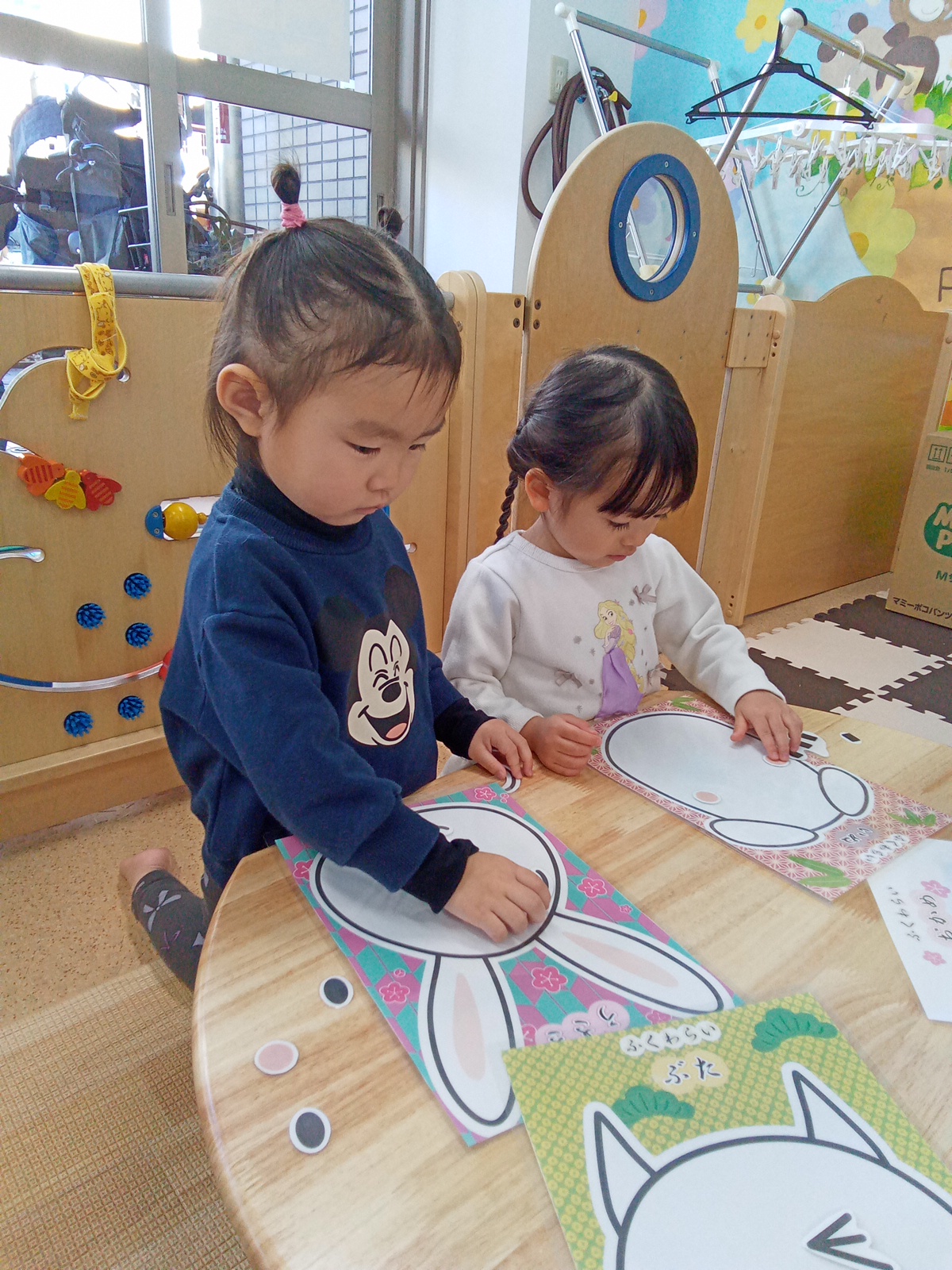 コマ回し、かるた、だるま落とし、福笑い 羽子板の5つのコーナーがありました![]()