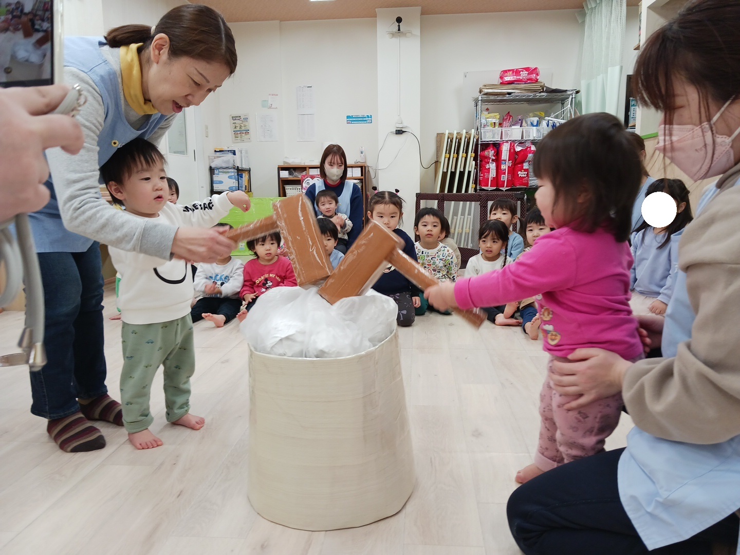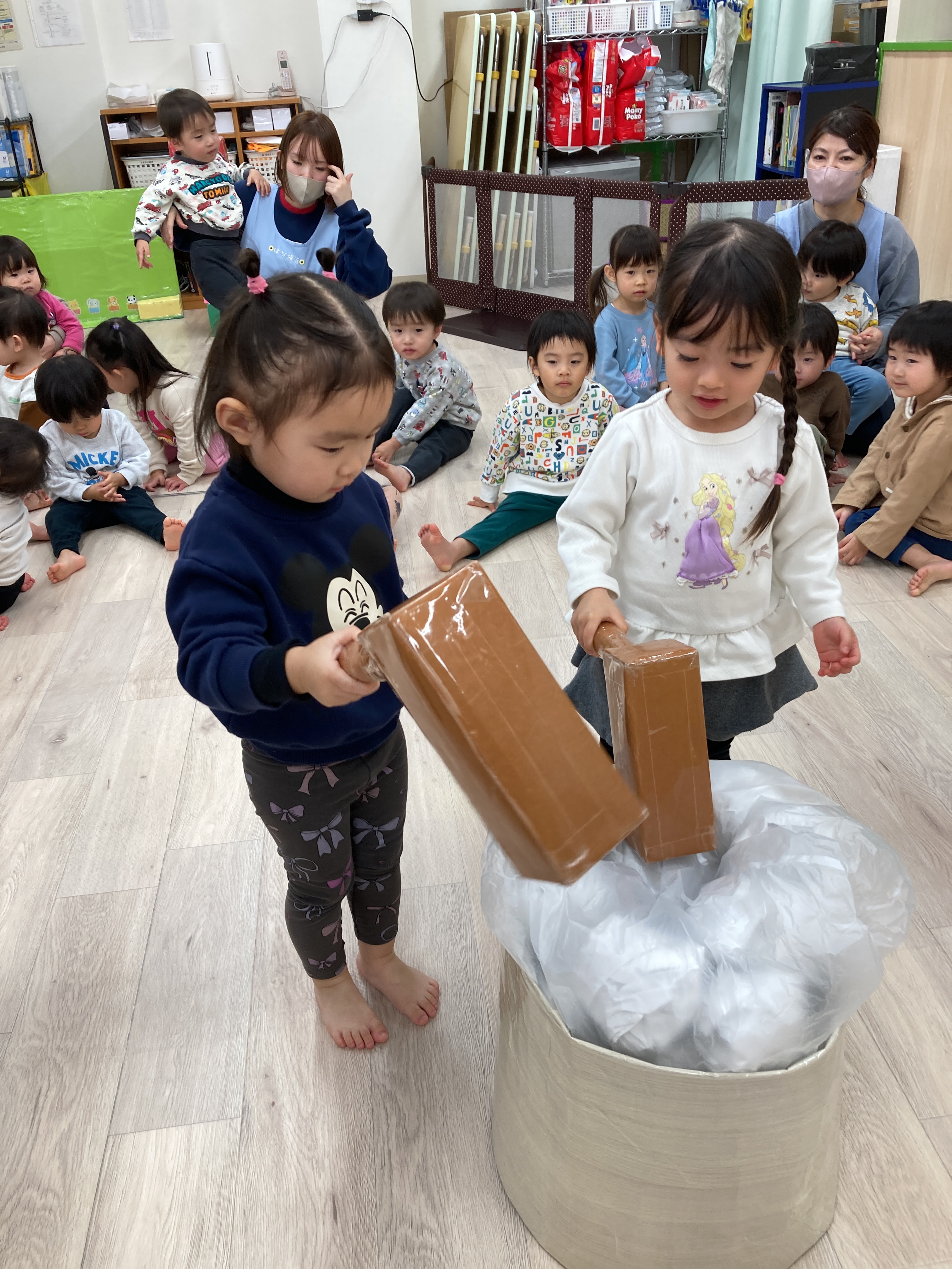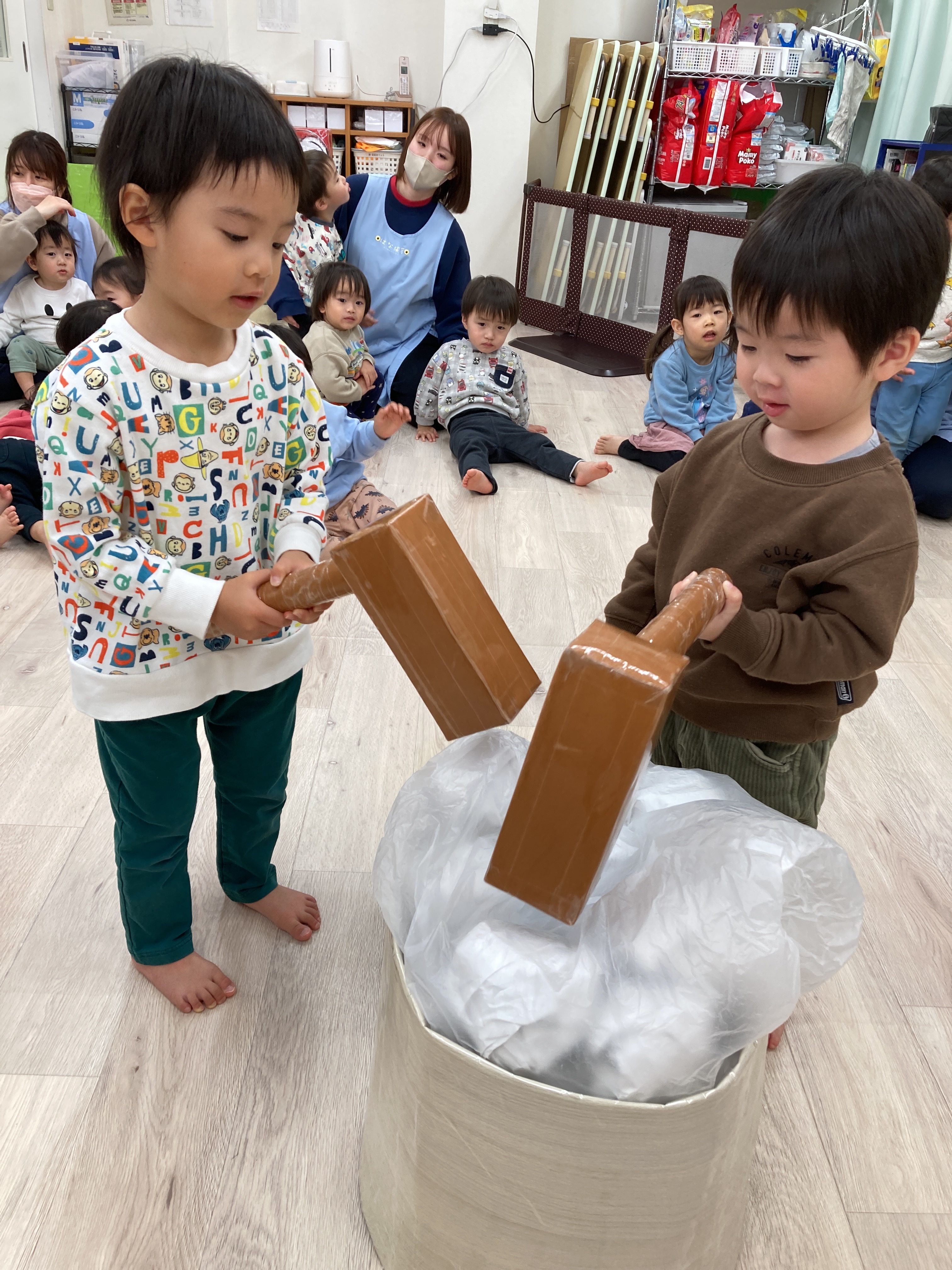 上手に杵を持って保育士のかけ声に合わせてついていましたよ![]()