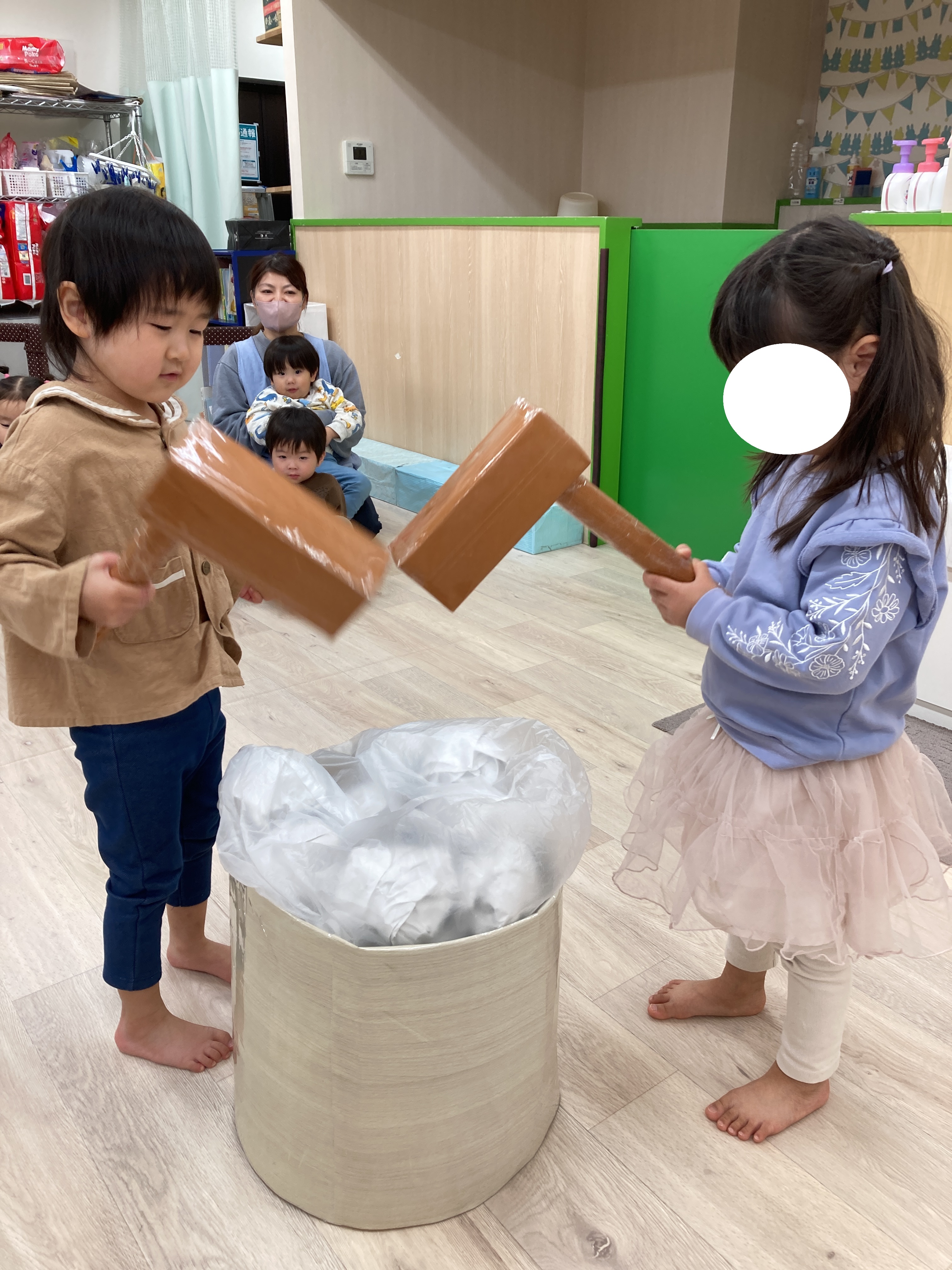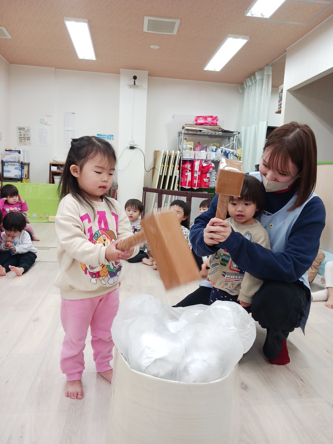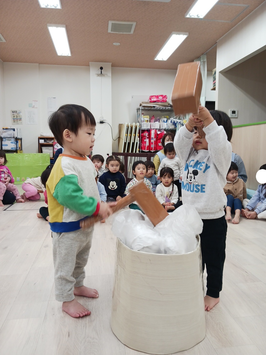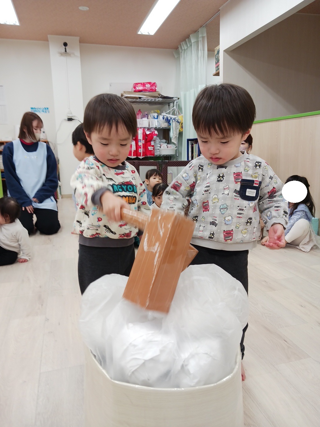 上手に杵を持って保育士のかけ声に合わせてついていましたよ![]()