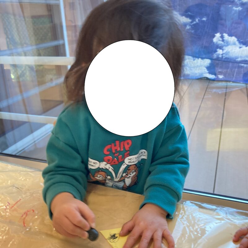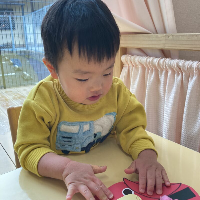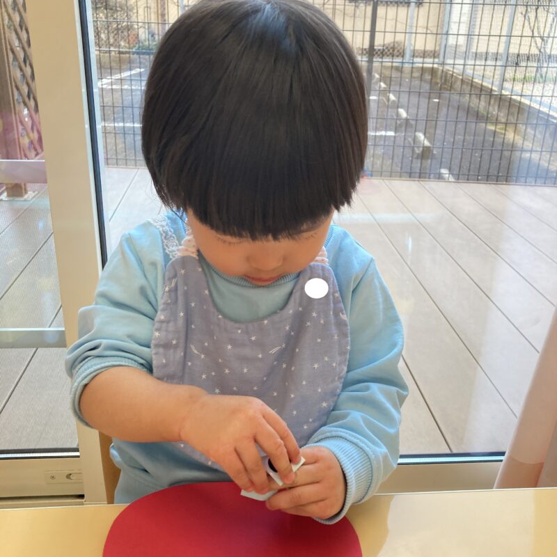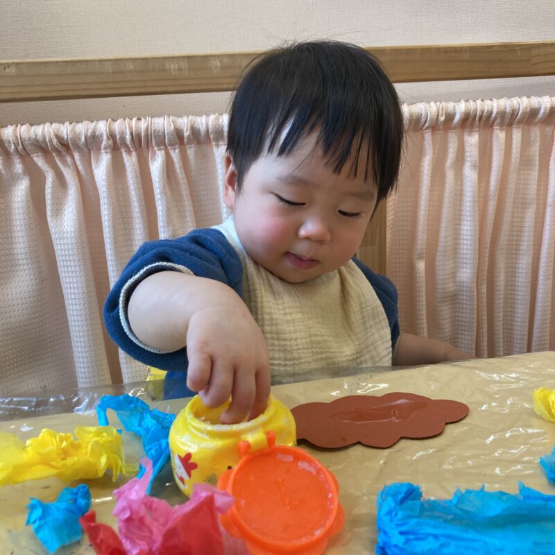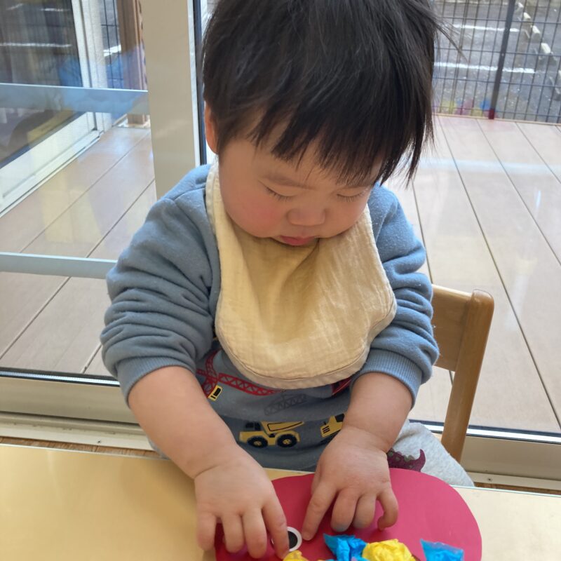ベタベタの感触が苦手だった様子の子もいましたが、保育者と一緒にのりを塗ってペタッと貼ることができました