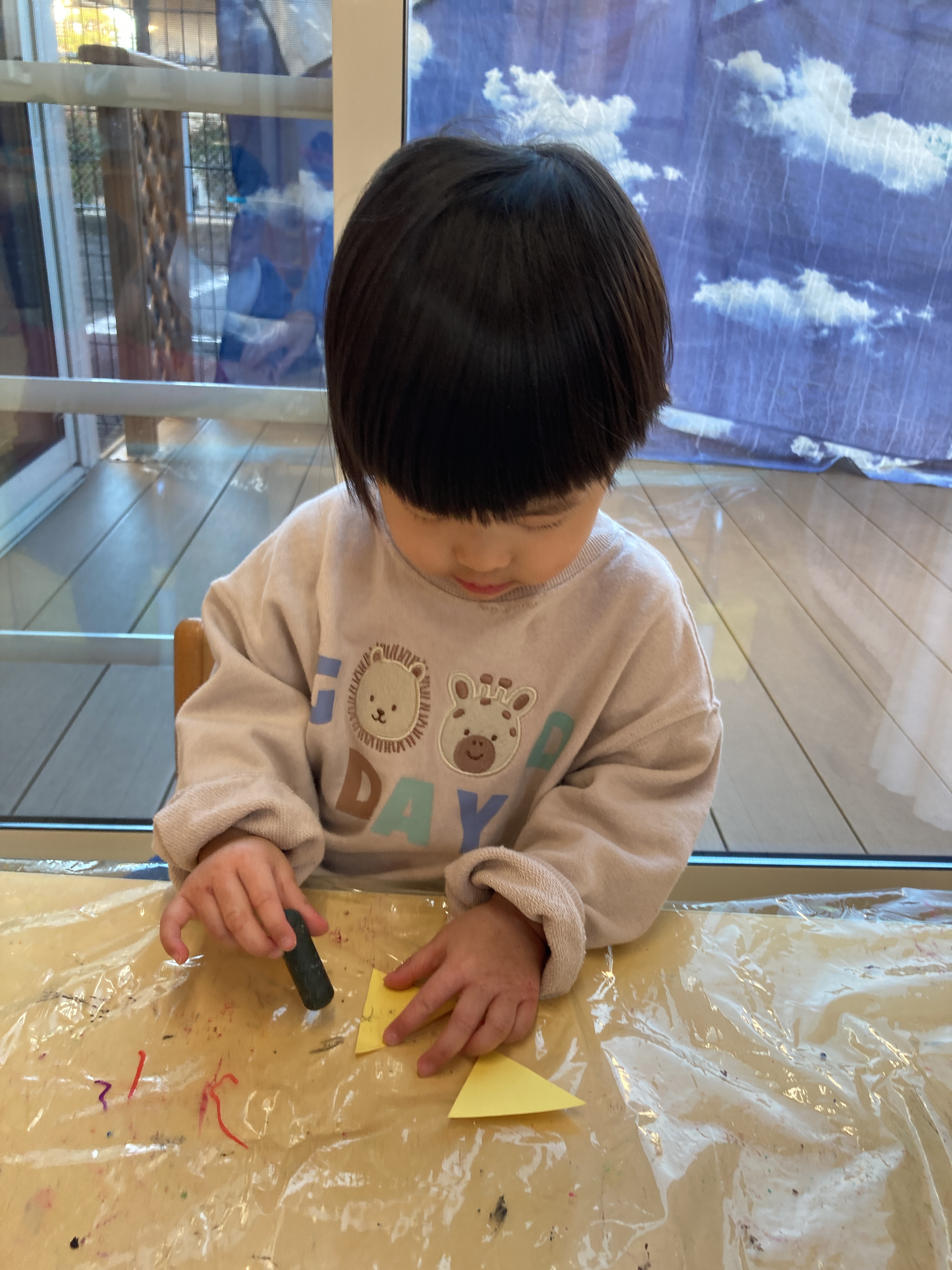 初めに鬼の角に黒いクレヨンで模様を付けました🖍